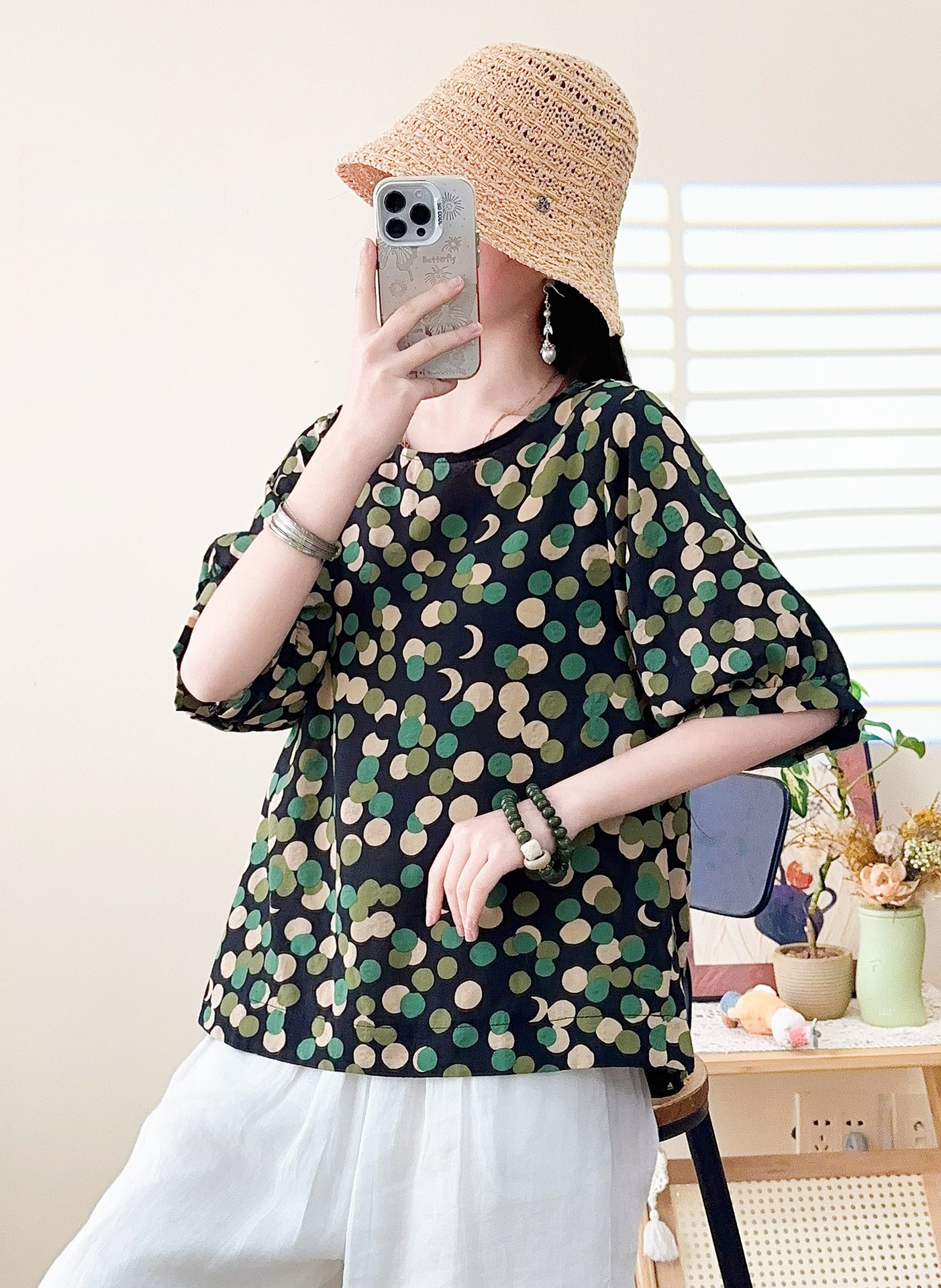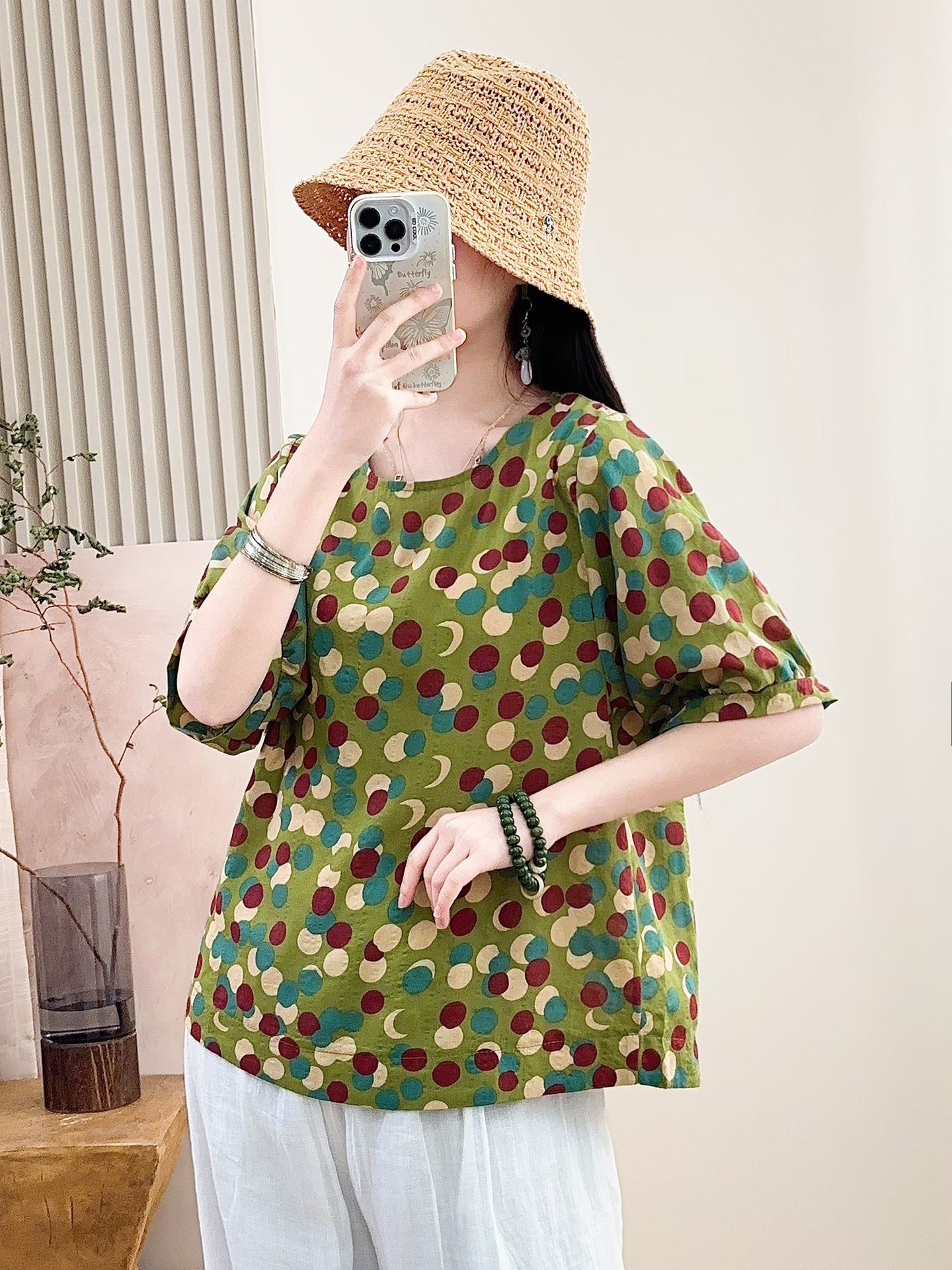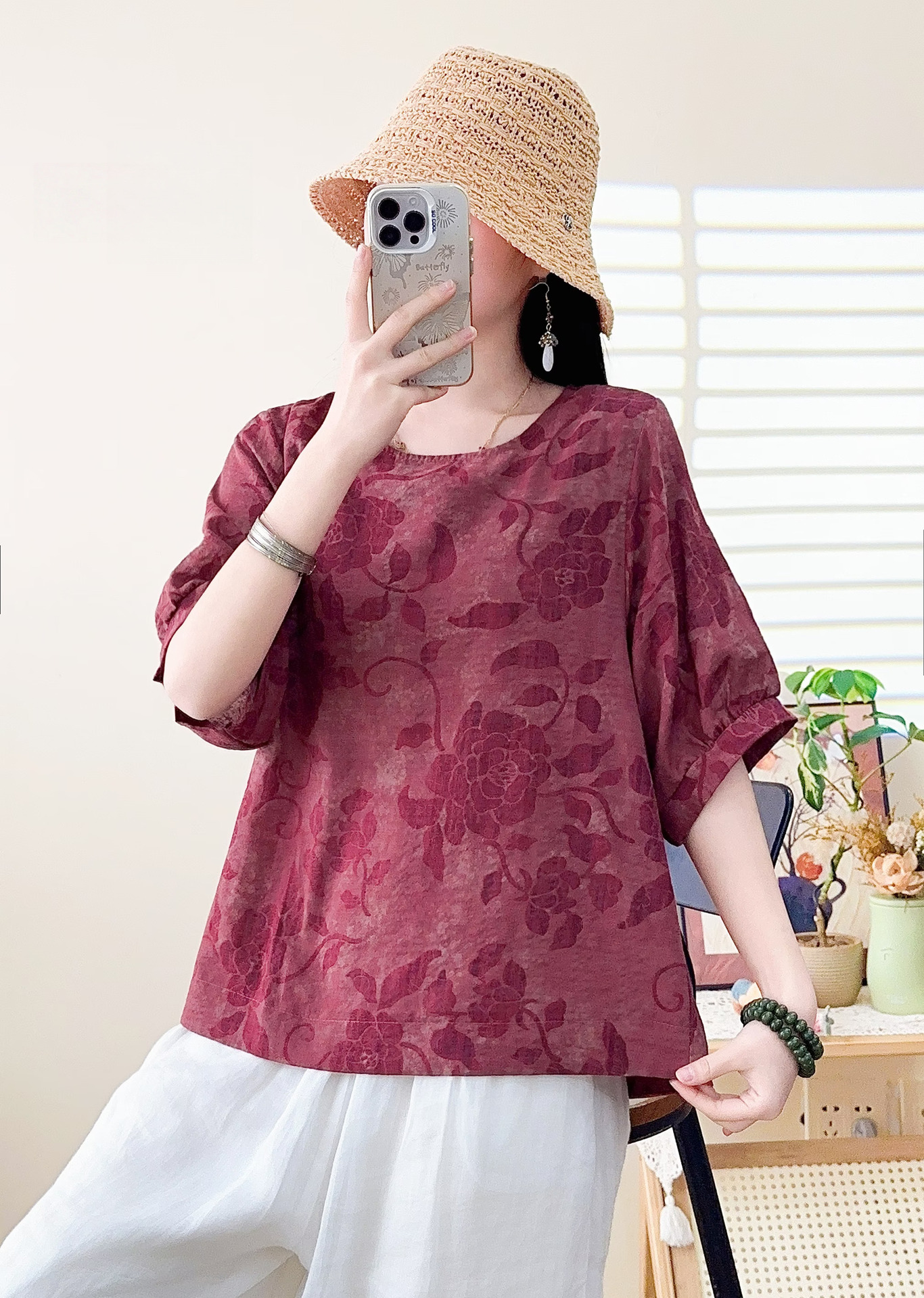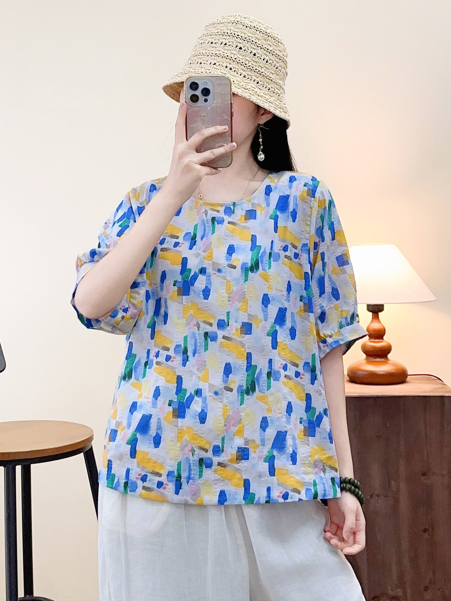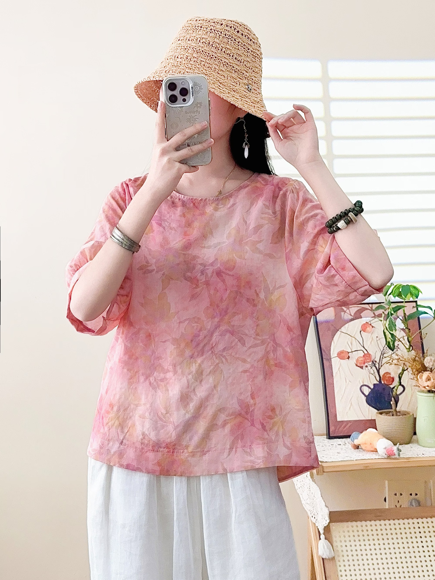 2025夏季新款复古民族风天丝麻短袖T桖圆领印花宽松大码女上衣 RMB:25.00