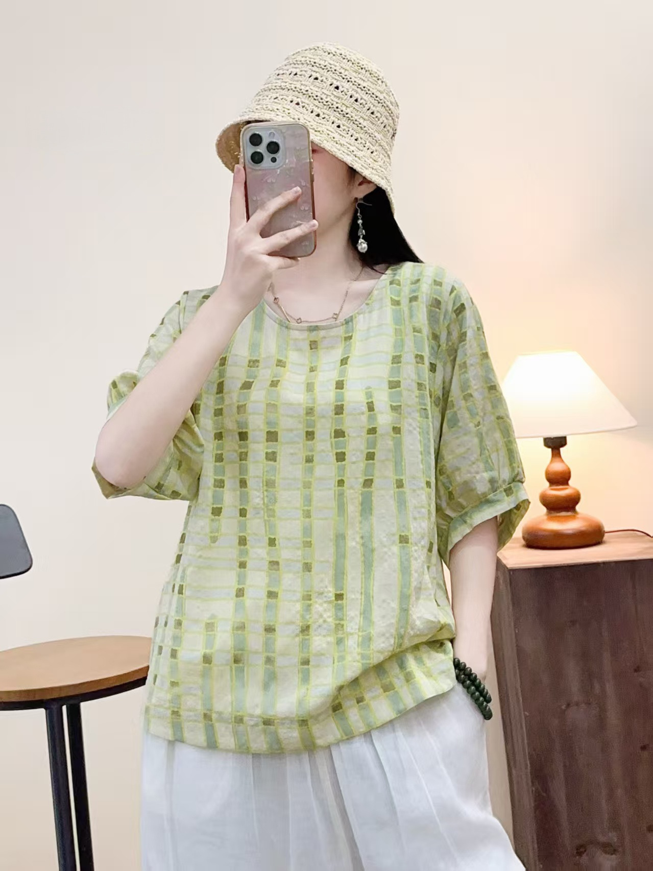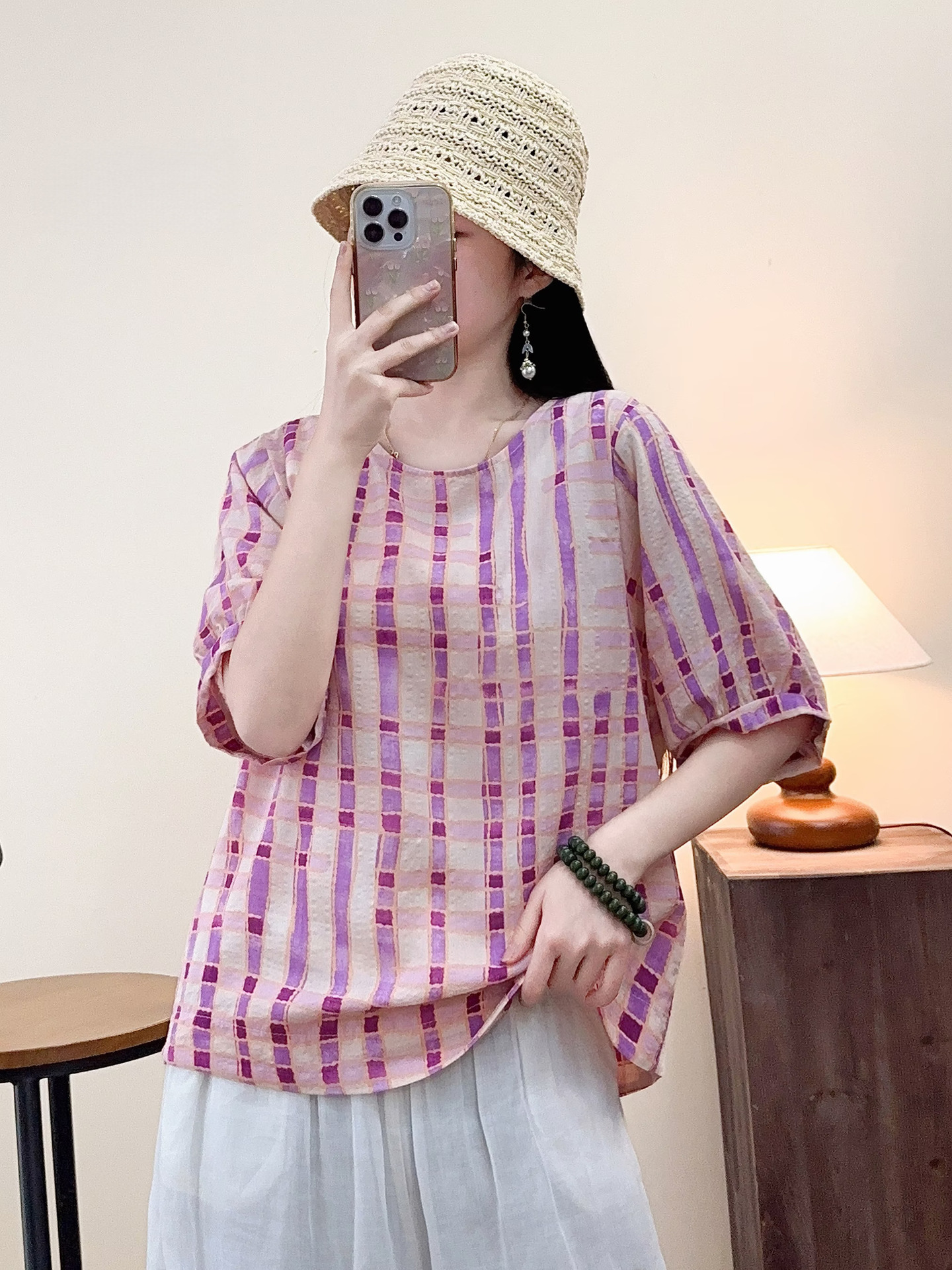 文艺复古丝麻小褶皱2026夏季新款圆领女士小衫简约宽松套头女上衣 RMB:24.00