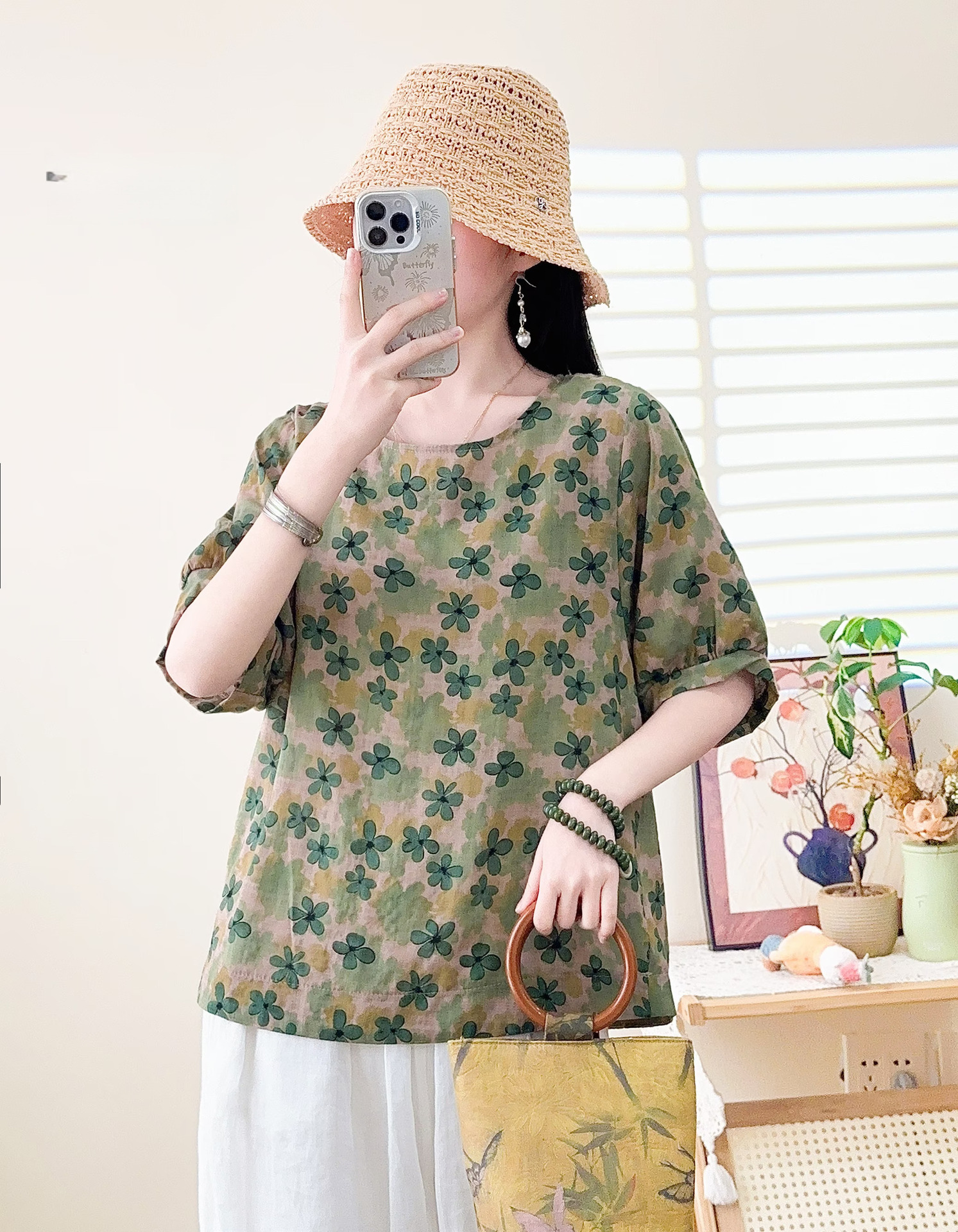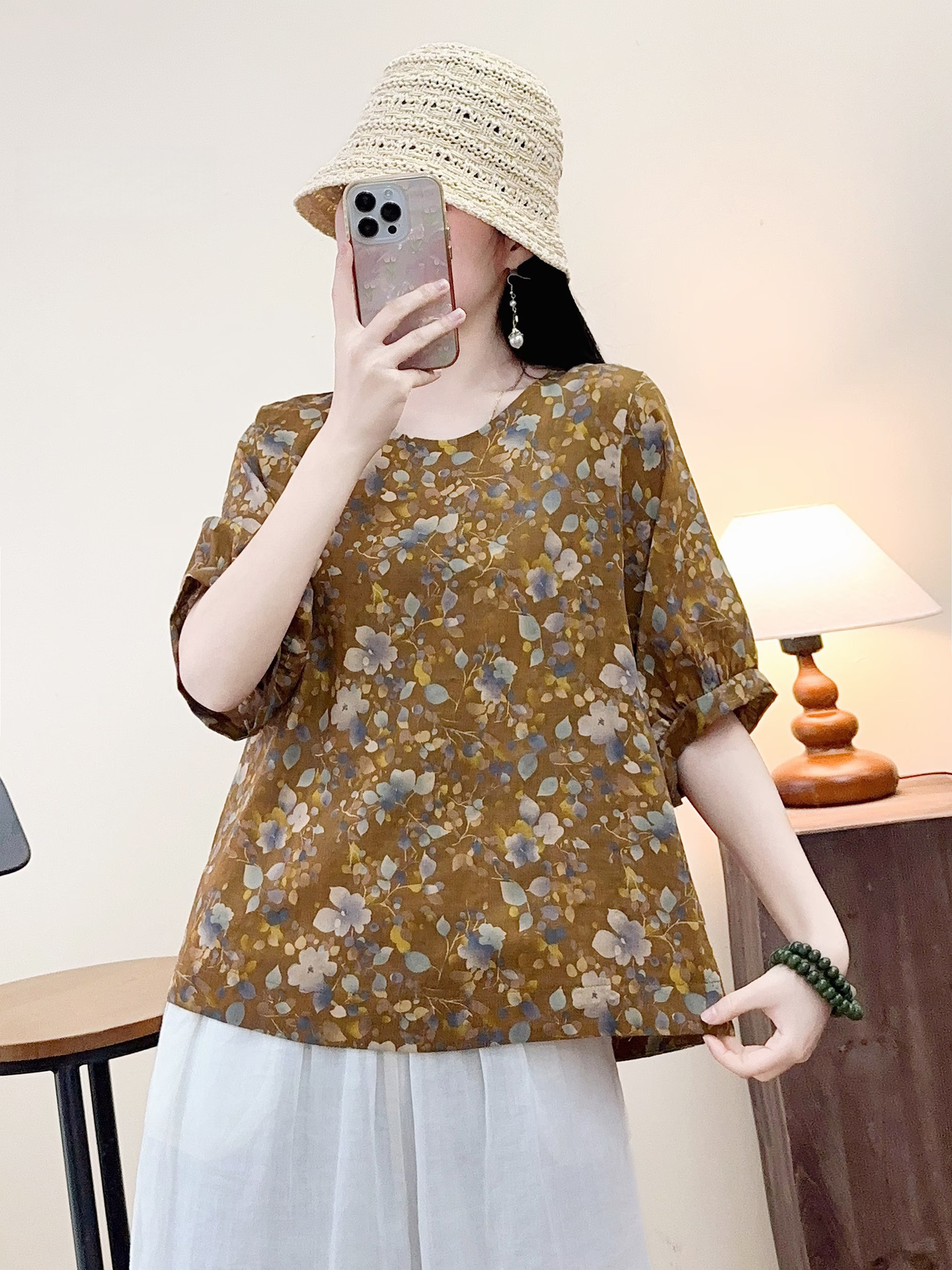 2026년 여름 신상 여성용 면마 상의, 레트로 프린트 면마 셔츠, 꽃무늬 라지 사이즈 루즈핏 엄마 티셔츠