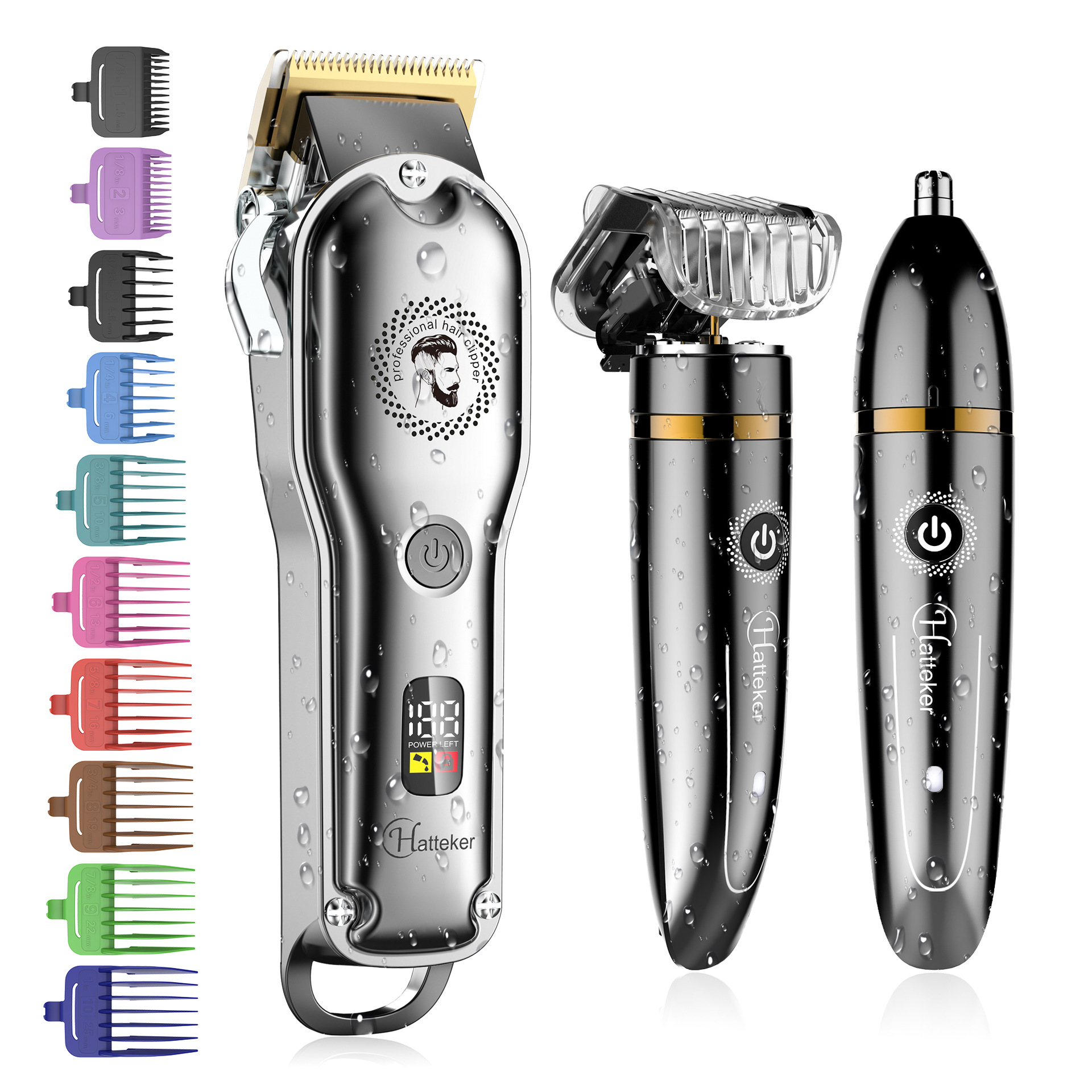국경 간 핫 세일 헤어 클리퍼 세트 스마트 LCD 디지털 디스플레이 전기 헤어 클리퍼 코 헤어 리무버 오일 헤드 가위 3 피스 세트 도매