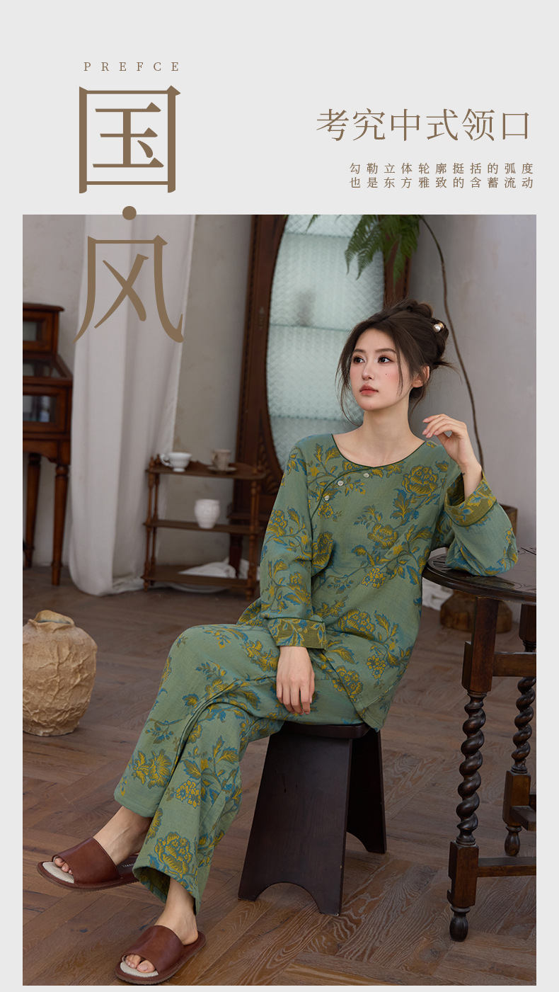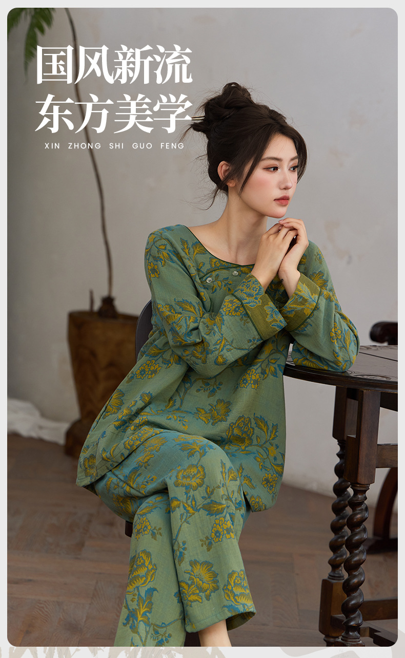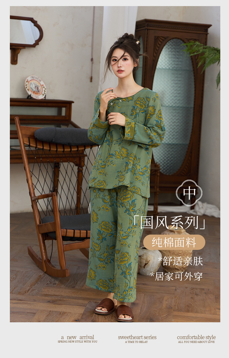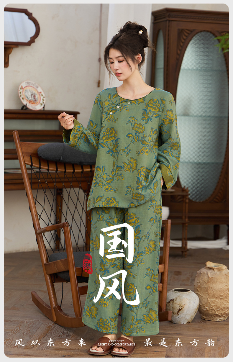 신중국풍 국색 자수 원단 잠옷 여성용 봄 가을 얇은 9부 소매 단추 장식 외출복 겸용 홈웨어스토어 가기