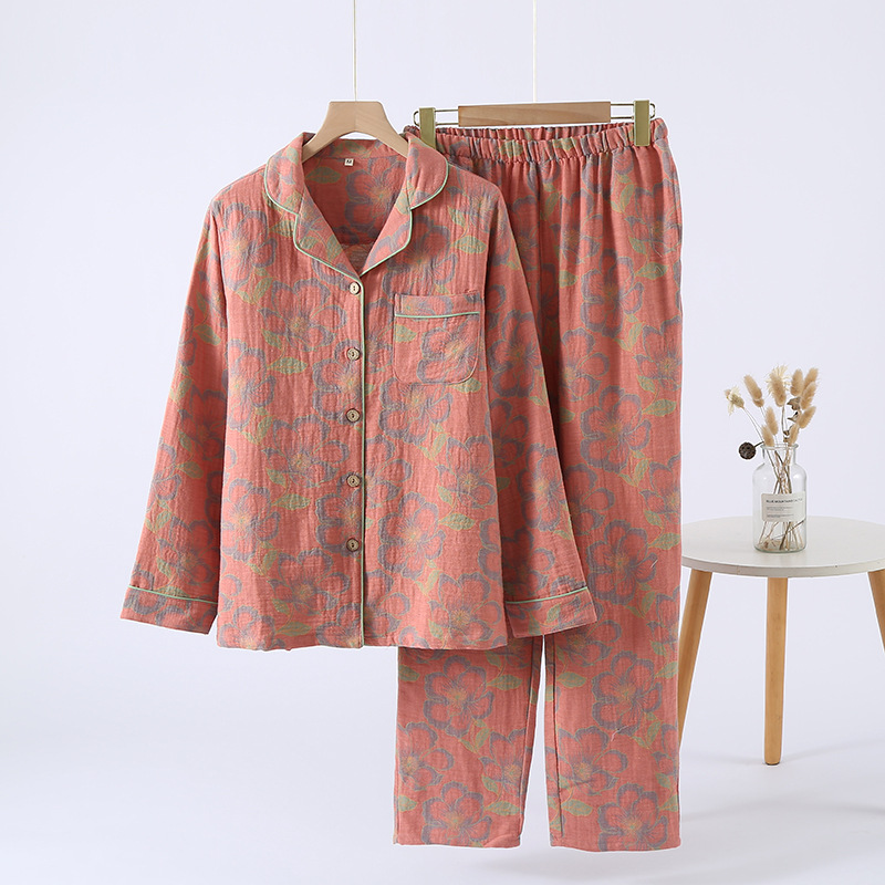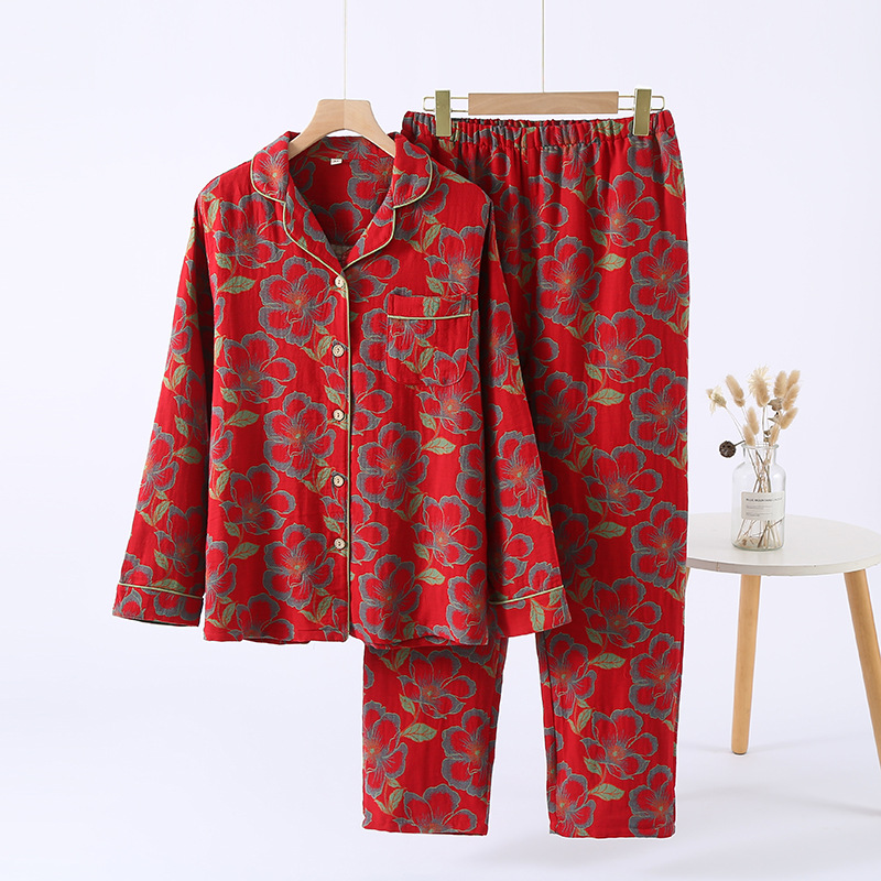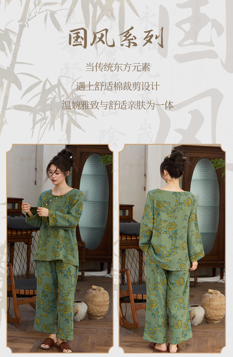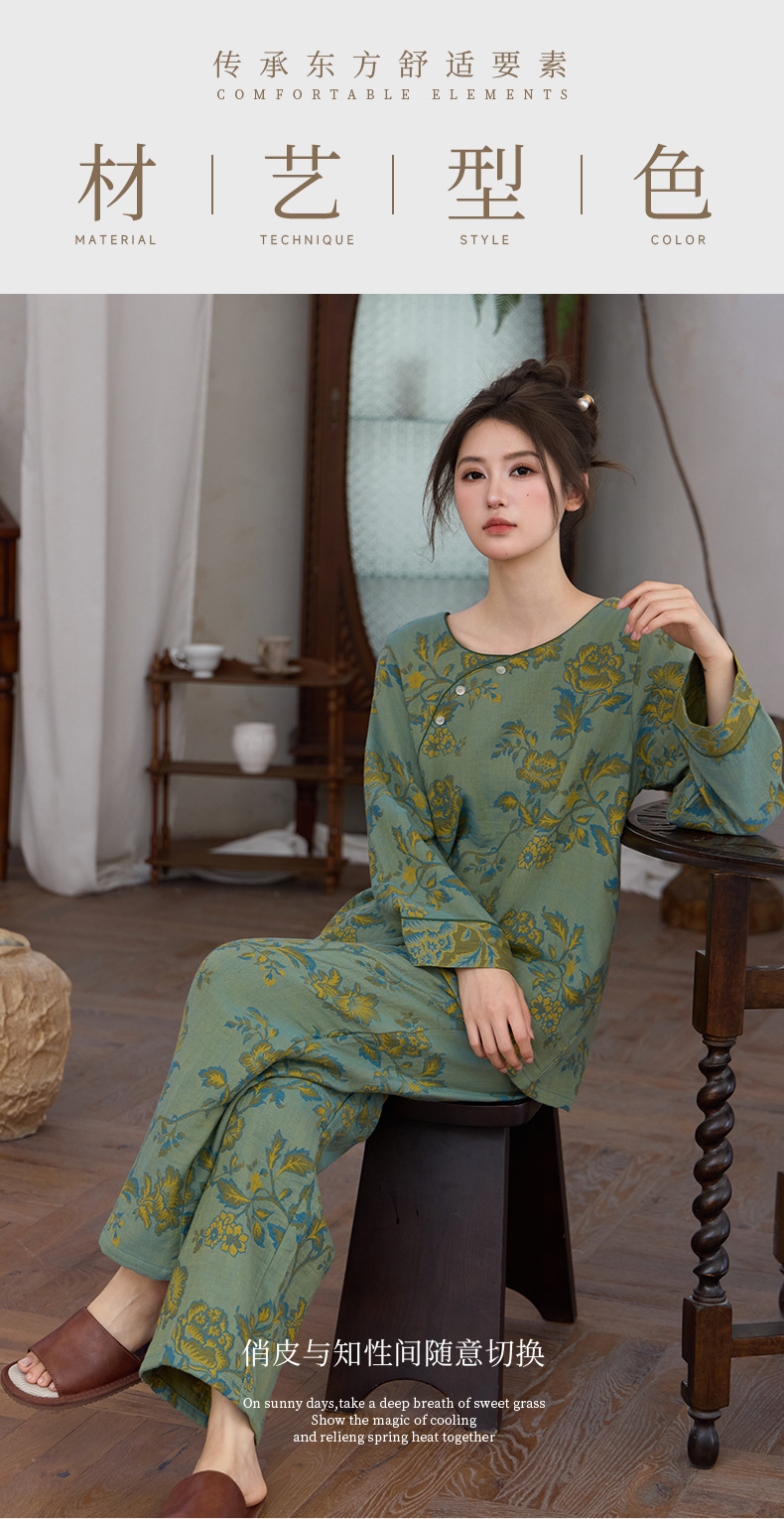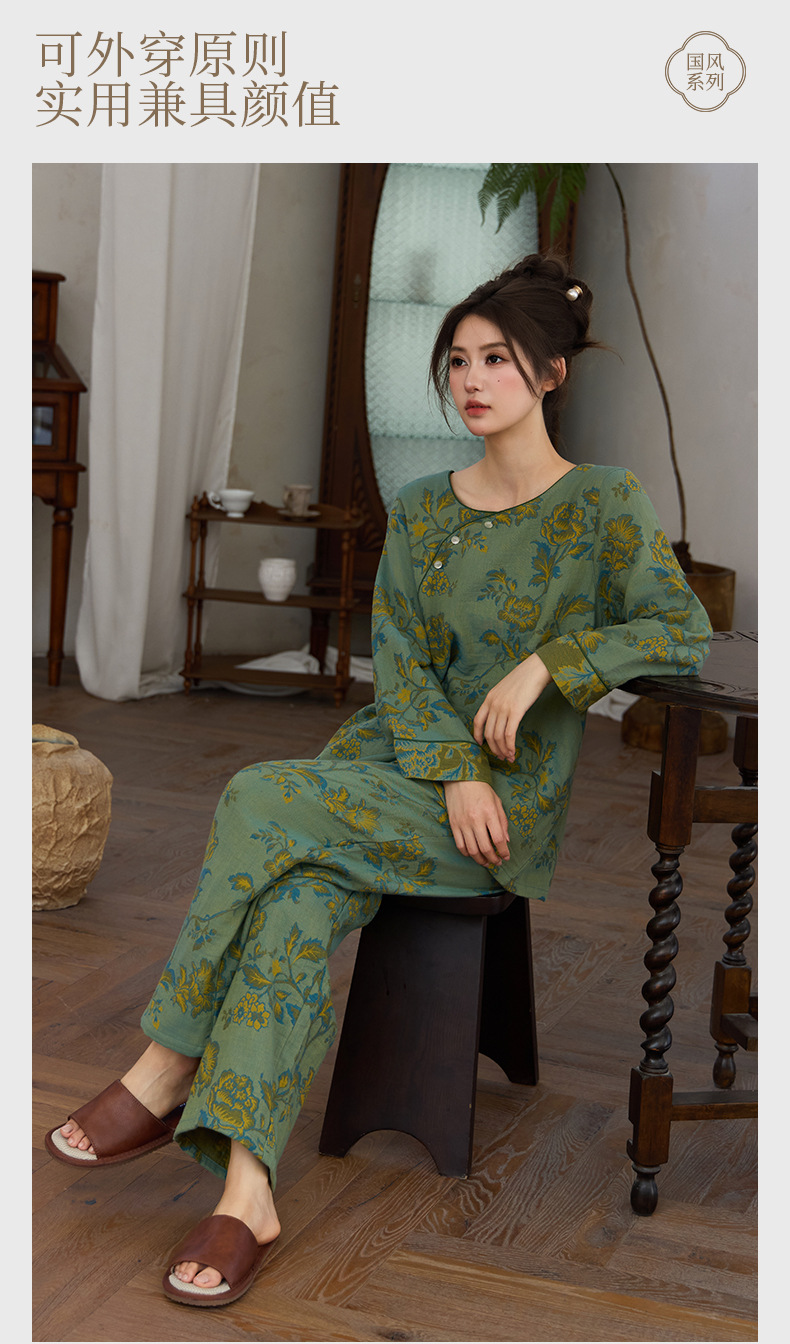 신중국풍 국색 자수 원단 잠옷 여성용 봄 가을 얇은 9부 소매 단추 장식 외출복 겸용 홈웨어스토어 가기