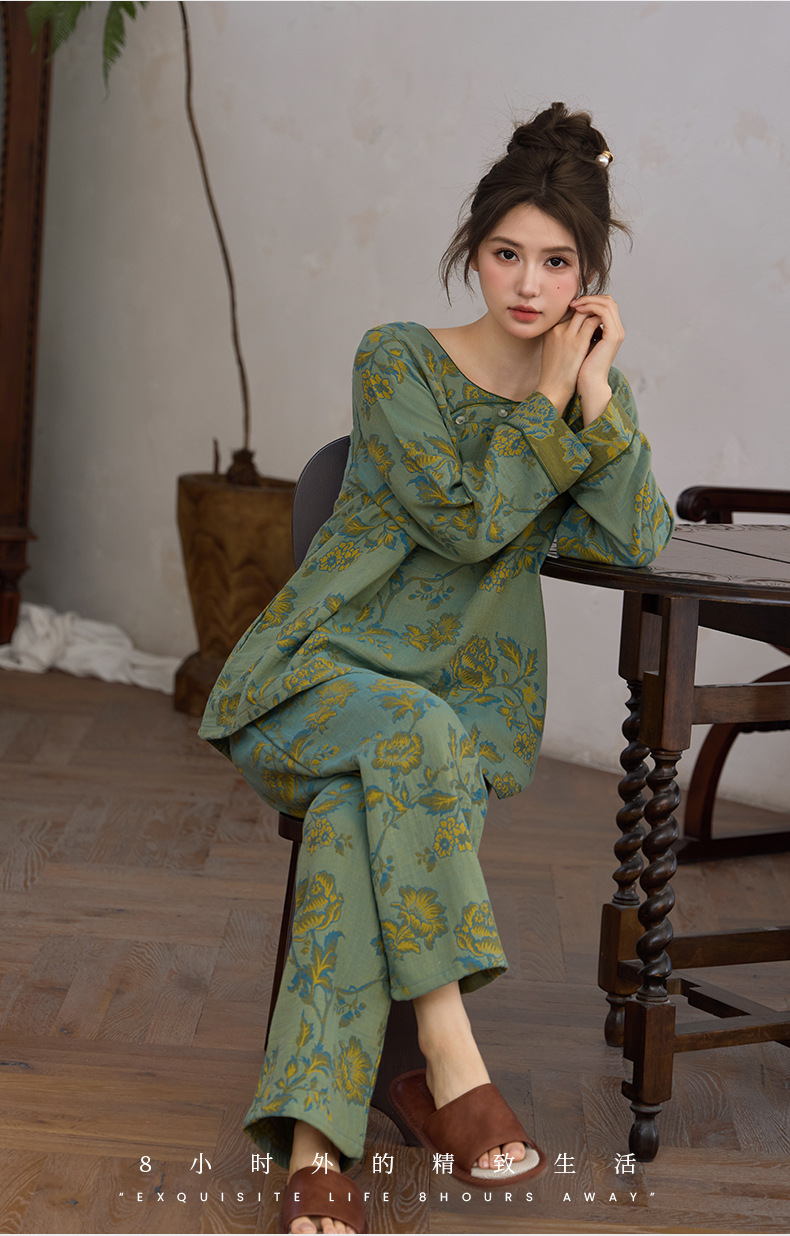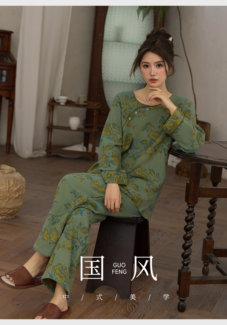 신중국풍 국색 자수 원단 잠옷 여성용 봄 가을 얇은 9부 소매 단추 장식 외출복 겸용 홈웨어