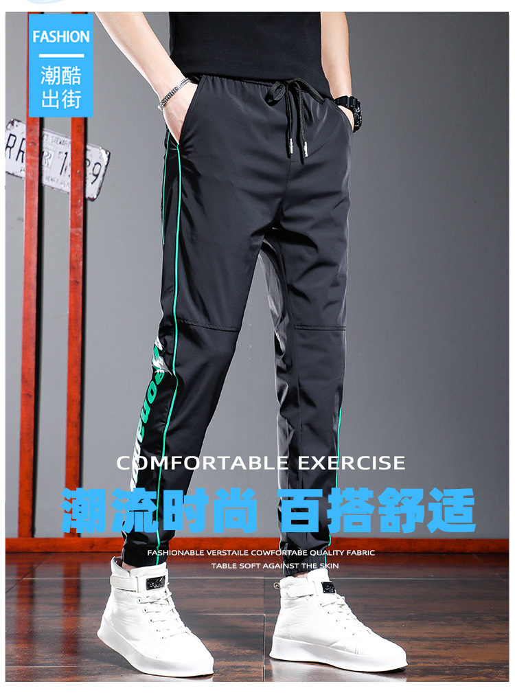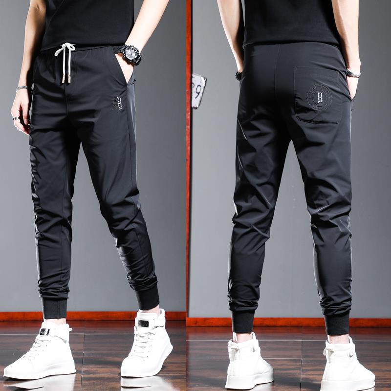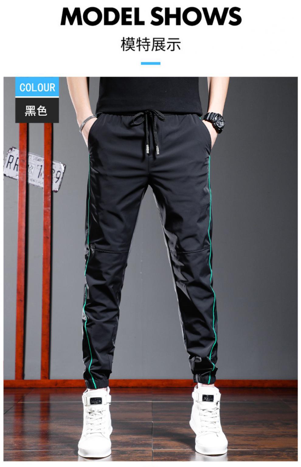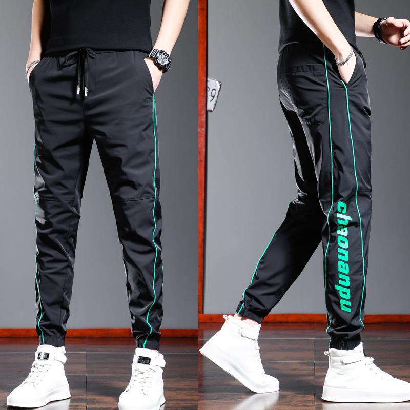 여름 얇은 아이스 실크 캐주얼 바지 남성용 빠른 건조 바지 줄무늬 문자 인쇄 블랙 스포츠 스트레치 발목 묶인 바지 바지 바지스토어 가기