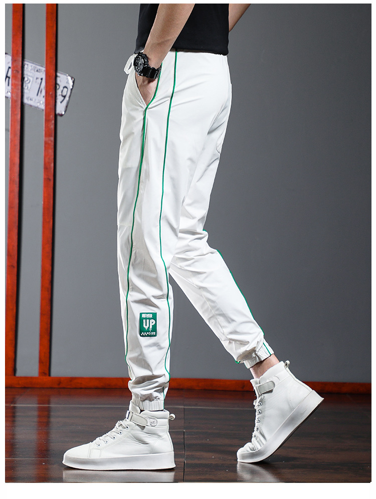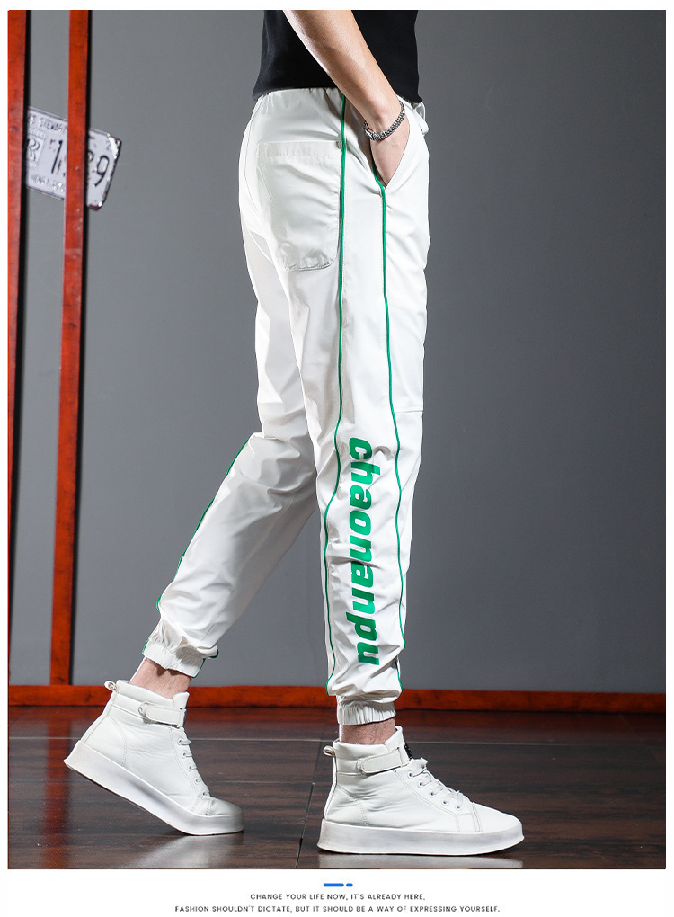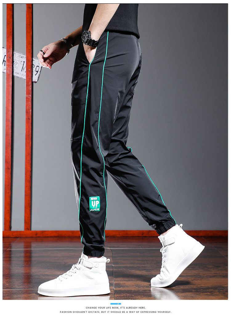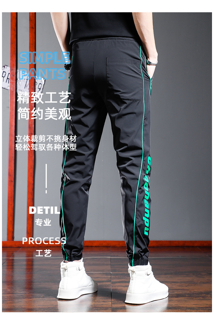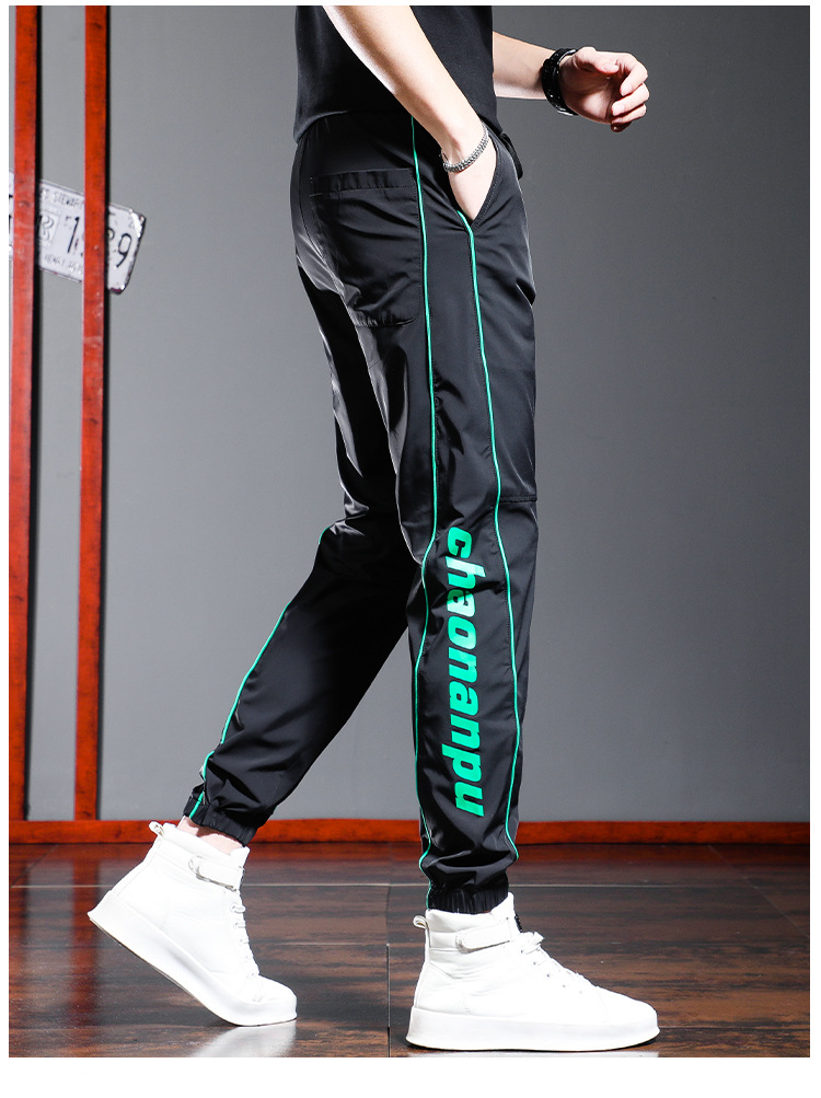 여름 얇은 아이스 실크 캐주얼 바지 남성용 빠른 건조 바지 줄무늬 문자 인쇄 블랙 스포츠 스트레치 발목 묶인 바지 바지 바지