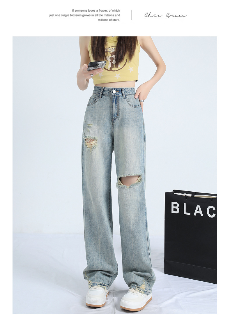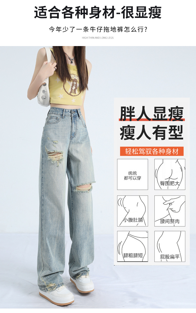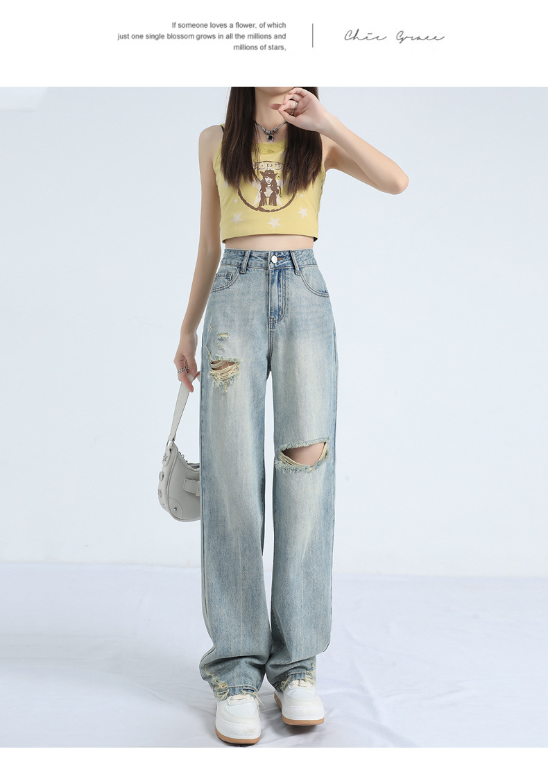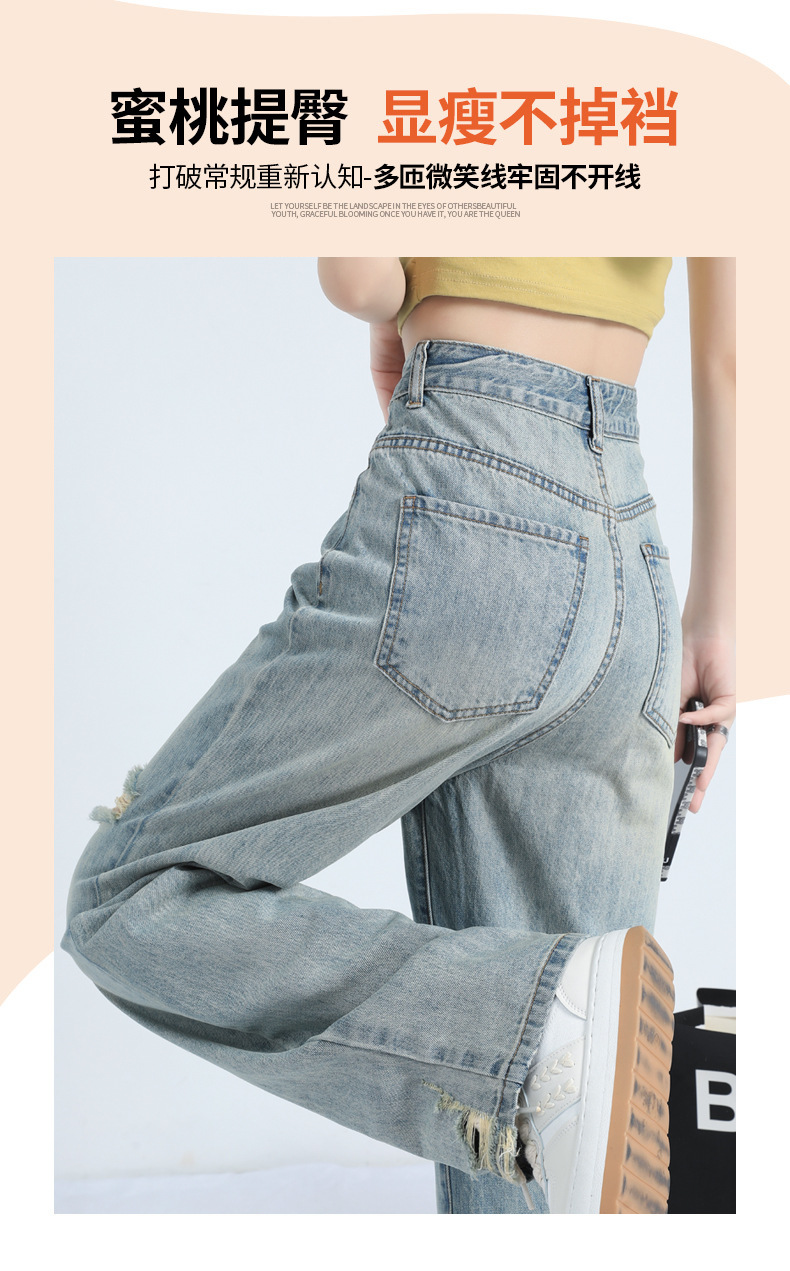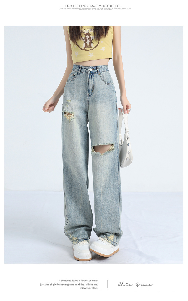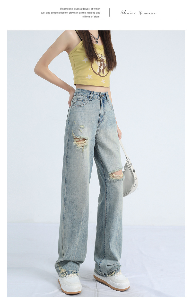 레트로 찢어진 얇은 허리 와이드 레그 청바지 여성의 느슨한 여름 새로운 슬리밍 틈새 디자인스토어 가기
