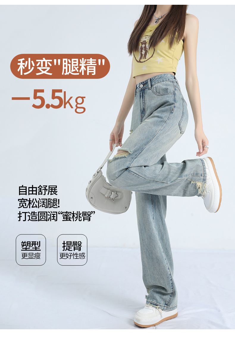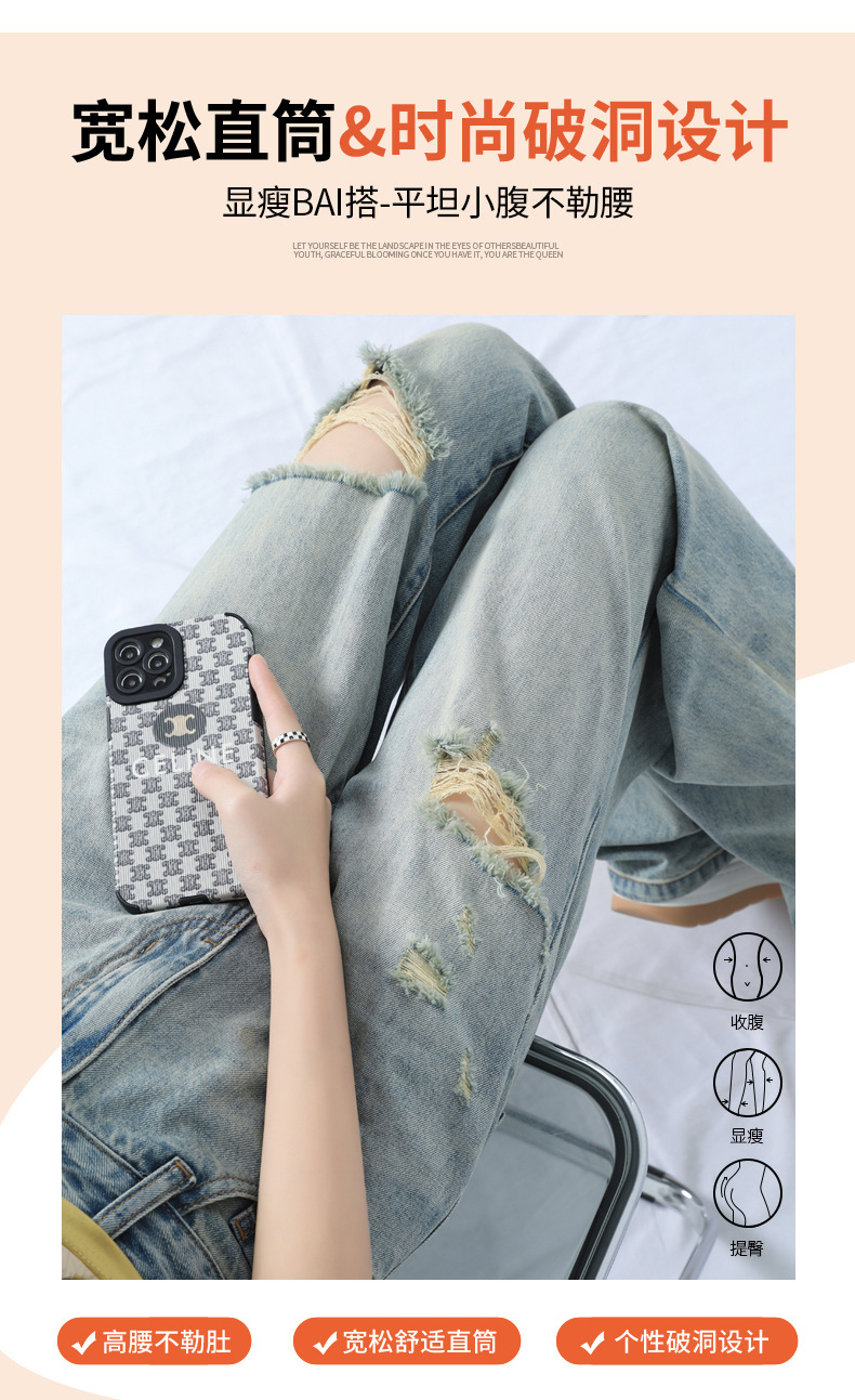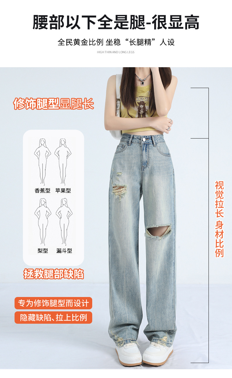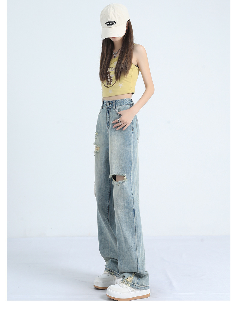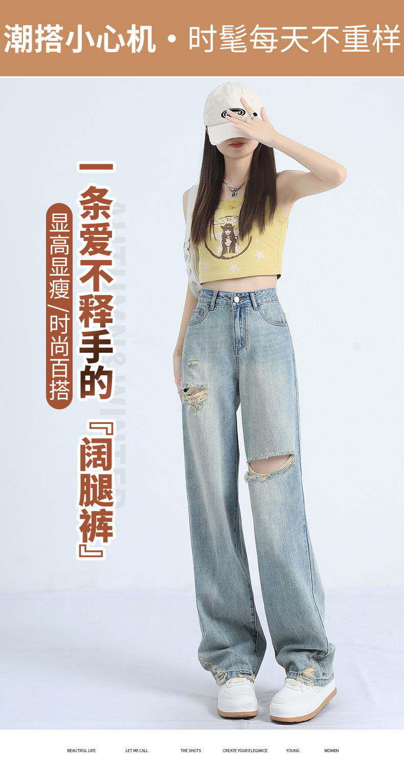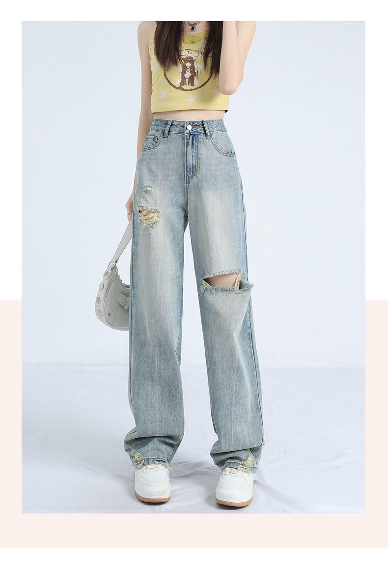 레트로 찢어진 얇은 허리 와이드 레그 청바지 여성의 느슨한 여름 새로운 슬리밍 틈새 디자인스토어 가기