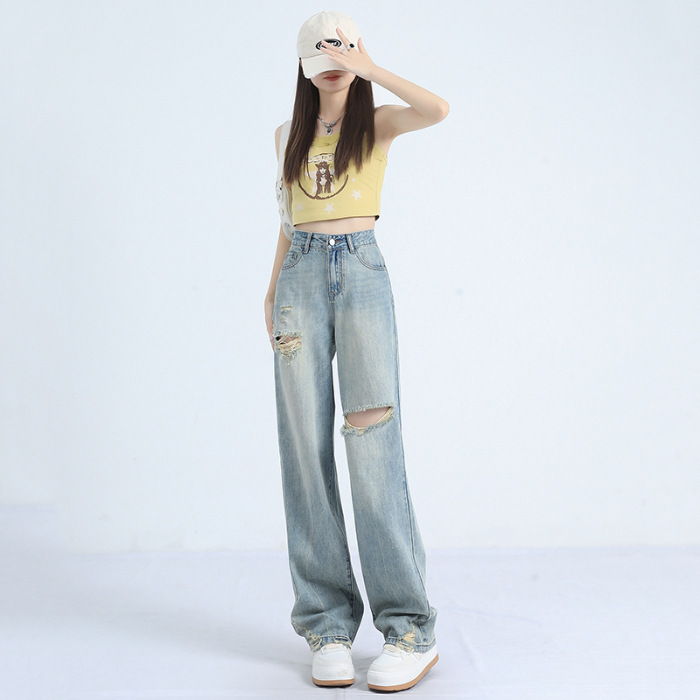 레트로 찢어진 얇은 허리 와이드 레그 청바지 여성의 느슨한 여름 새로운 슬리밍 틈새 디자인