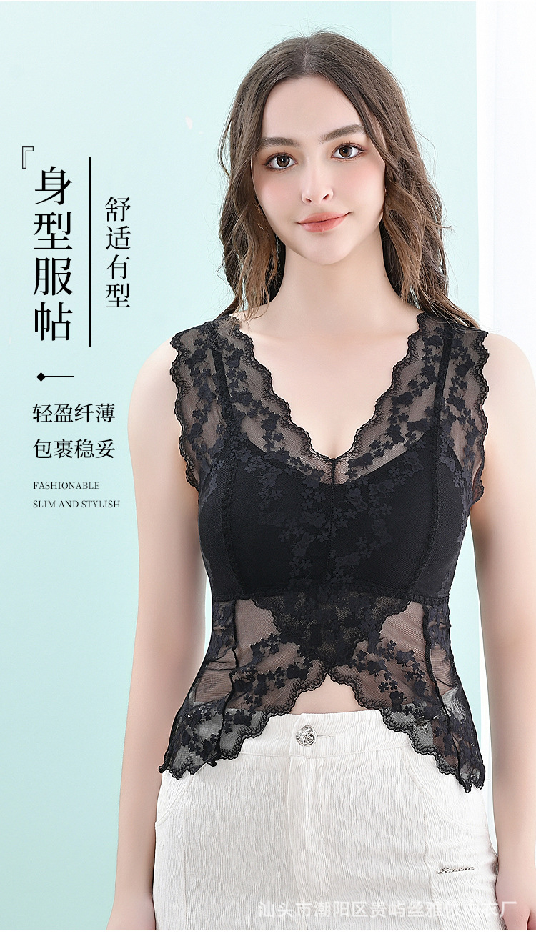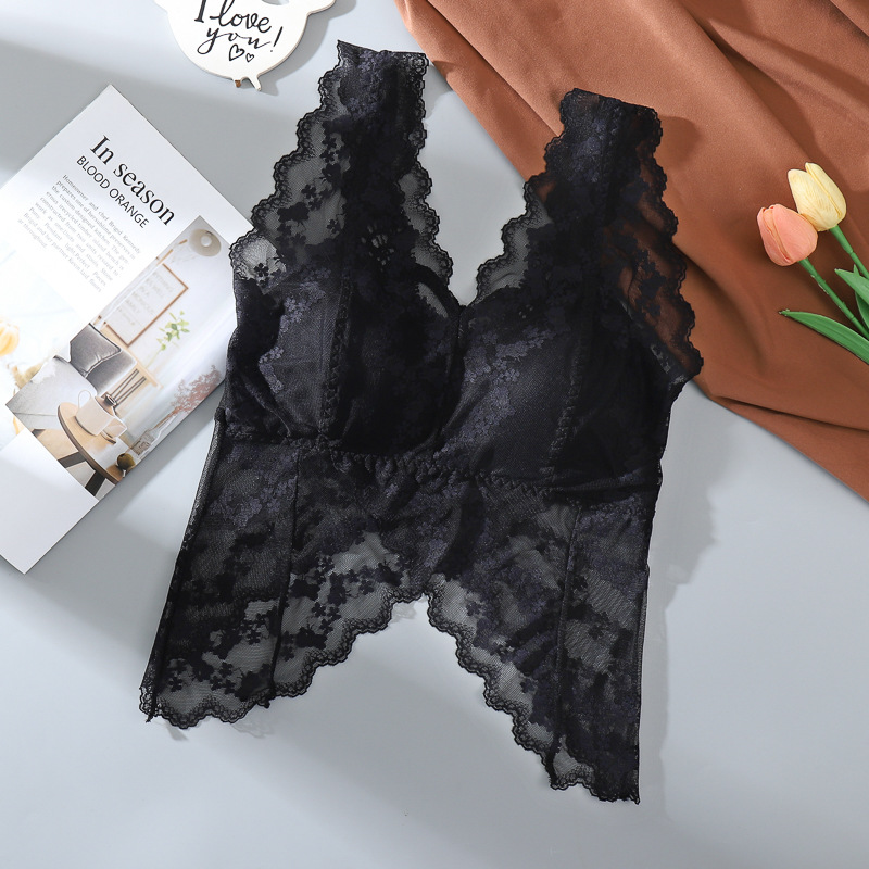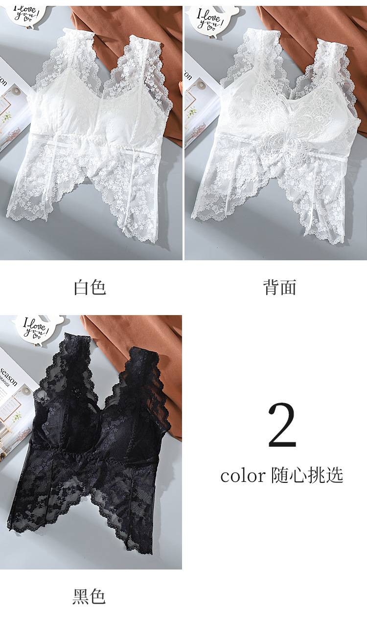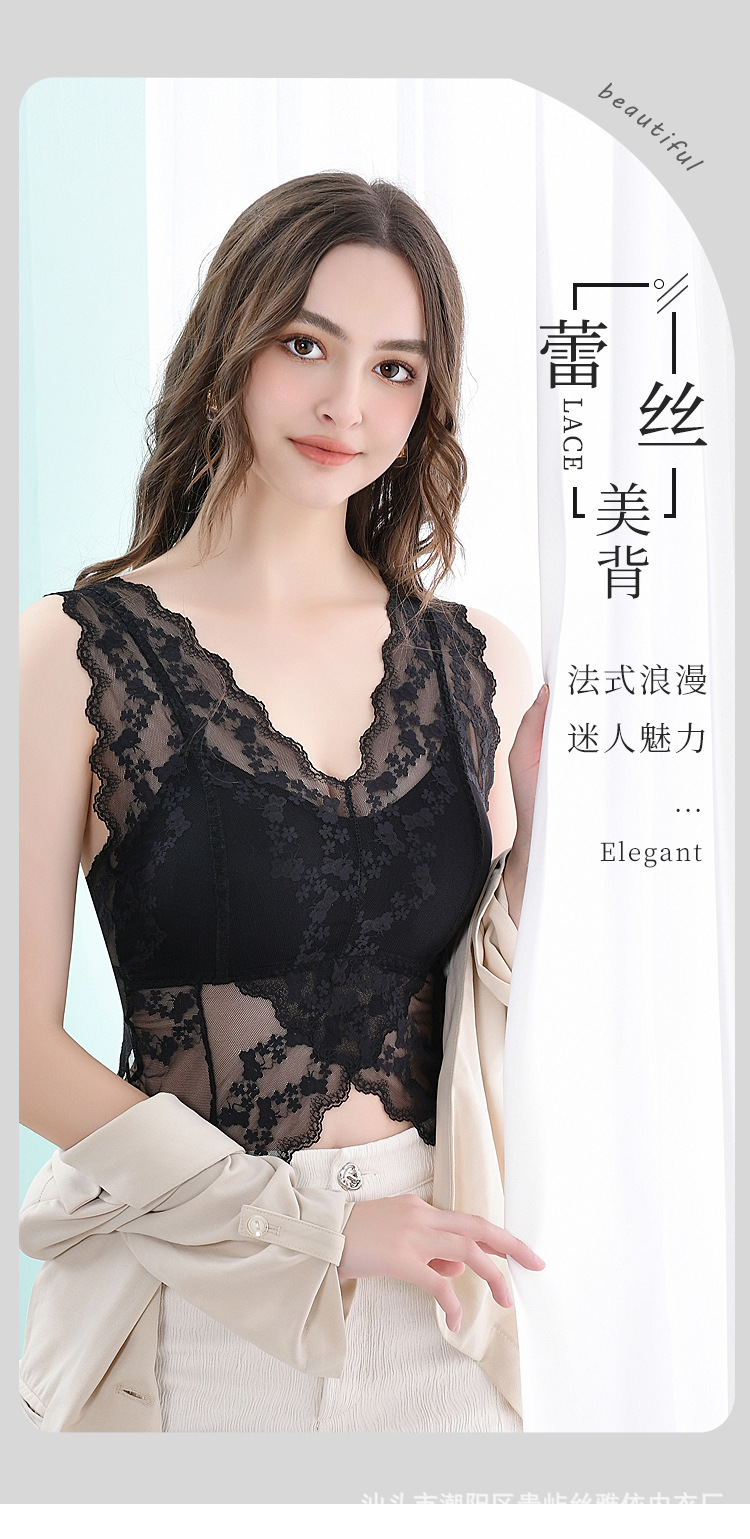 강철 링 바닥이없는 가슴 패드가있는 긴 넓은 어깨 레이스 나비 백 스트랩 조끼 V 넥 백리스 포장 가슴 튜브 탑