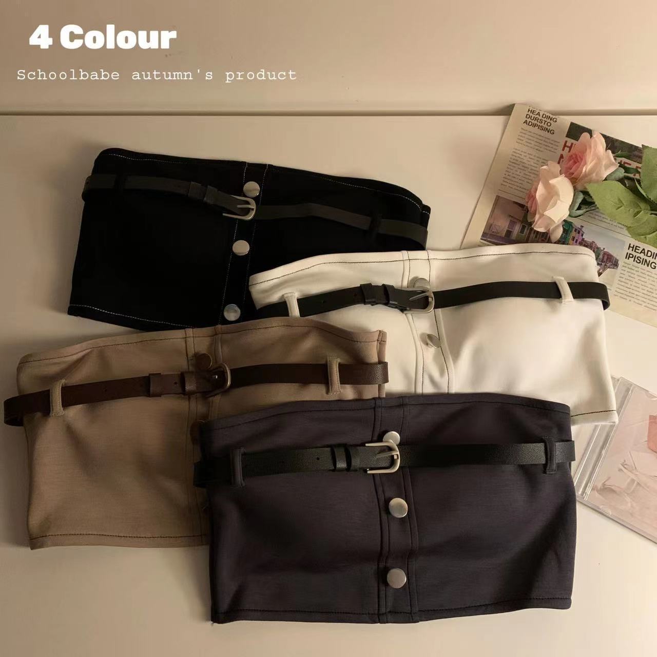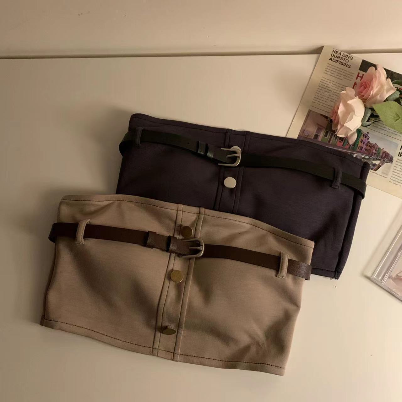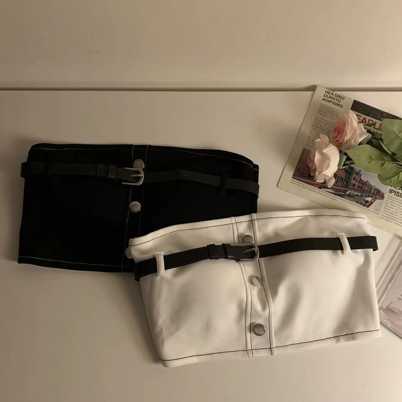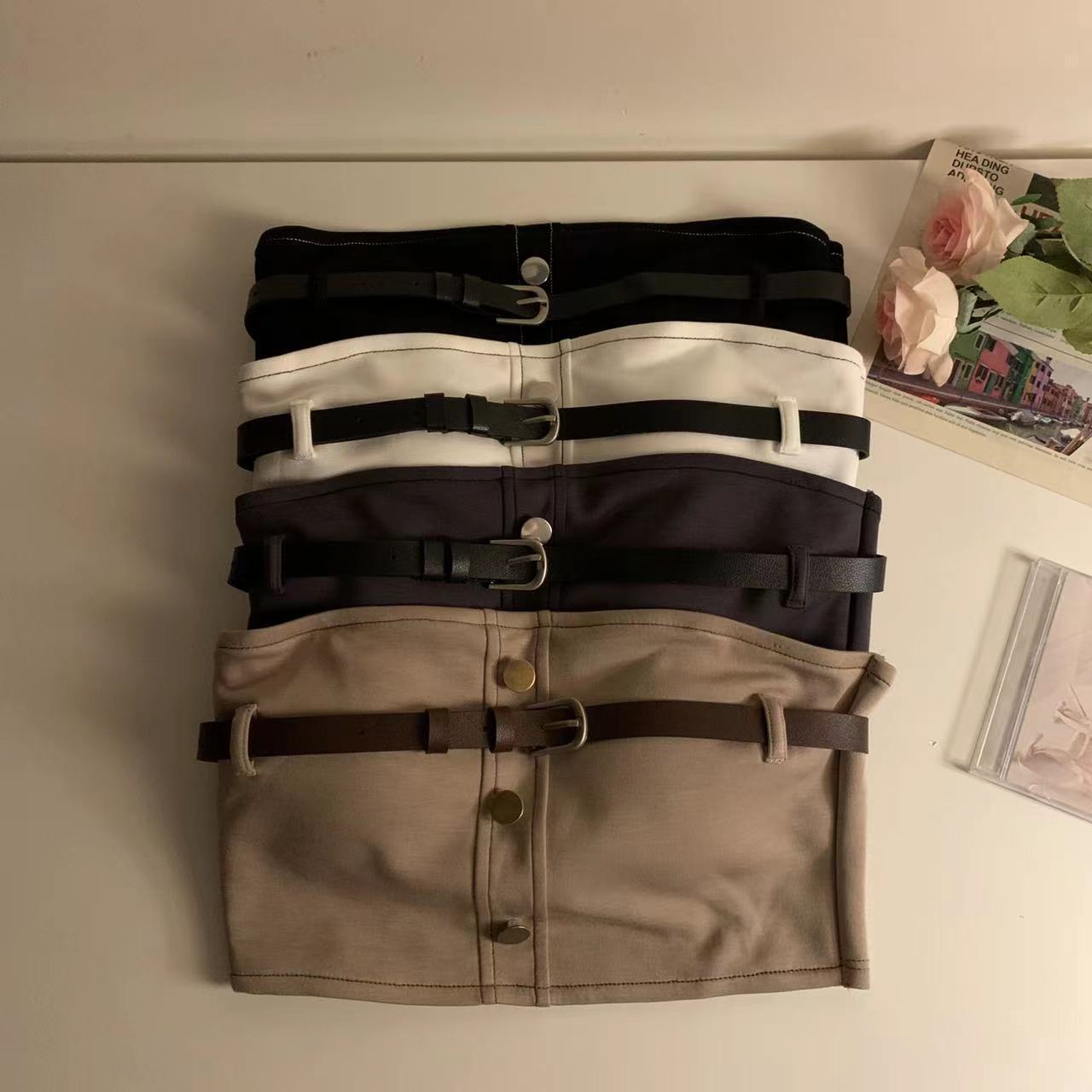 섹시한 작업복 스타일 뜨거운 소녀 포장 가슴 짧은 튜브 상단 벨트 원활한 대비 색상 요소 디자인 내부 기본 조끼 여성스토어 가기