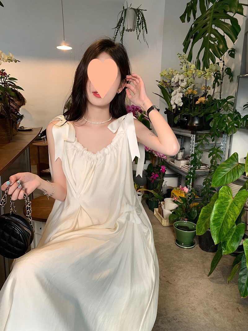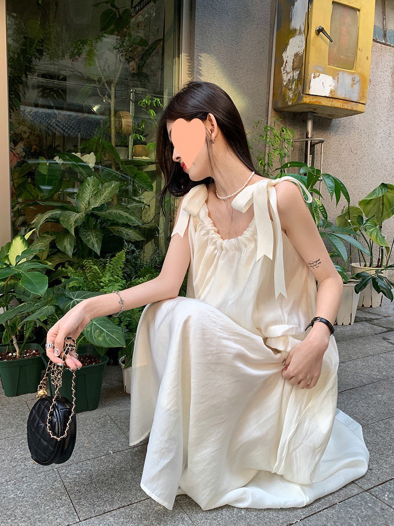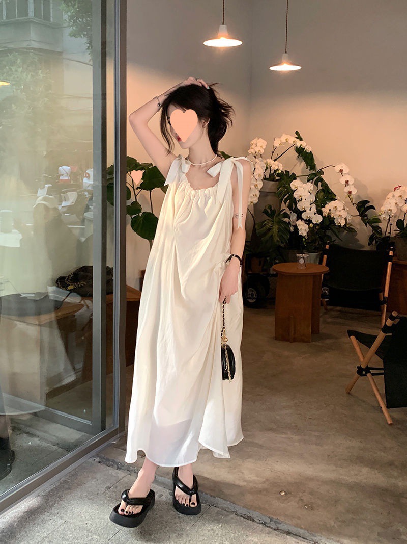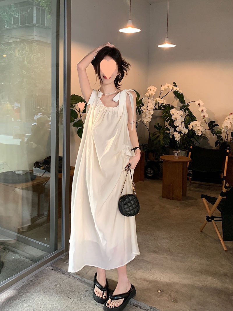 프랑스의 부드럽고 게으른 휴가 스타일 루즈한 서스펜더 드레스 여성 여름 2024 디자인 중간 길이 스커트