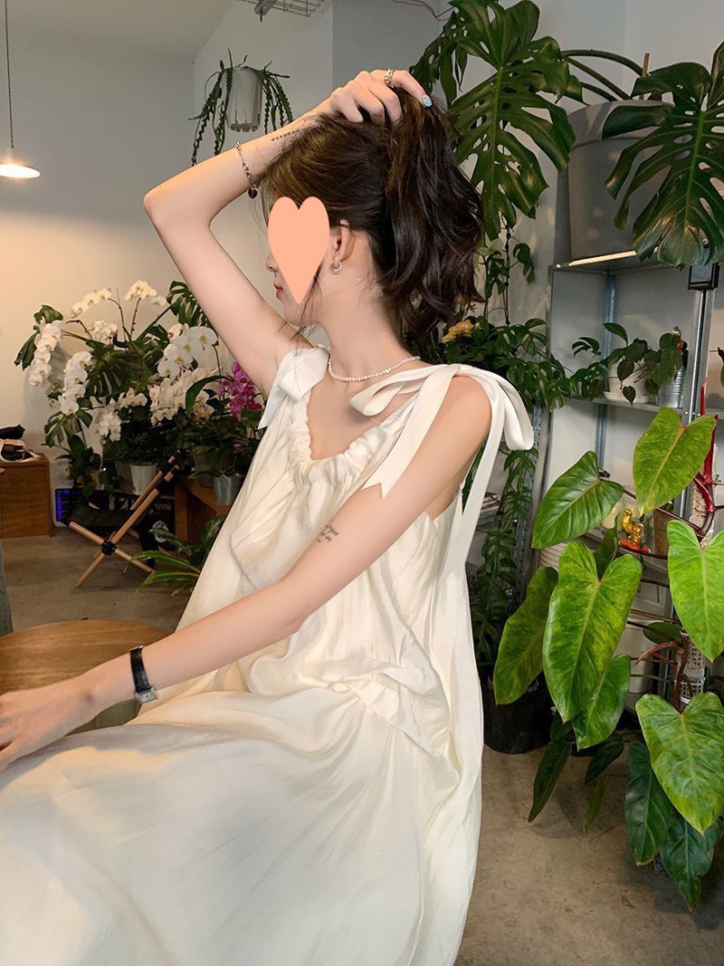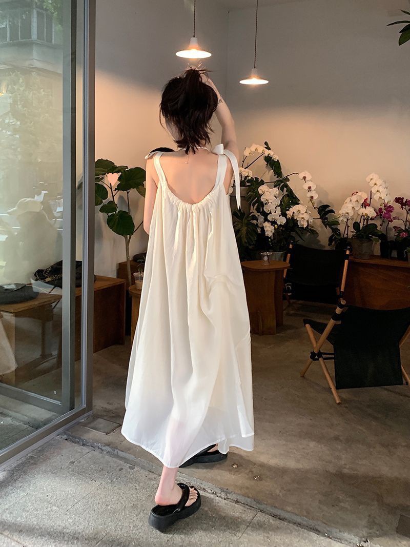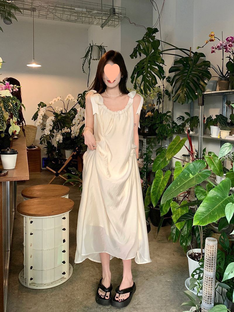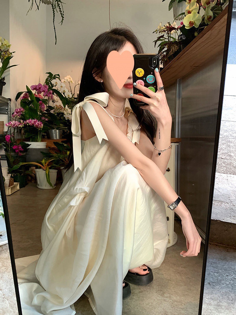 프랑스의 부드럽고 게으른 휴가 스타일 루즈한 서스펜더 드레스 여성 여름 2024 디자인 중간 길이 스커트