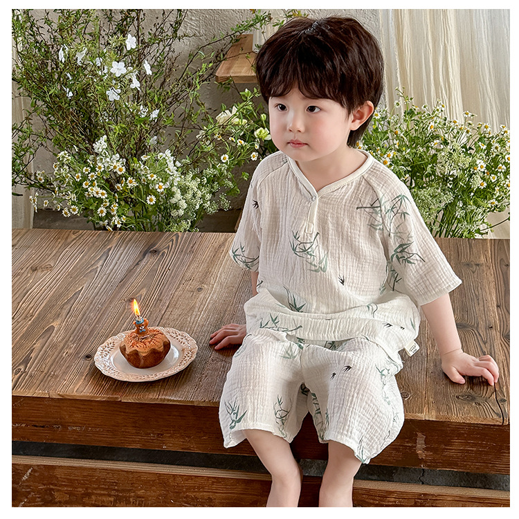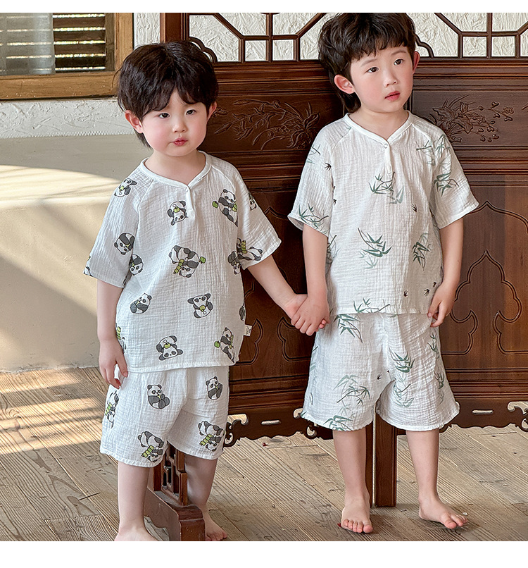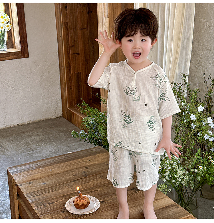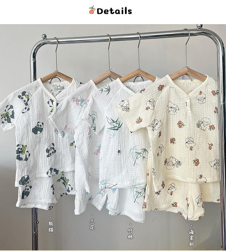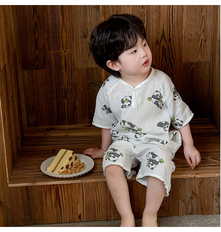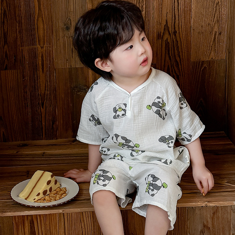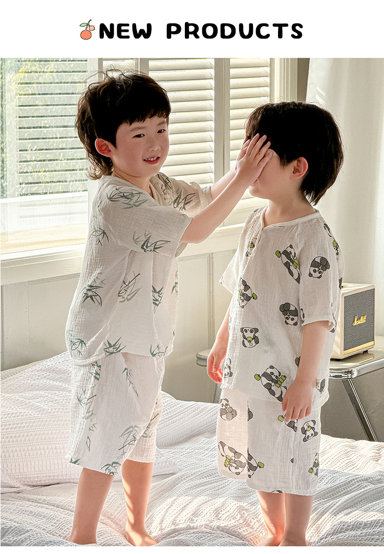 어린이 얇은 순면 거즈 잠옷 여름 소녀 가정 의류 세트 2025 아기 소년 반팔 에어컨 의류스토어 가기