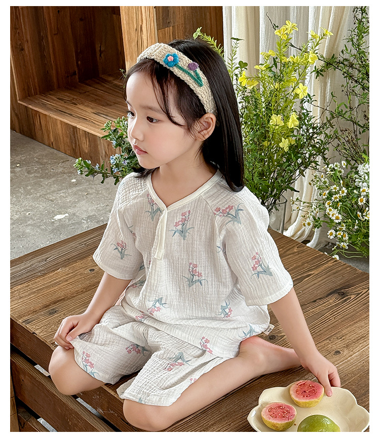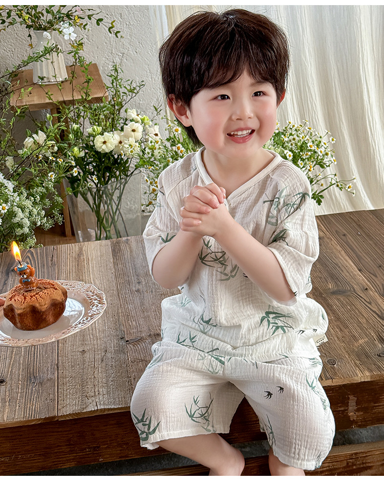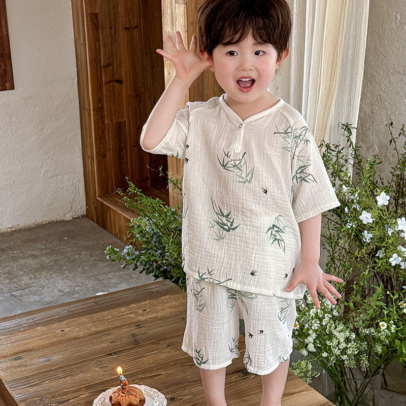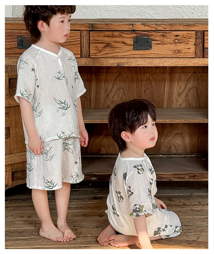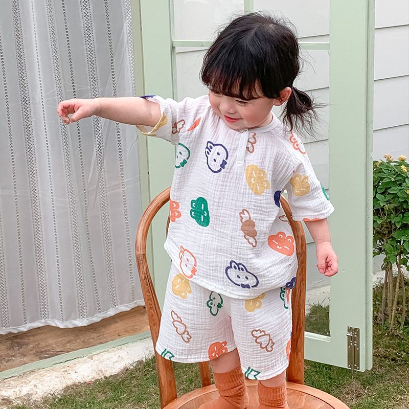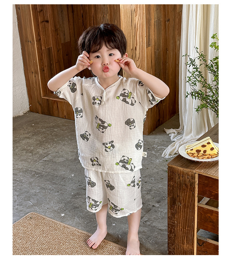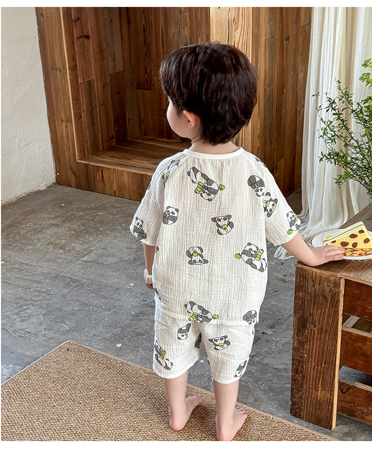 어린이 얇은 순면 거즈 잠옷 여름 소녀 가정 의류 세트 2025 아기 소년 반팔 에어컨 의류스토어 가기