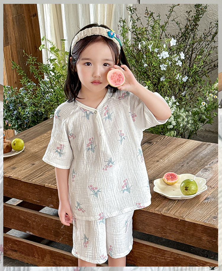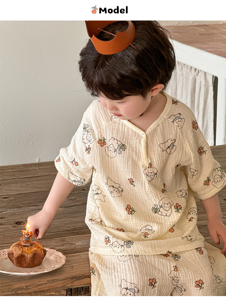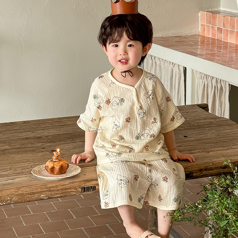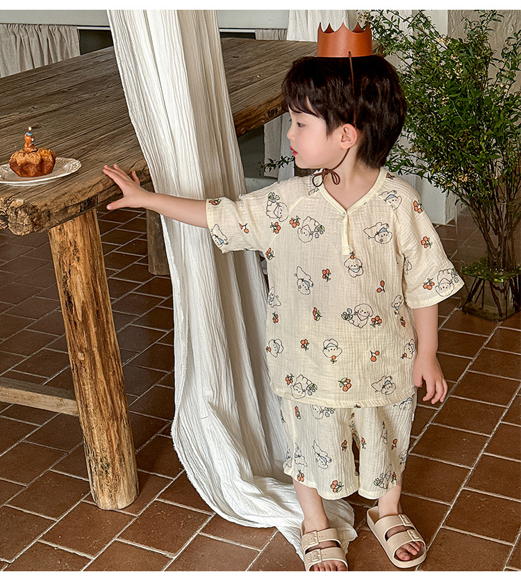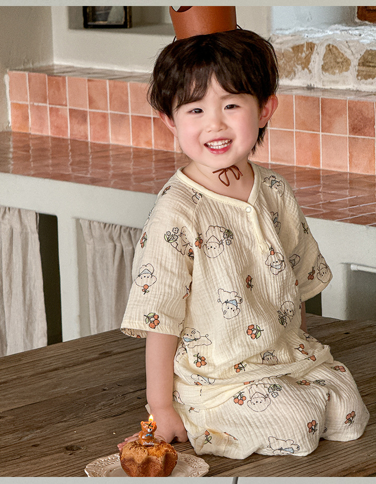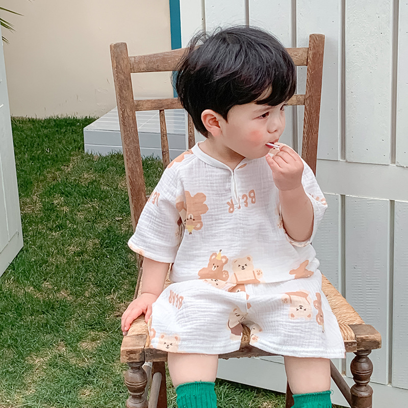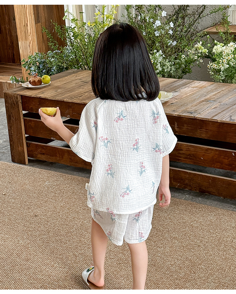 어린이 얇은 순면 거즈 잠옷 여름 소녀 가정 의류 세트 2025 아기 소년 반팔 에어컨 의류스토어 가기