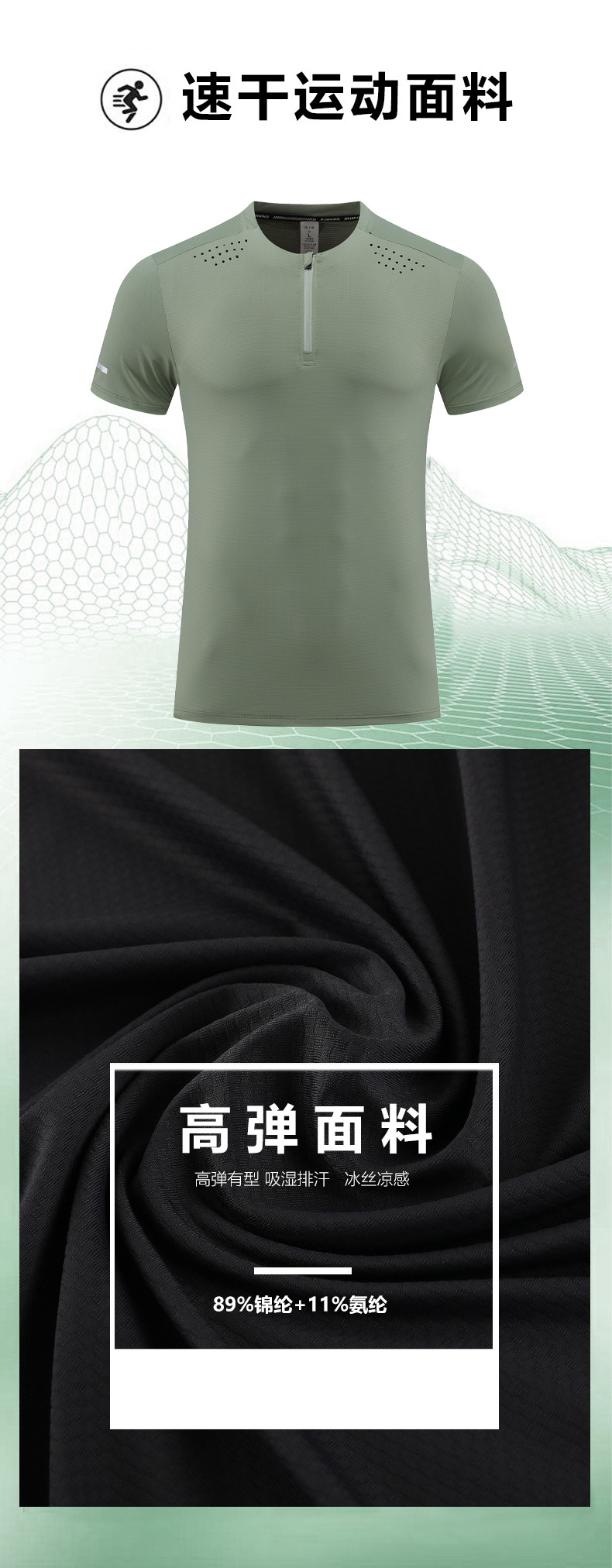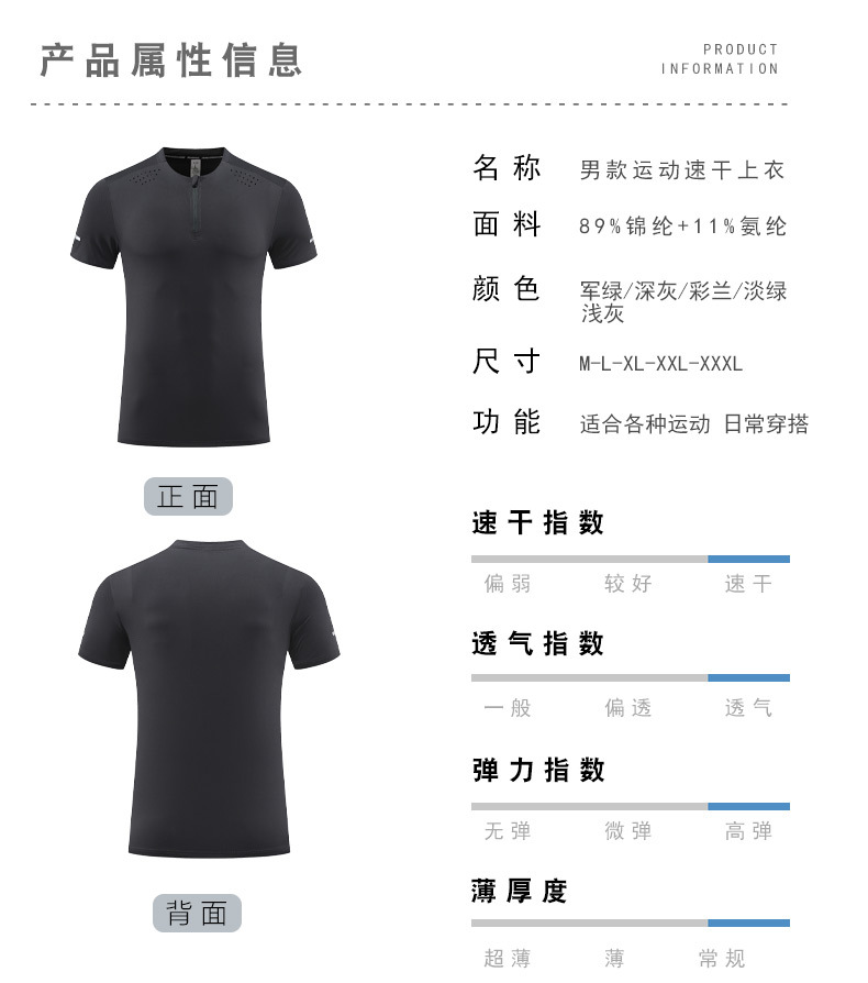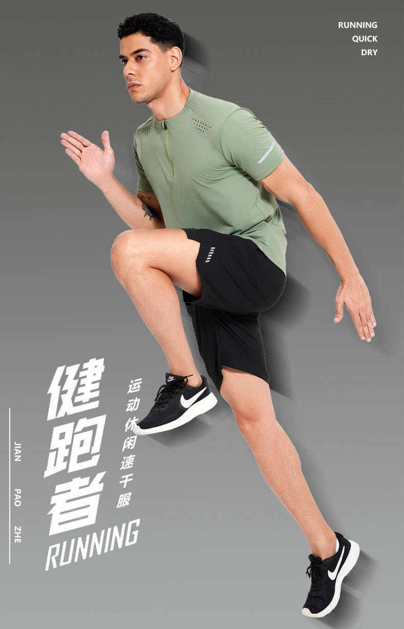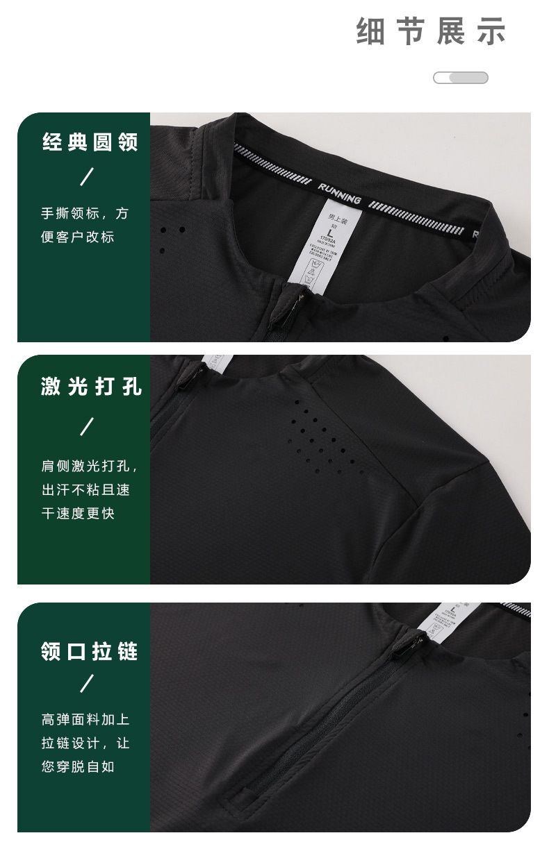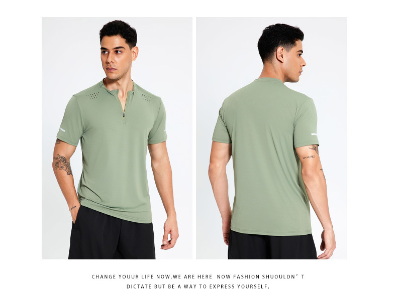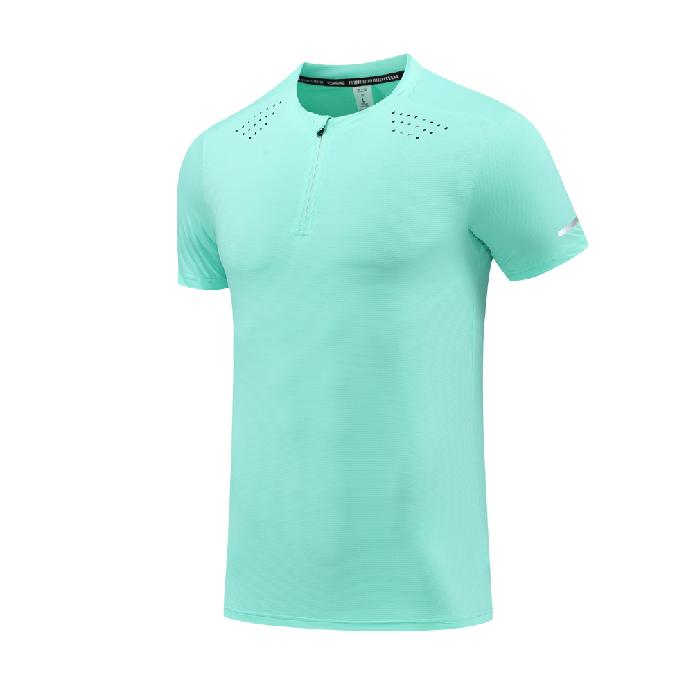 锦纶冰丝跑步运动短袖t恤男立领半拉链纯色健身衣训练弹力速干衣