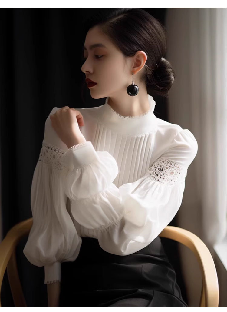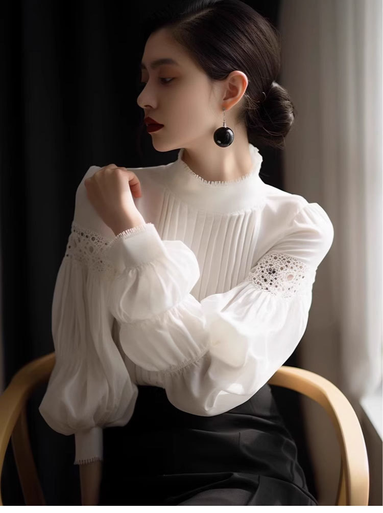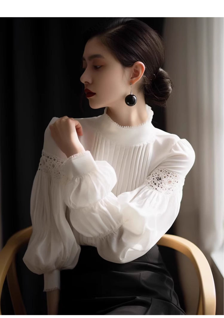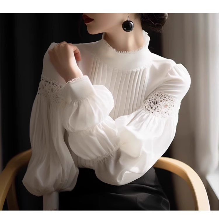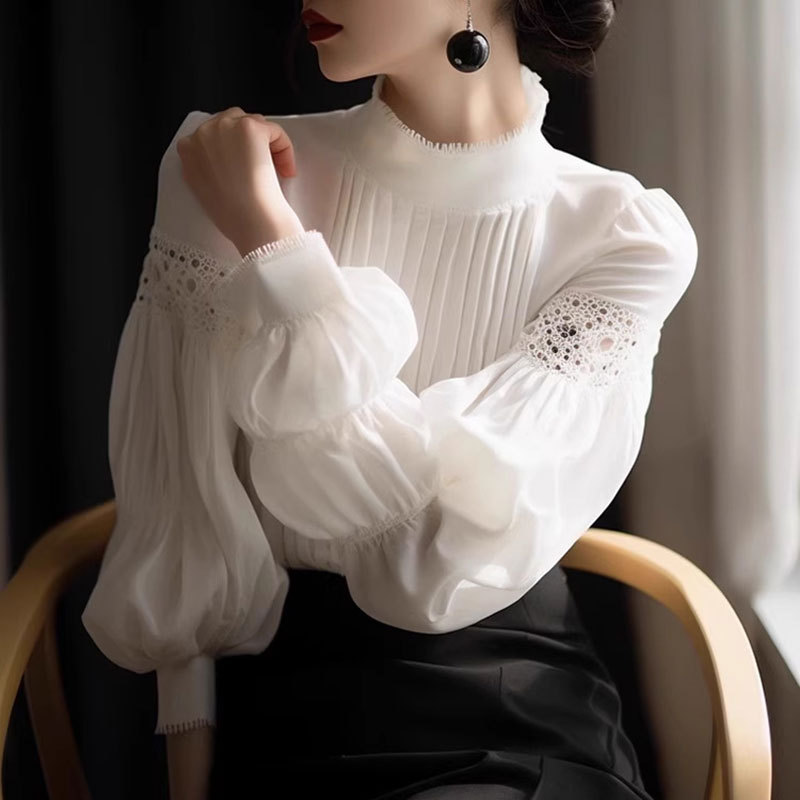 2024 레이스 셔츠/쉬폰 셔츠 간단한 한국 스타일 표준 긴 소매 H 자형 랜턴 소매 풀오버 봄과 가을 단색스토어 가기
