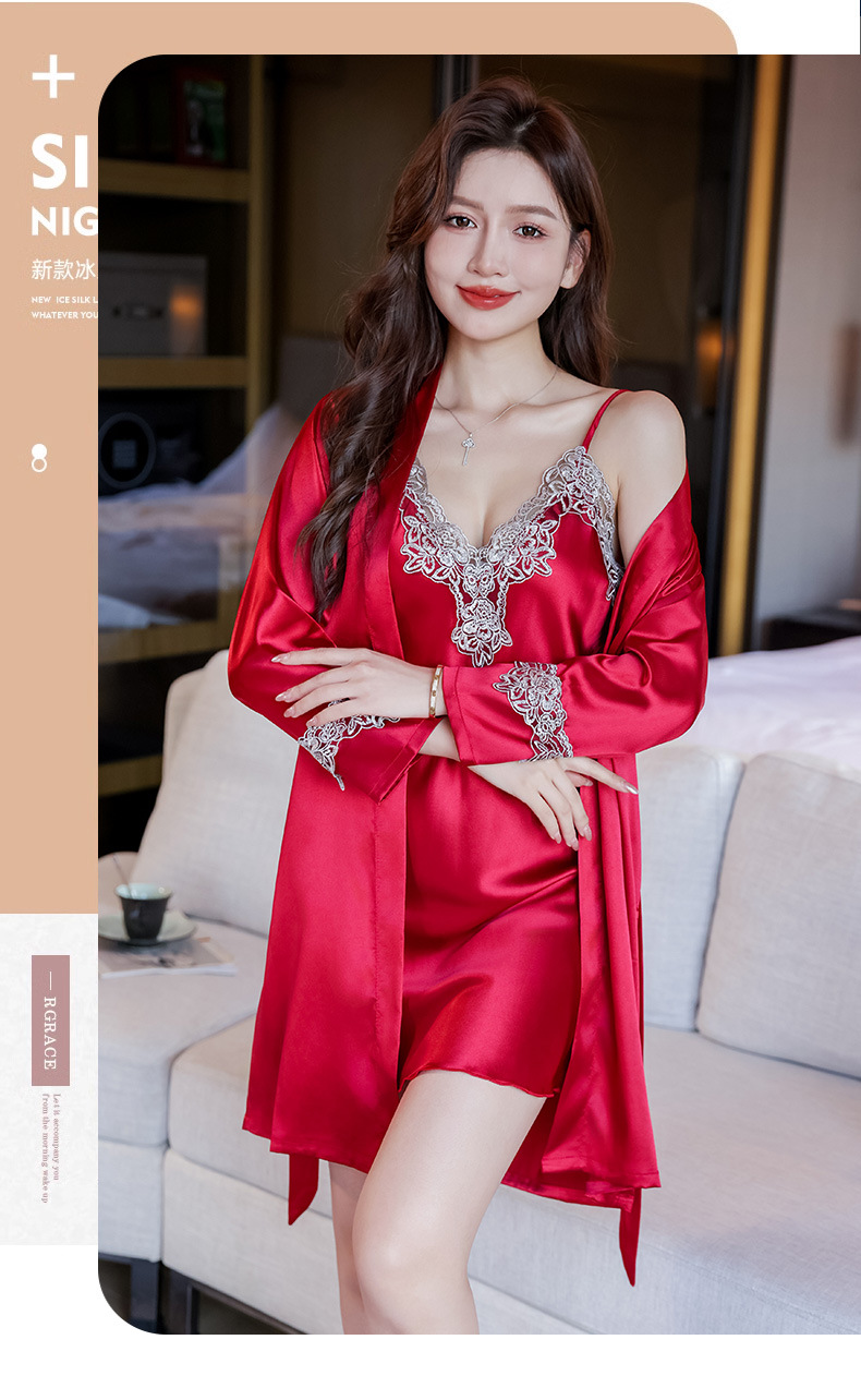 2024 인조 실크 잠옷 여성 봄과 여름 레이스 섹시한 스트랩 긴팔 잠옷 잠옷 부드러운 피부 친화적 인 투피스 세트