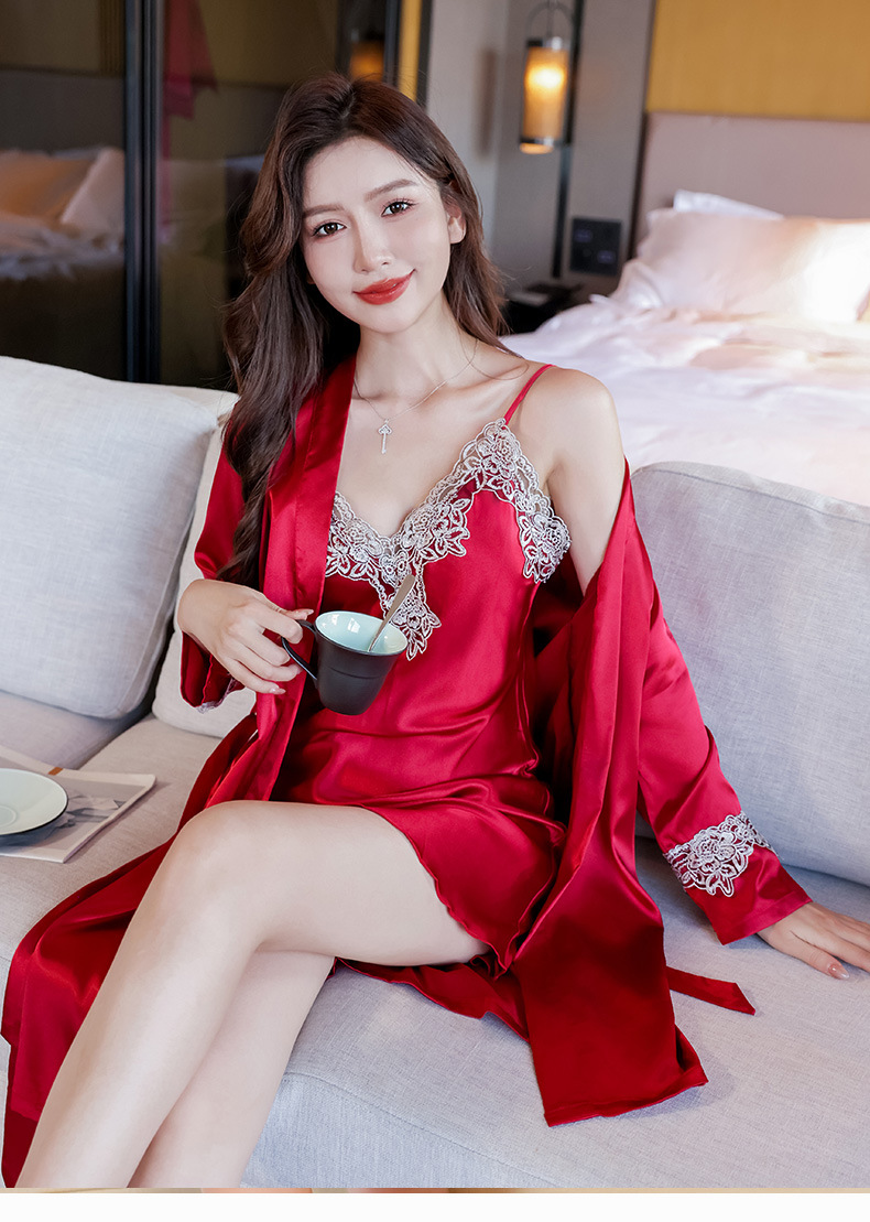 2024 인조 실크 잠옷 여성 봄과 여름 레이스 섹시한 스트랩 긴팔 잠옷 잠옷 부드러운 피부 친화적 인 투피스 세트스토어 가기