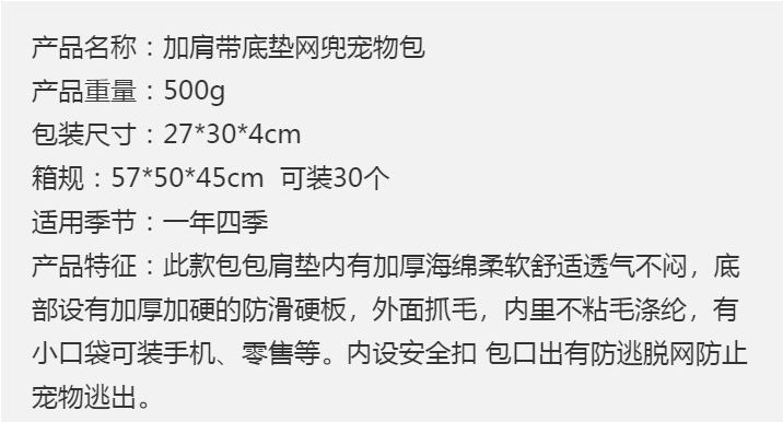 跨境新款可调节狗狗外出背包 带网底支撑猫袋出门狗包宠物外出包