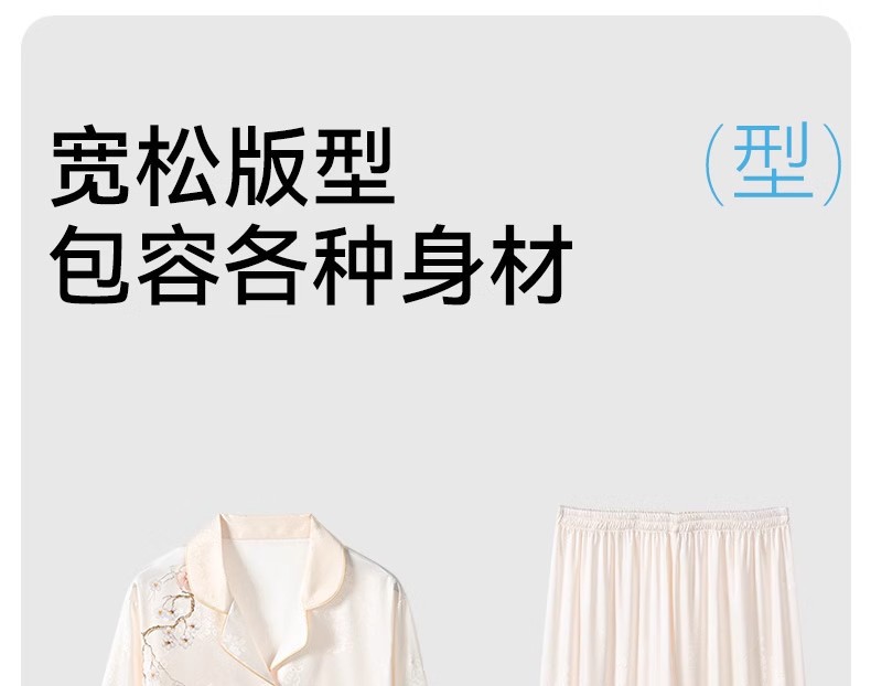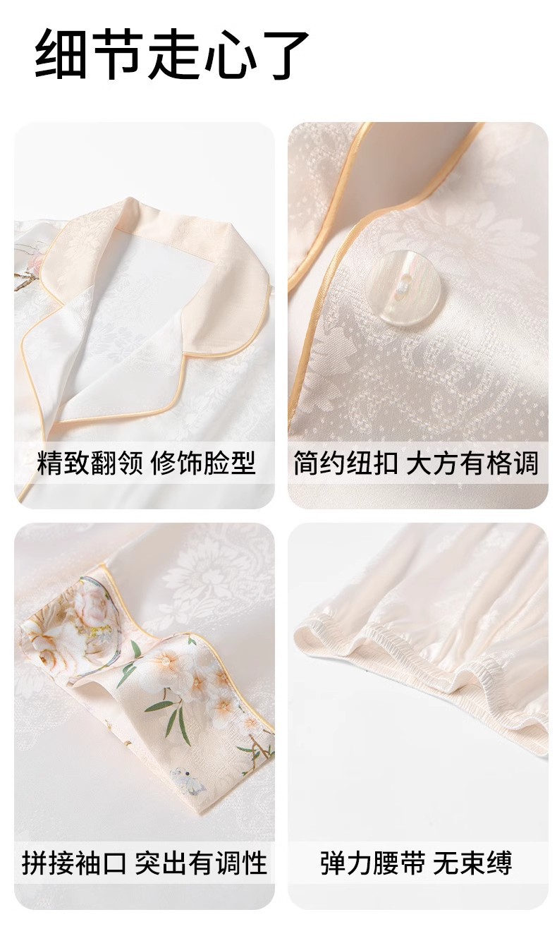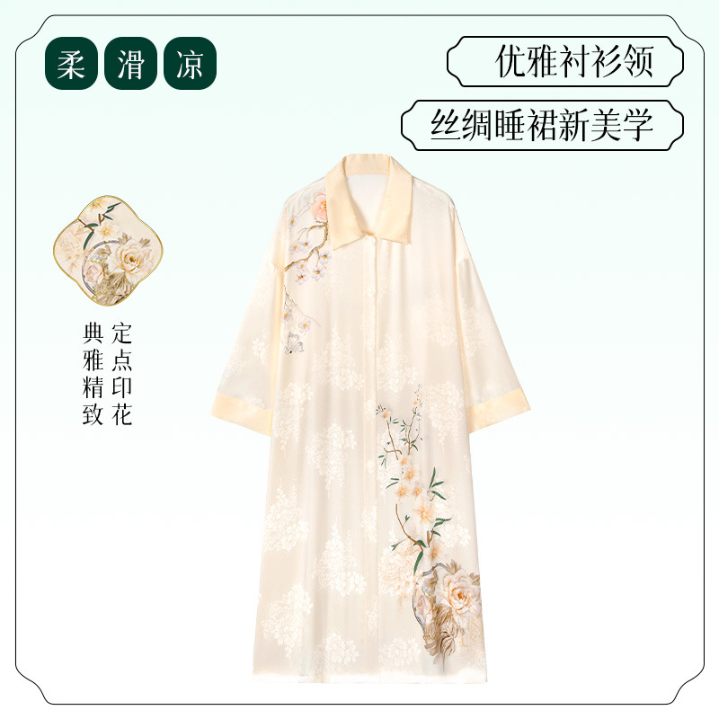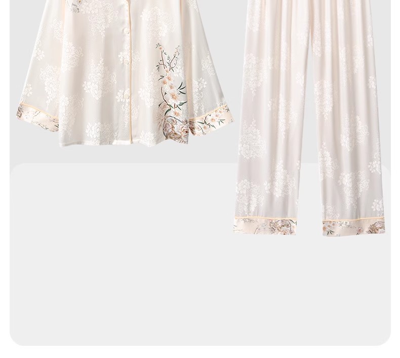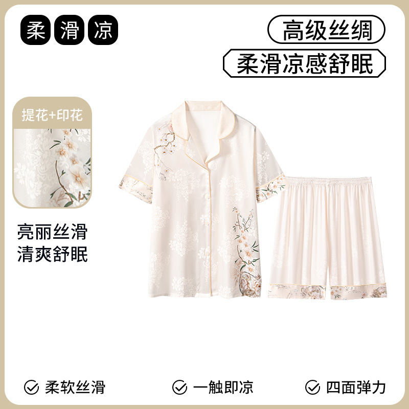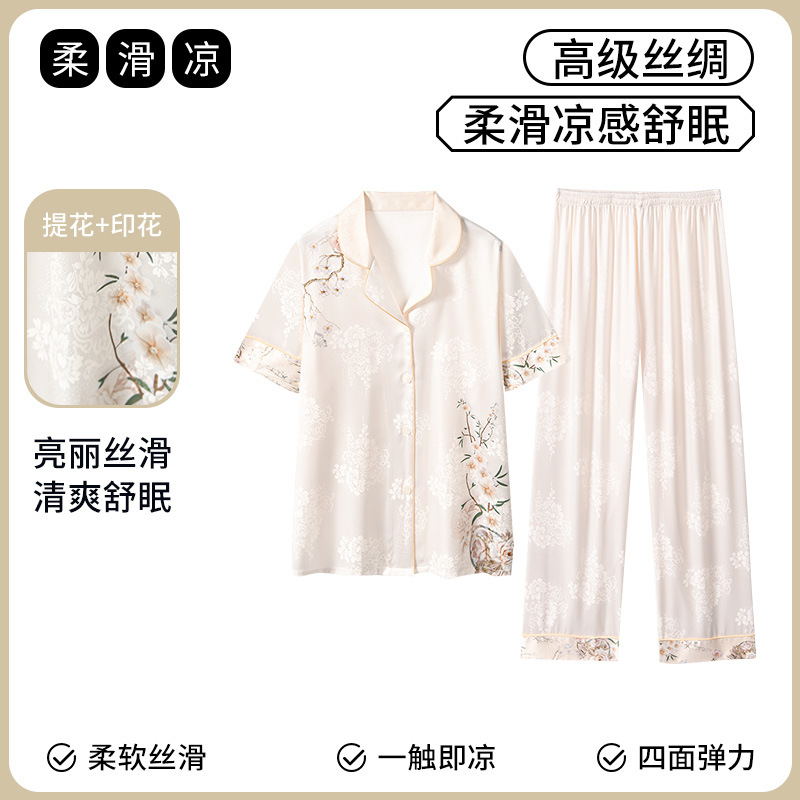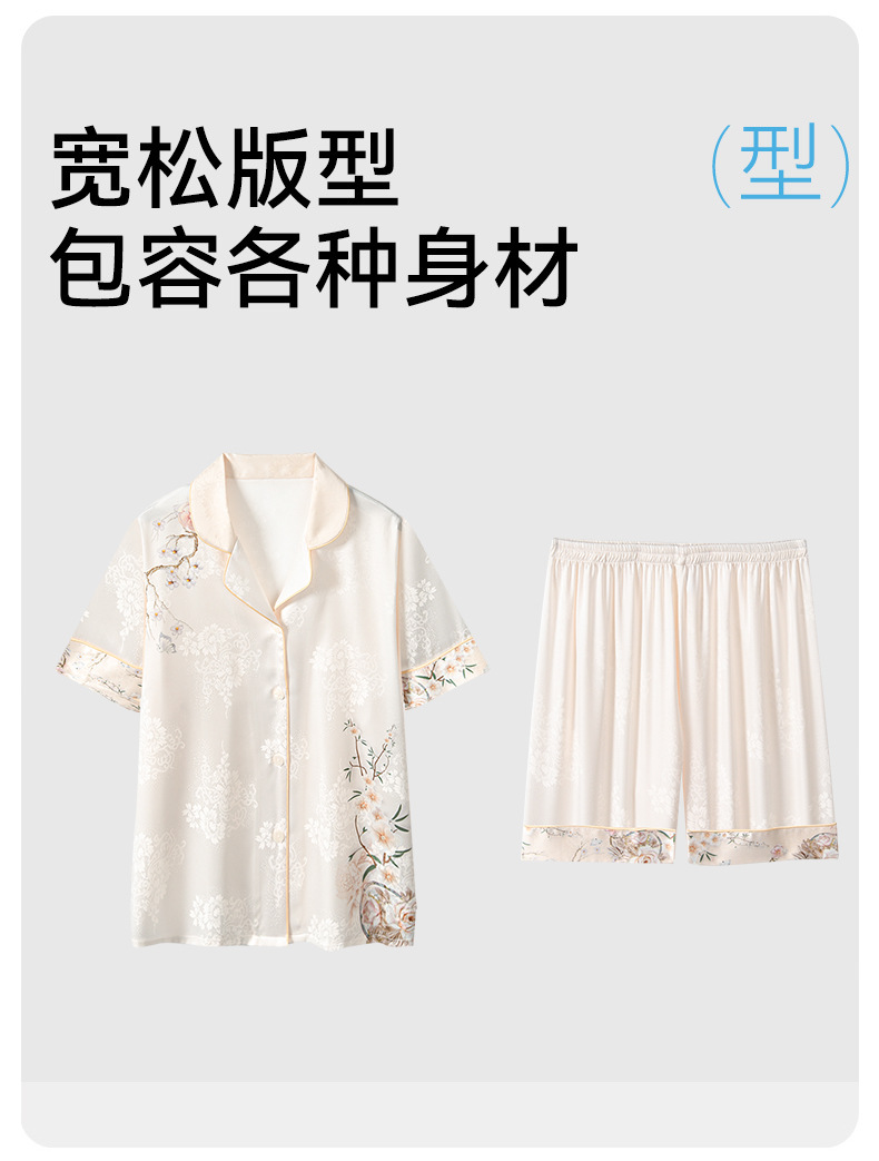 [어머니를위한 선물] 아이스 실크 파자마 여성 국가 스타일 인쇄 옷깃 느슨한 부드러운 집 옷스토어 가기