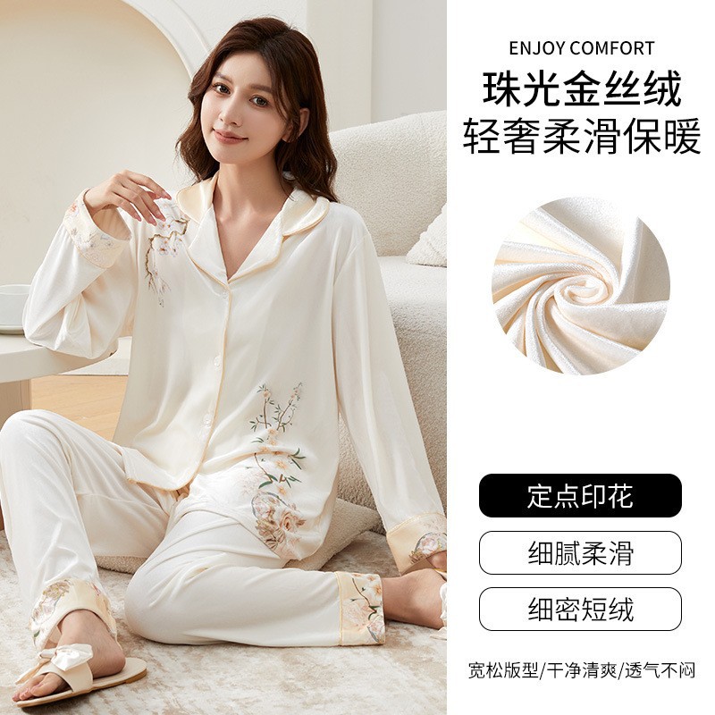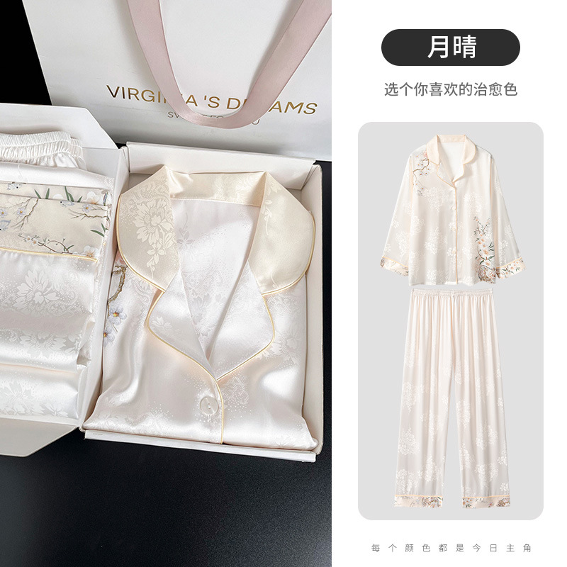 [어머니를위한 선물] 아이스 실크 파자마 여성 국가 스타일 인쇄 옷깃 느슨한 부드러운 집 옷