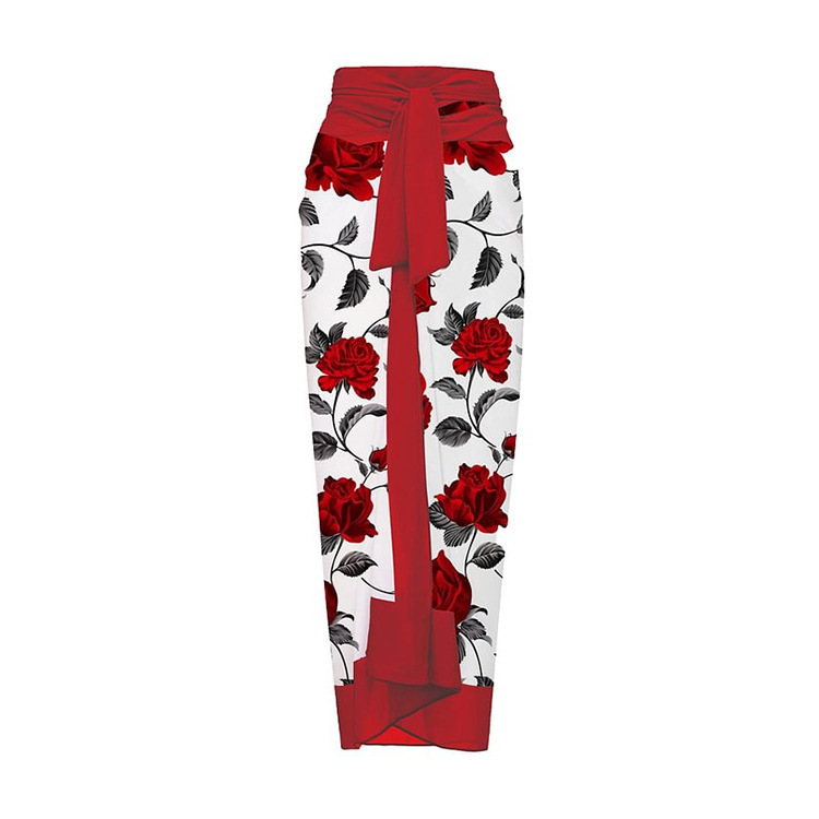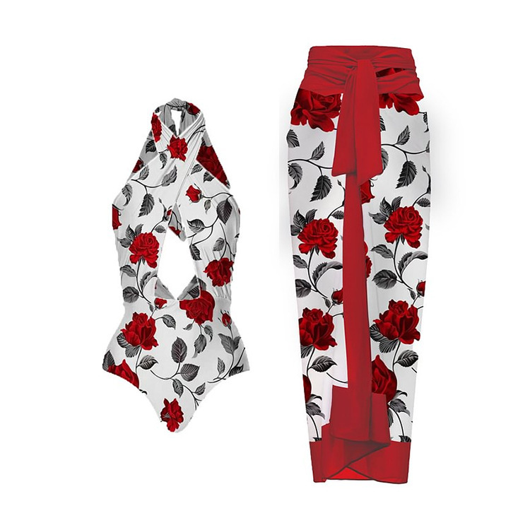 俏佳媛2025欧美新款分体泳衣女士尚性感挂脖系带雪纺裹裙三件套装