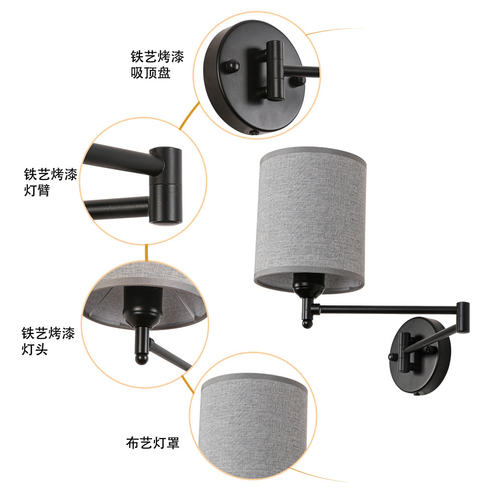 패브릭 거실등, 모던 침실 벽등, 고정형 침대 옆 벽등, 로커 암 벽등, 서재 독서용 패브릭 램프