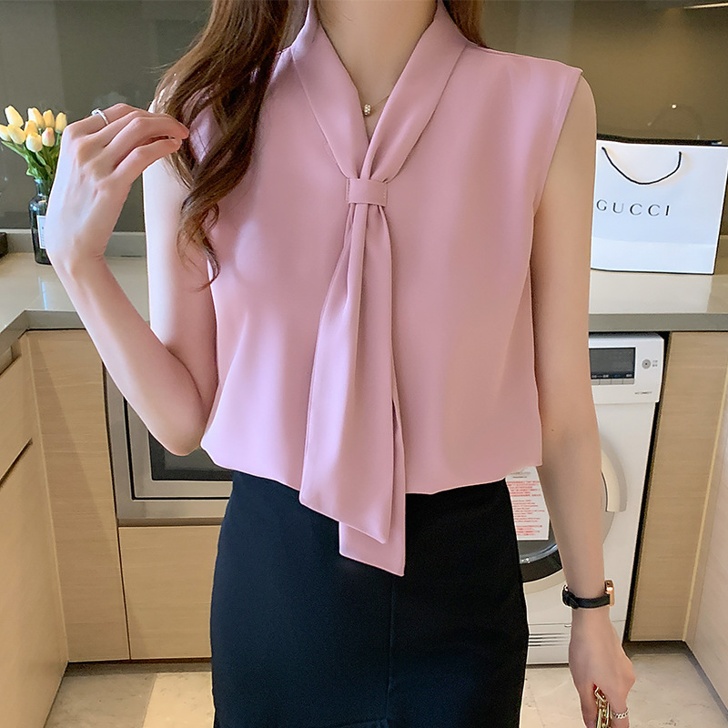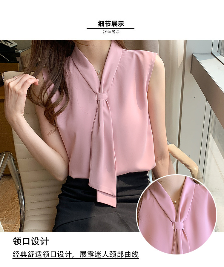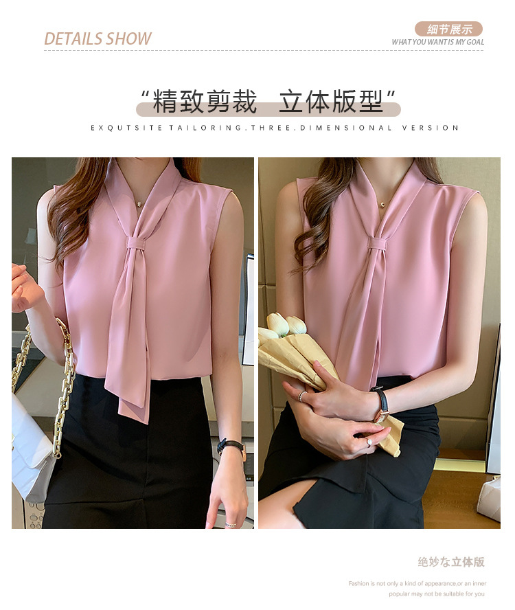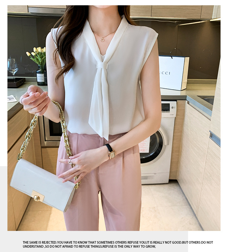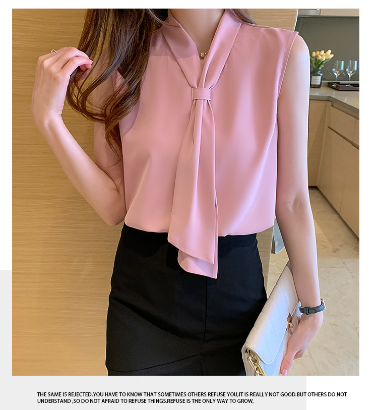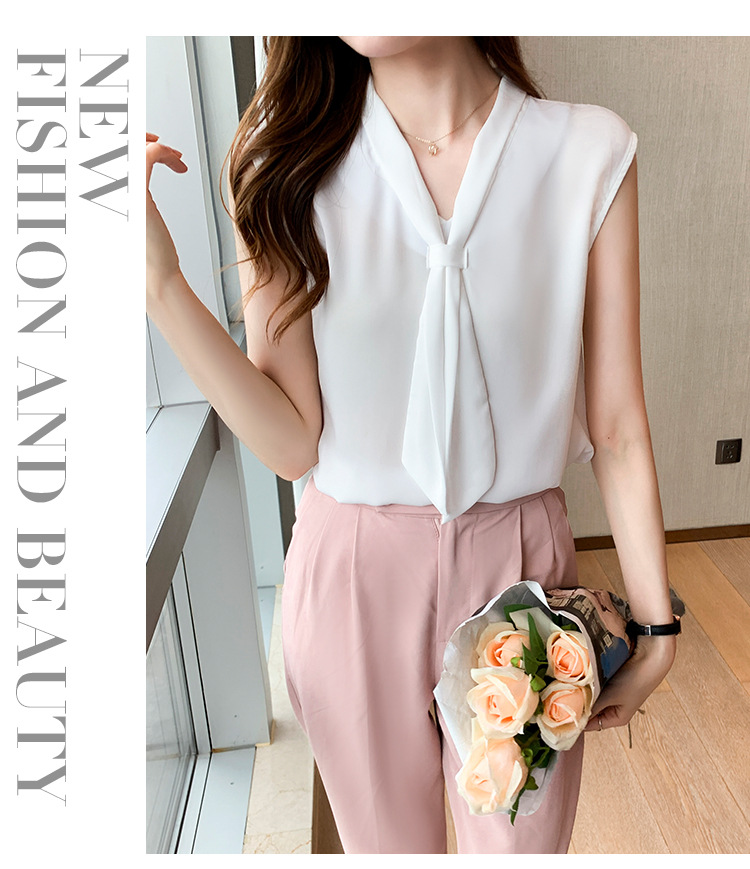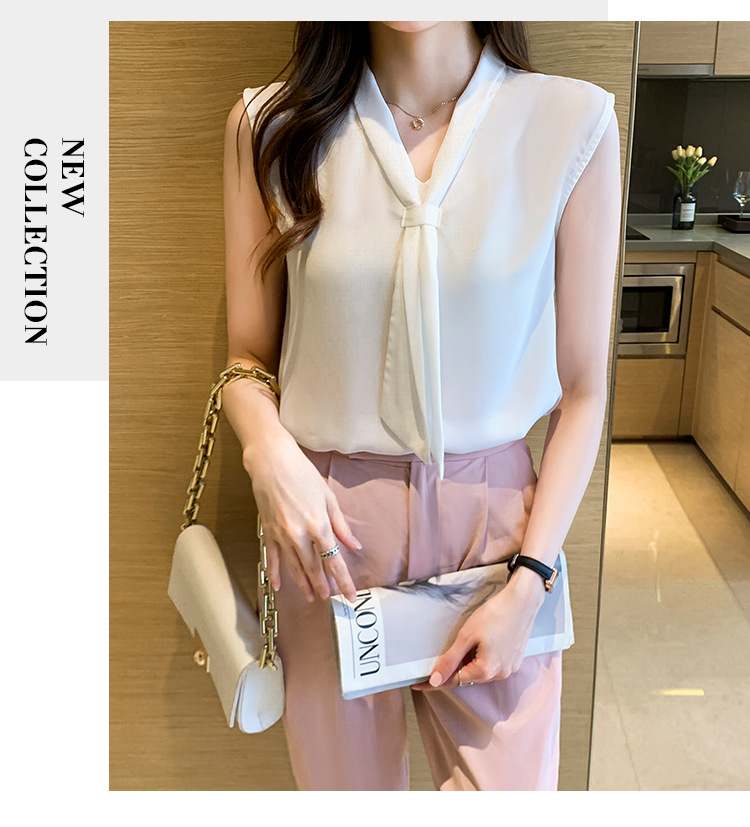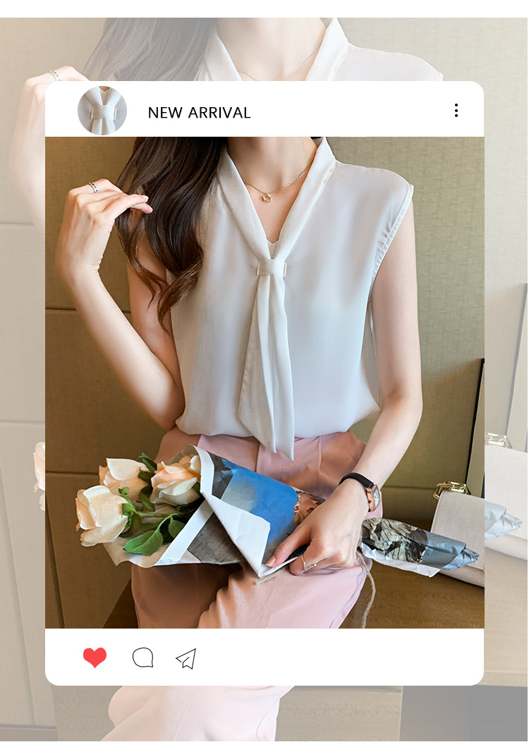 여성용 쉬폰 셔츠 여름 2024 새로운 패션 작은 셔츠 우아한 달콤한 배를 덮는 느슨한 올 매치 민소매 탑스토어 가기