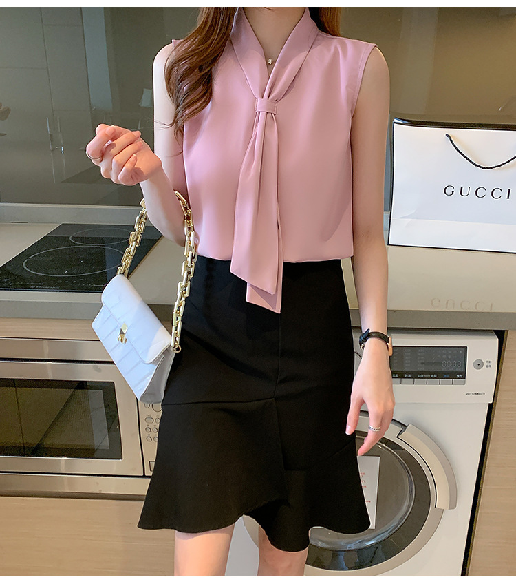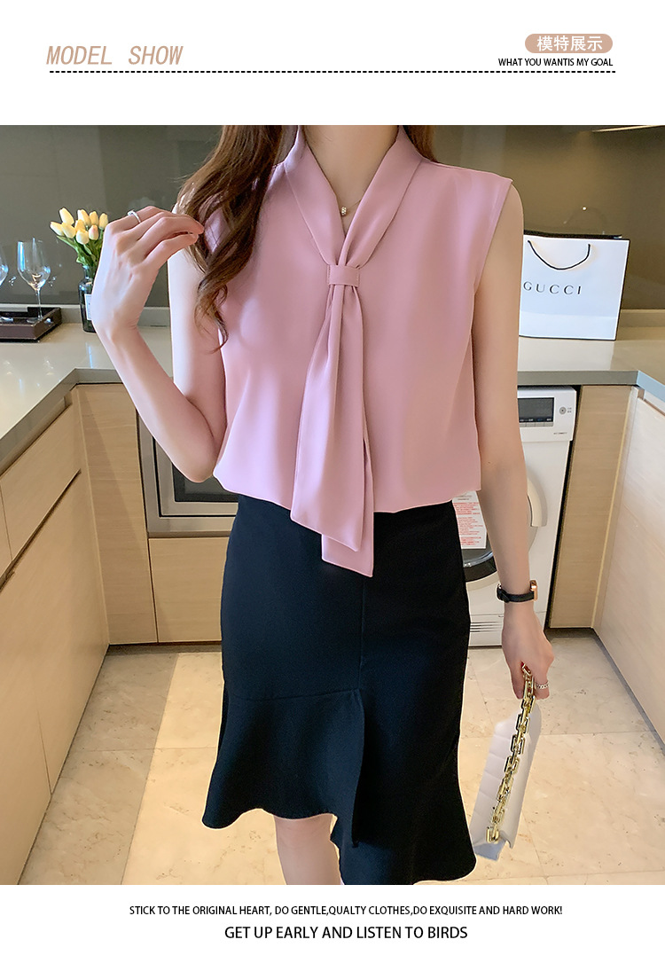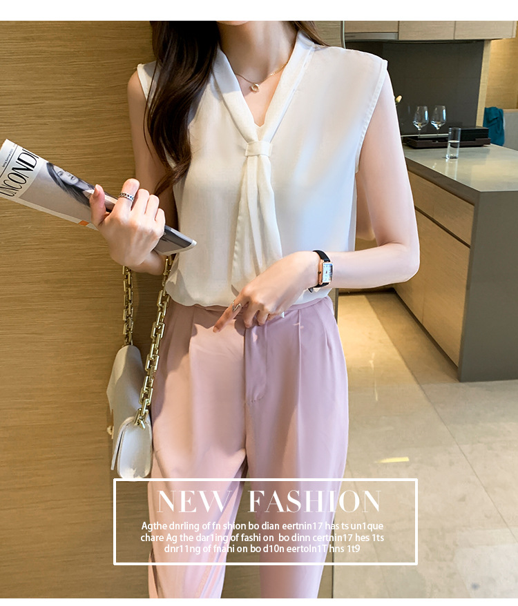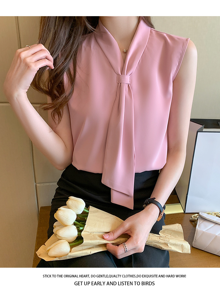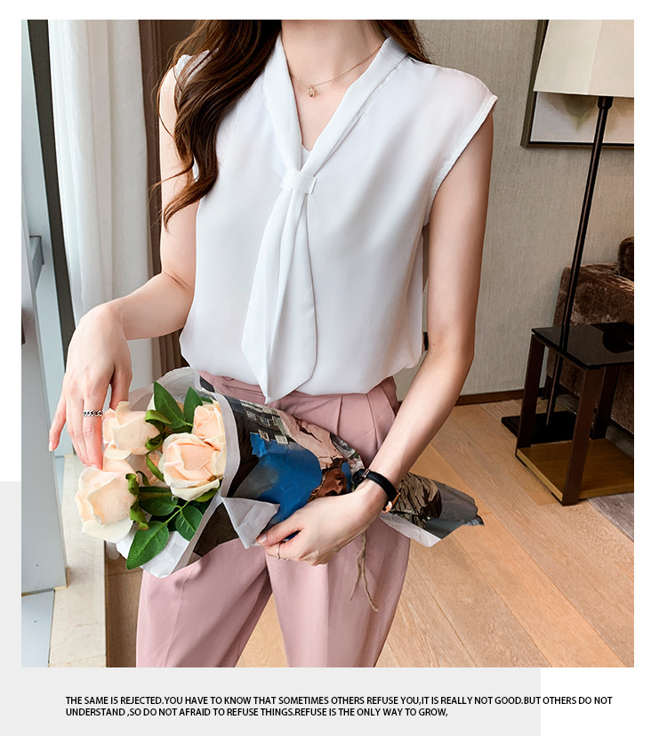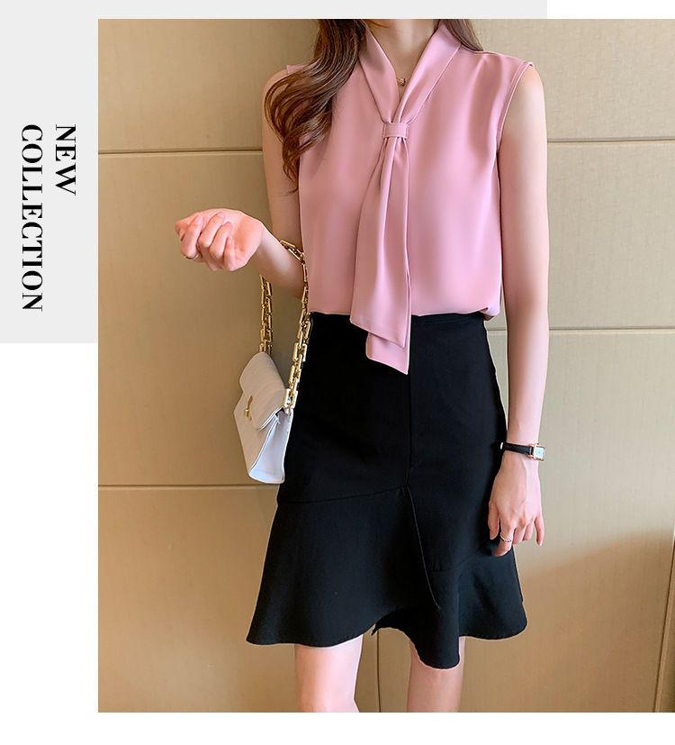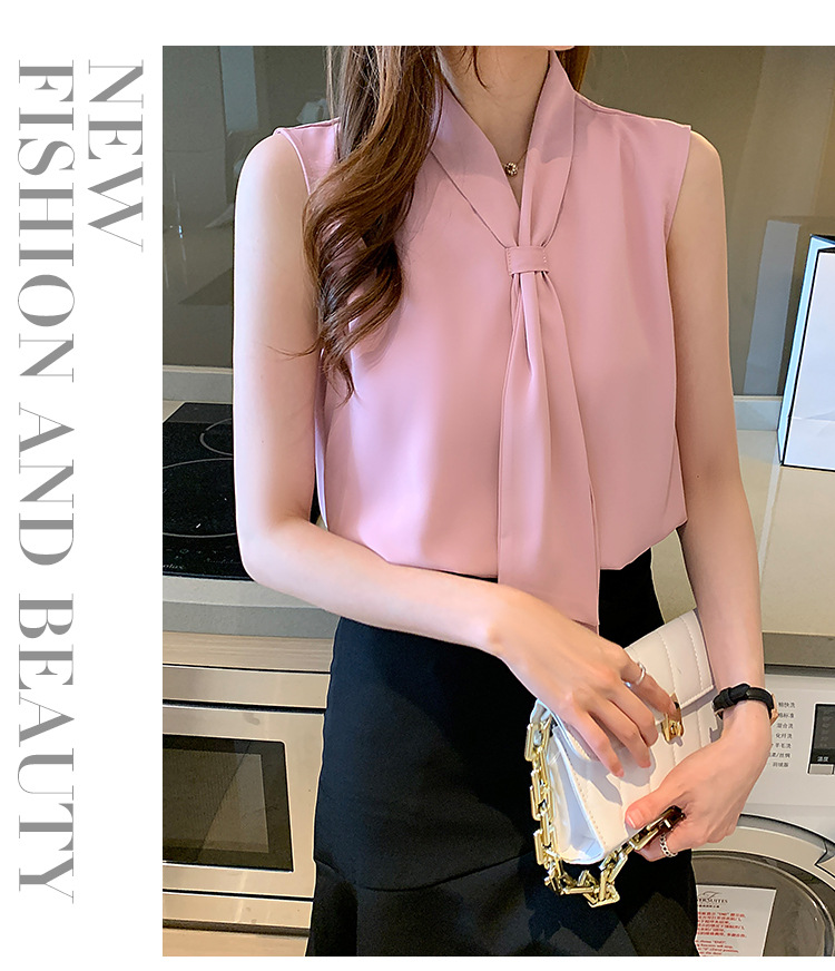 여성용 쉬폰 셔츠 여름 2024 새로운 패션 작은 셔츠 우아한 달콤한 배를 덮는 느슨한 올 매치 민소매 탑스토어 가기