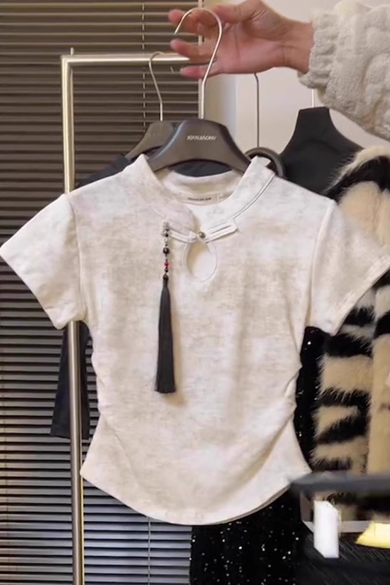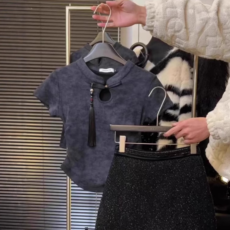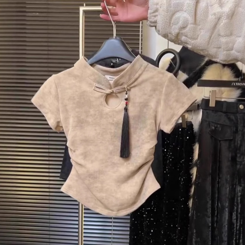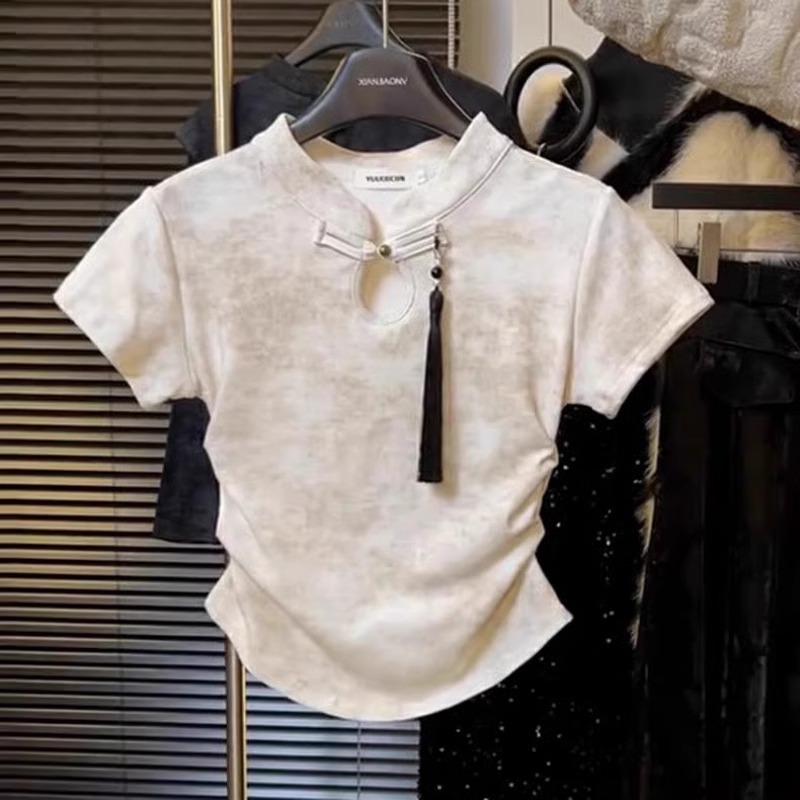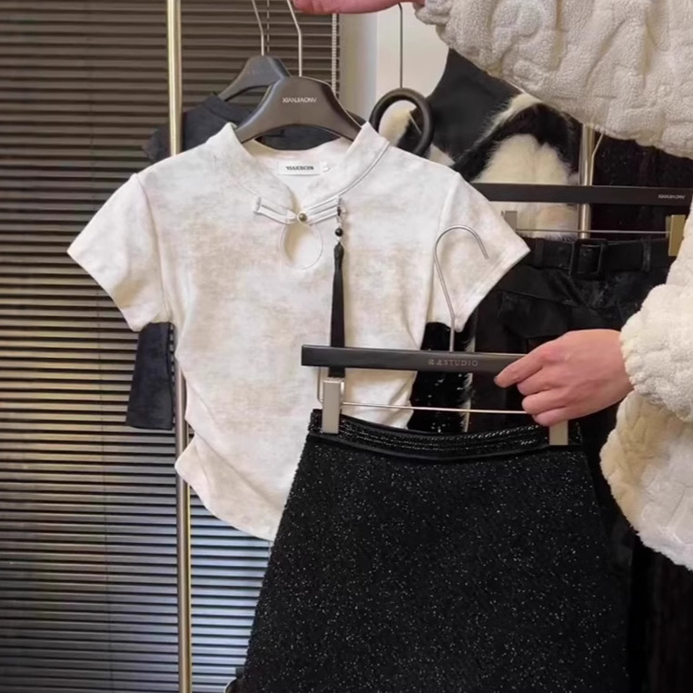 스커트 2024 여성을위한 새로운 중국 스타일 반팔 탑 여성을위한 새로운 복고풍 슬림 슬리밍 짧은 국가 스타일 버클 티셔츠스토어 가기