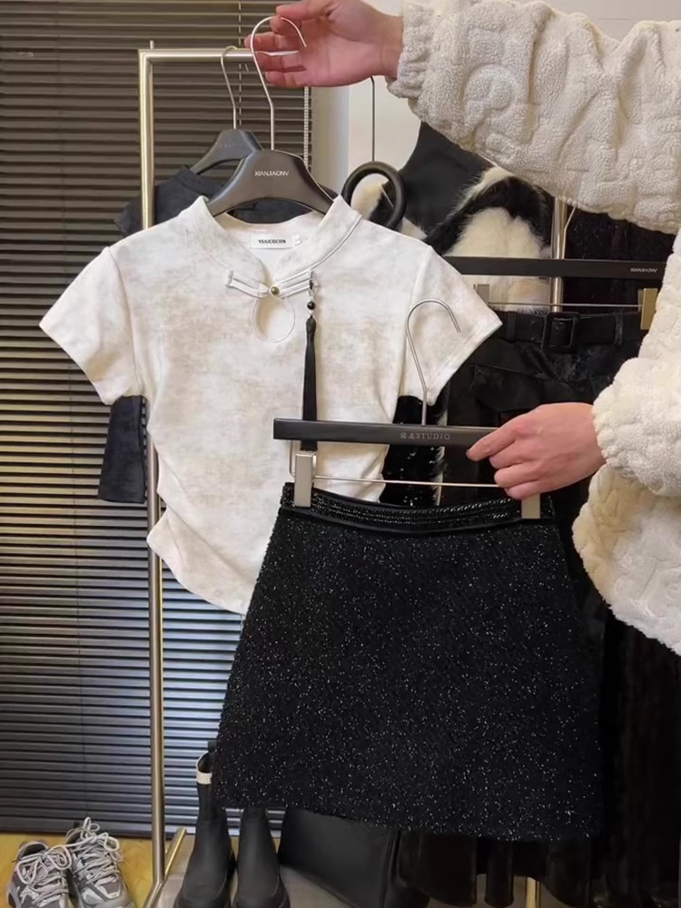 스커트 2024 여성을위한 새로운 중국 스타일 반팔 탑 여성을위한 새로운 복고풍 슬림 슬리밍 짧은 국가 스타일 버클 티셔츠
