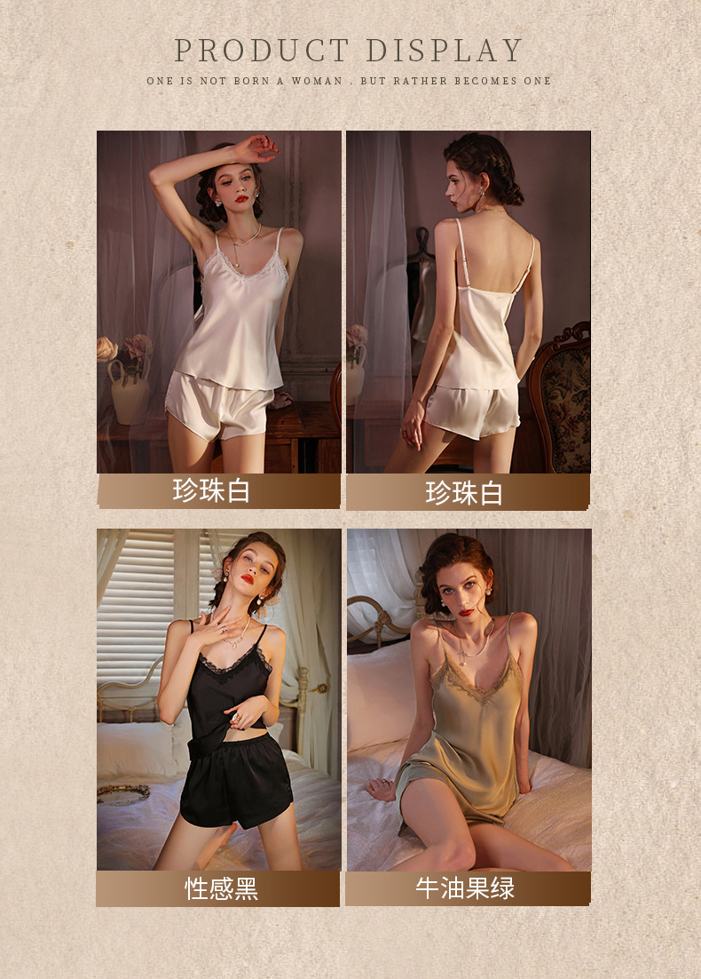 프랑스 스타일 화이트 잠옷 여성 아이스 실크 여름 얇은 순수 섹시한 서스펜더 반바지 세트 홈 웨어 라이브 배달스토어 가기