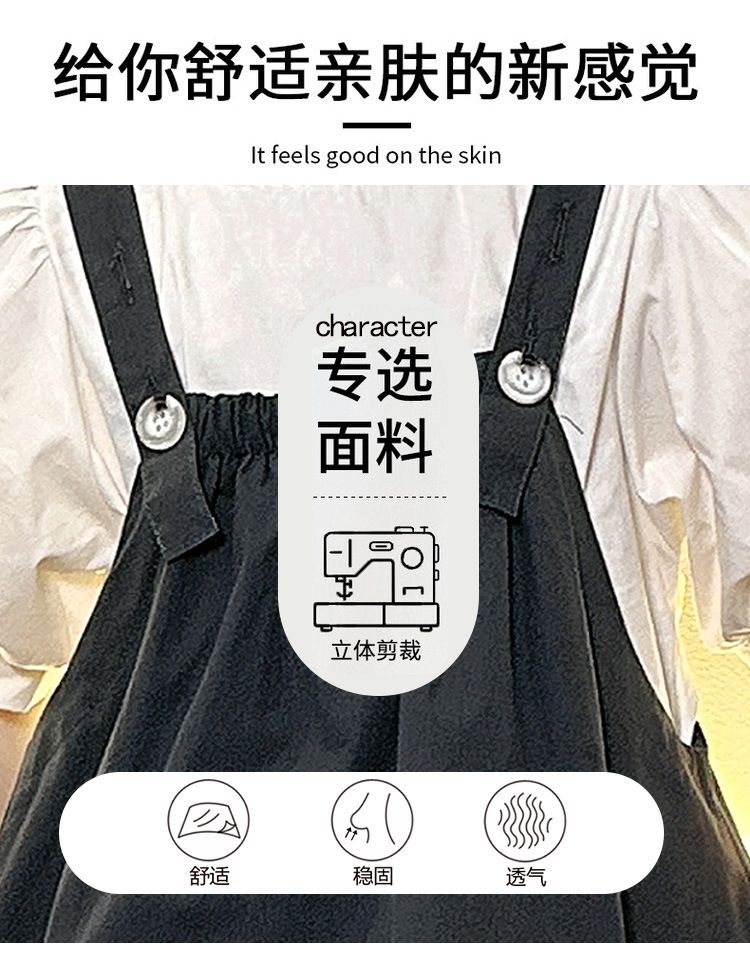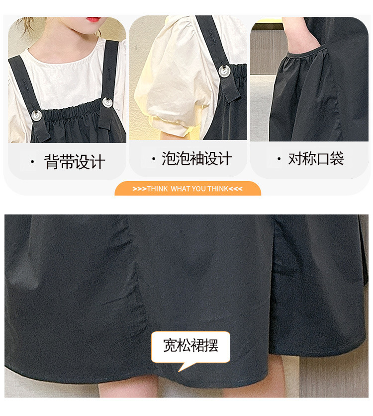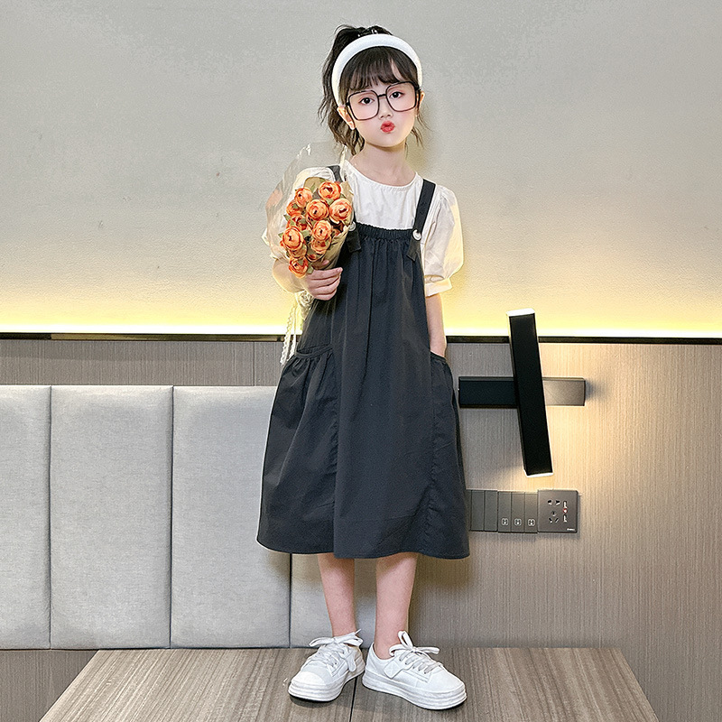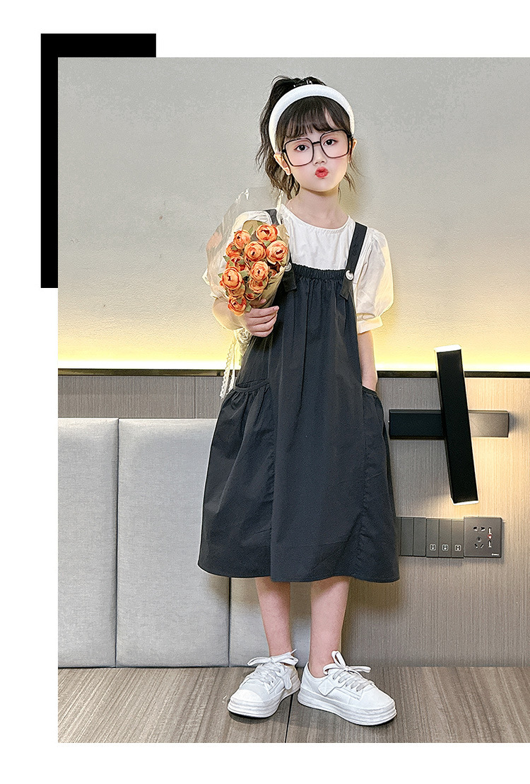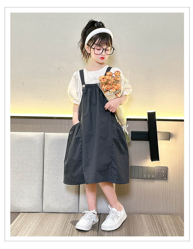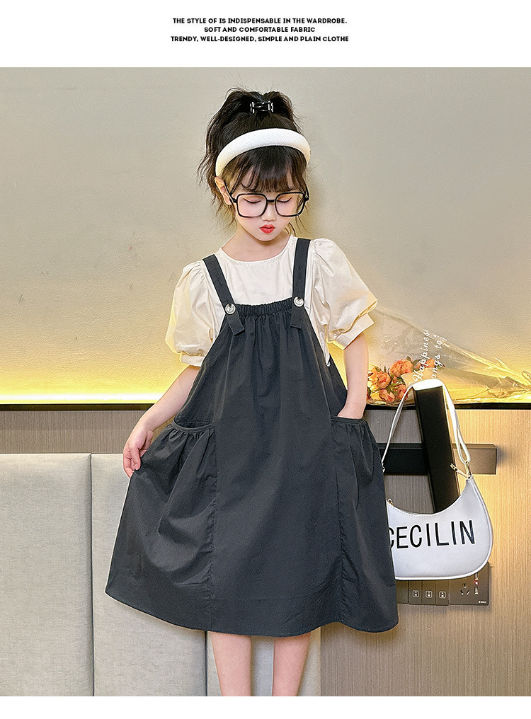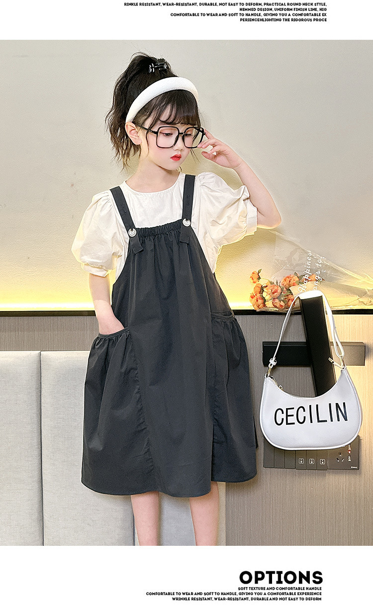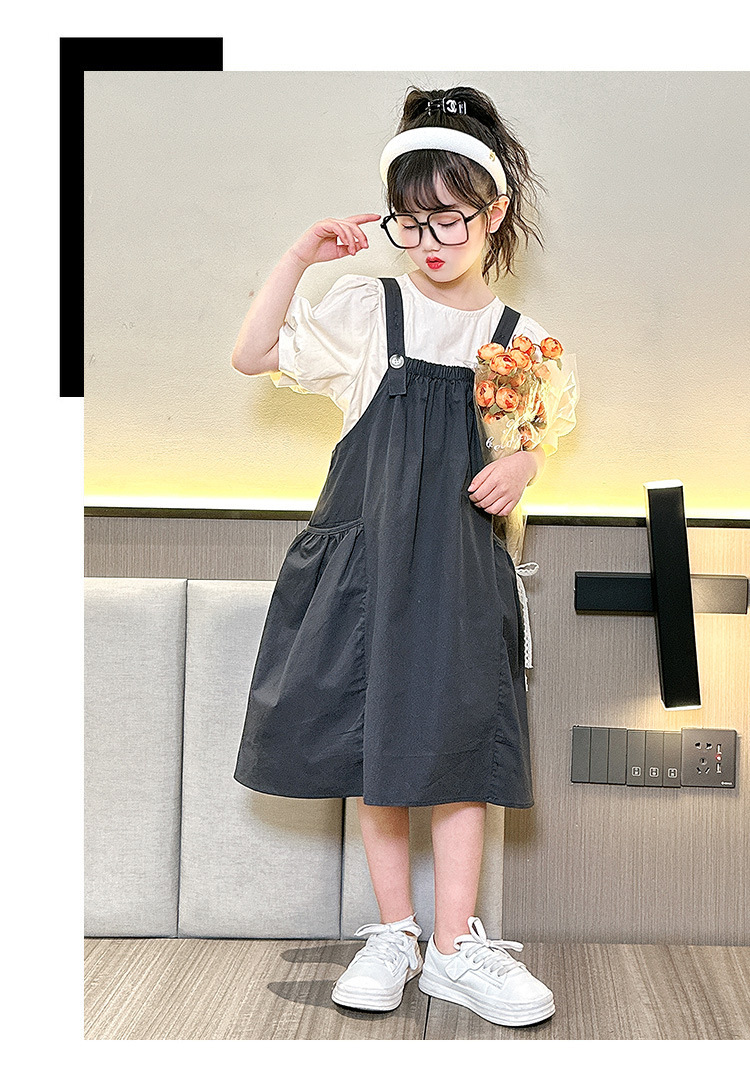 소녀 서스펜더 스커트 세트 2024 여름 새로운 중형 및 대형 어린이 외국인 원피스 퍼프 소매 티셔츠 투피스 아동복 8