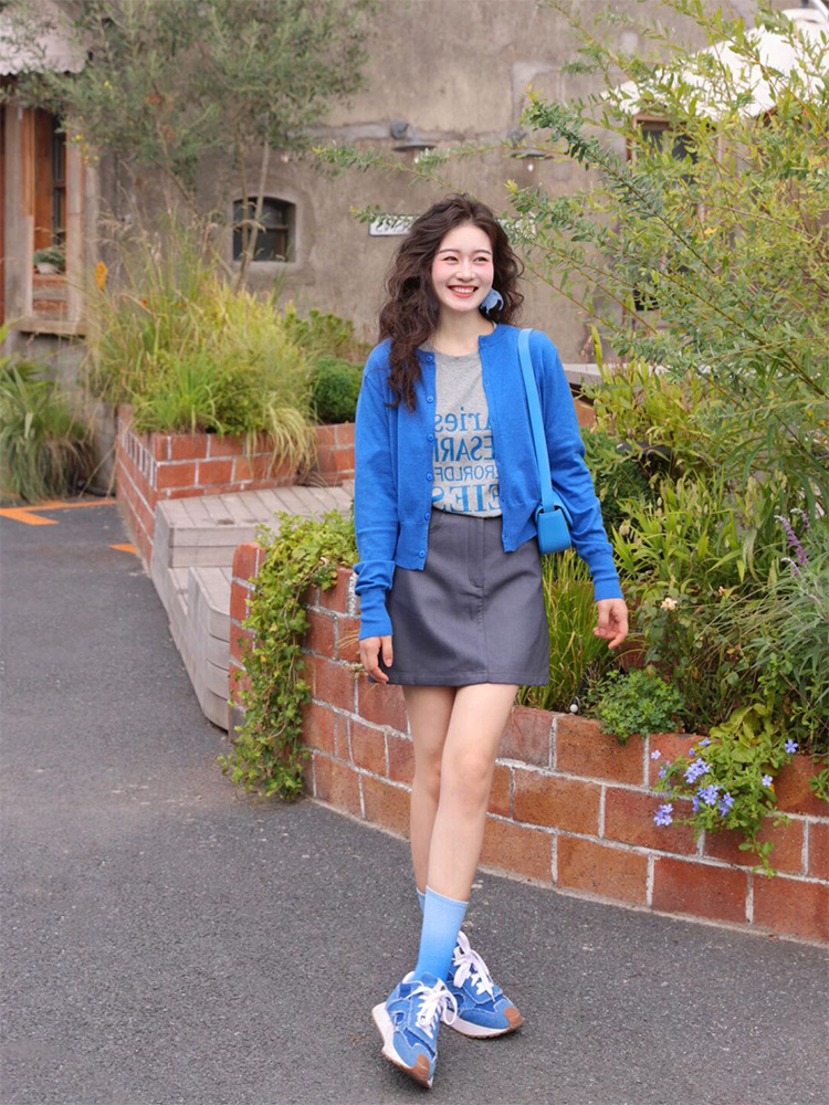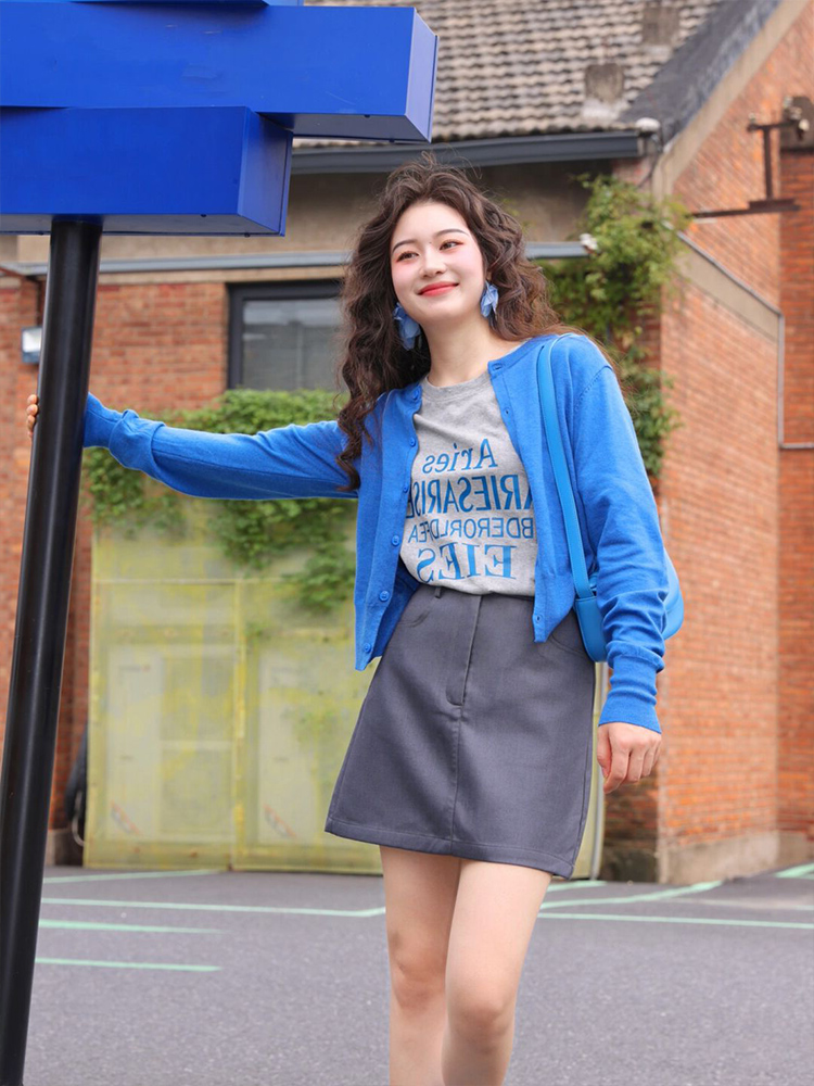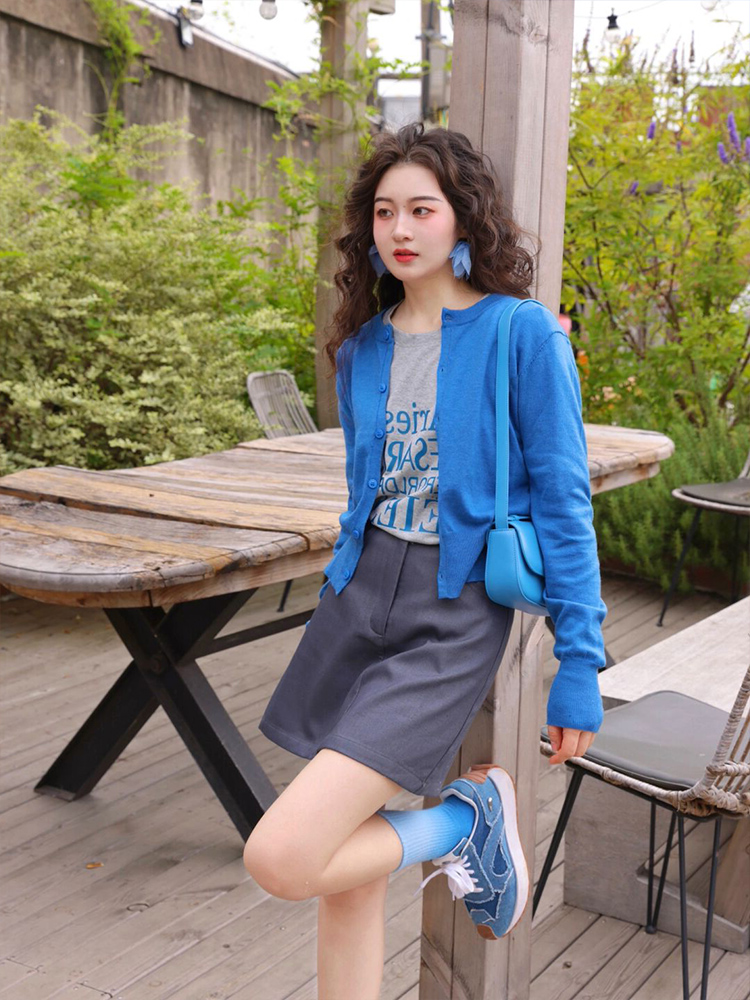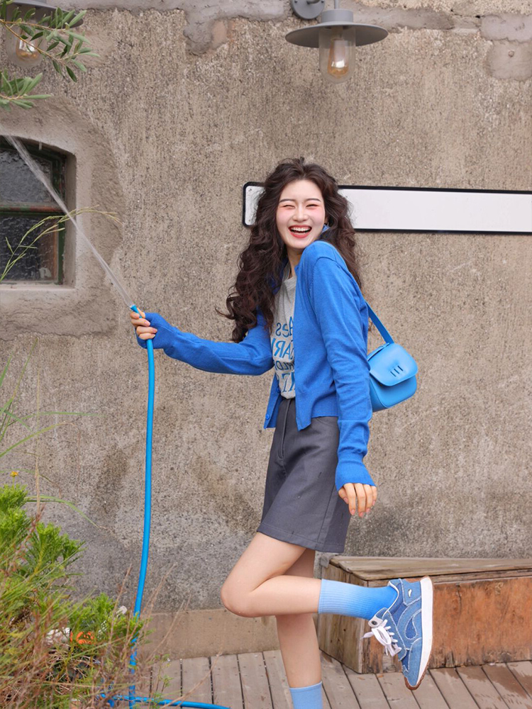 클라인 블루 짧은 니트 카디건 여성 이른 봄 24 새로운 얇은 외부 블라우스 작은 스웨터 코트스토어 가기
