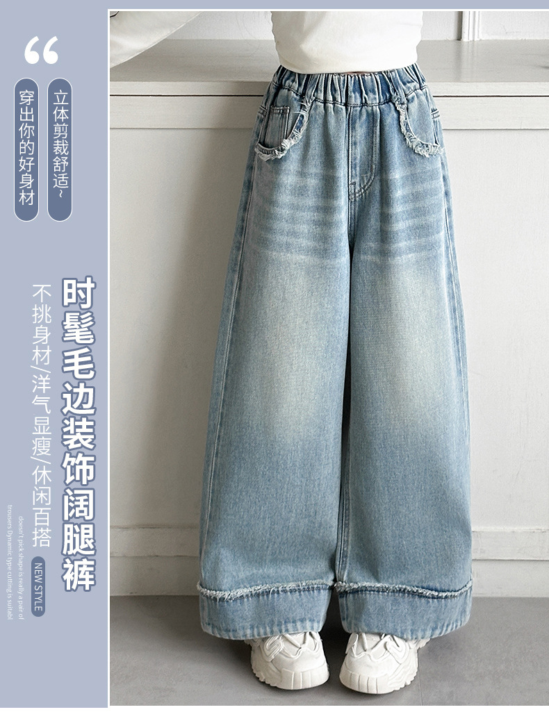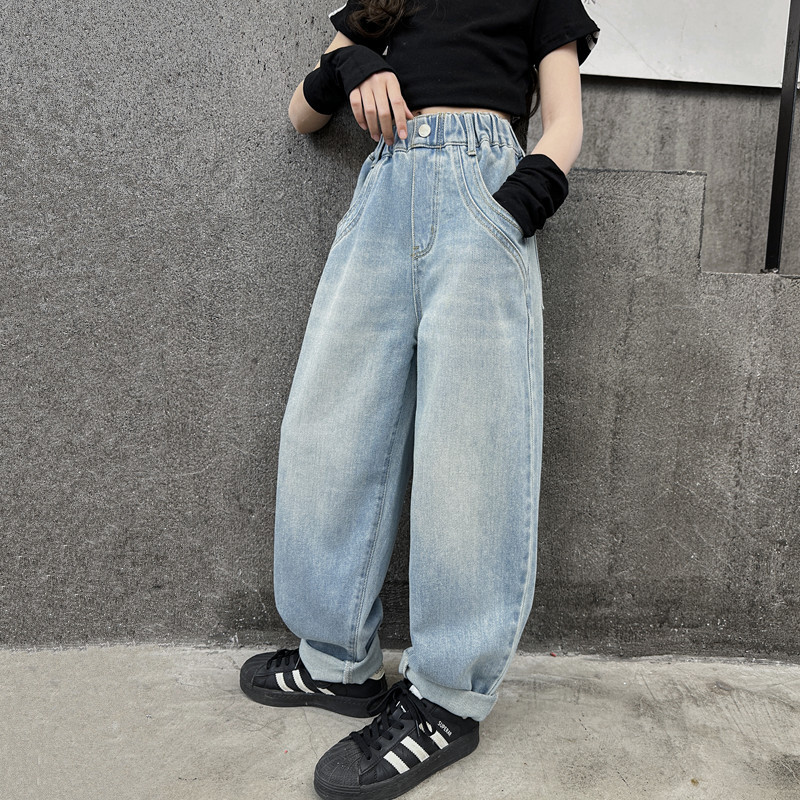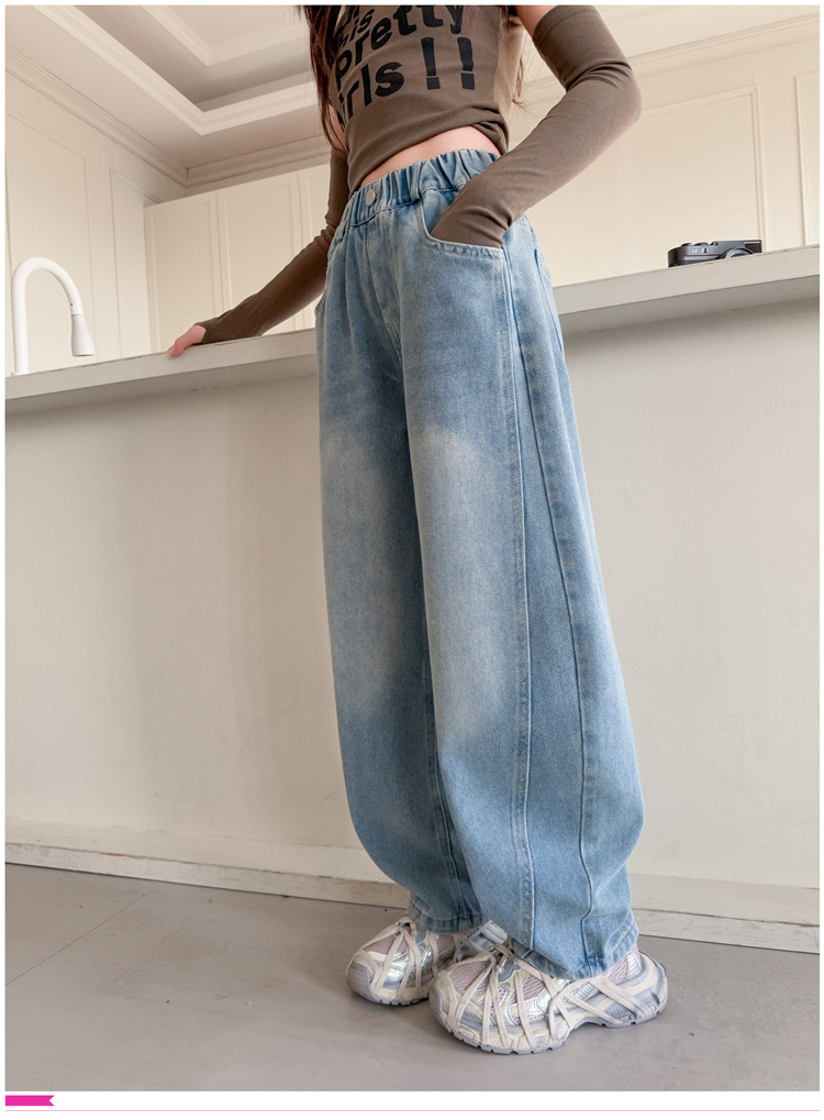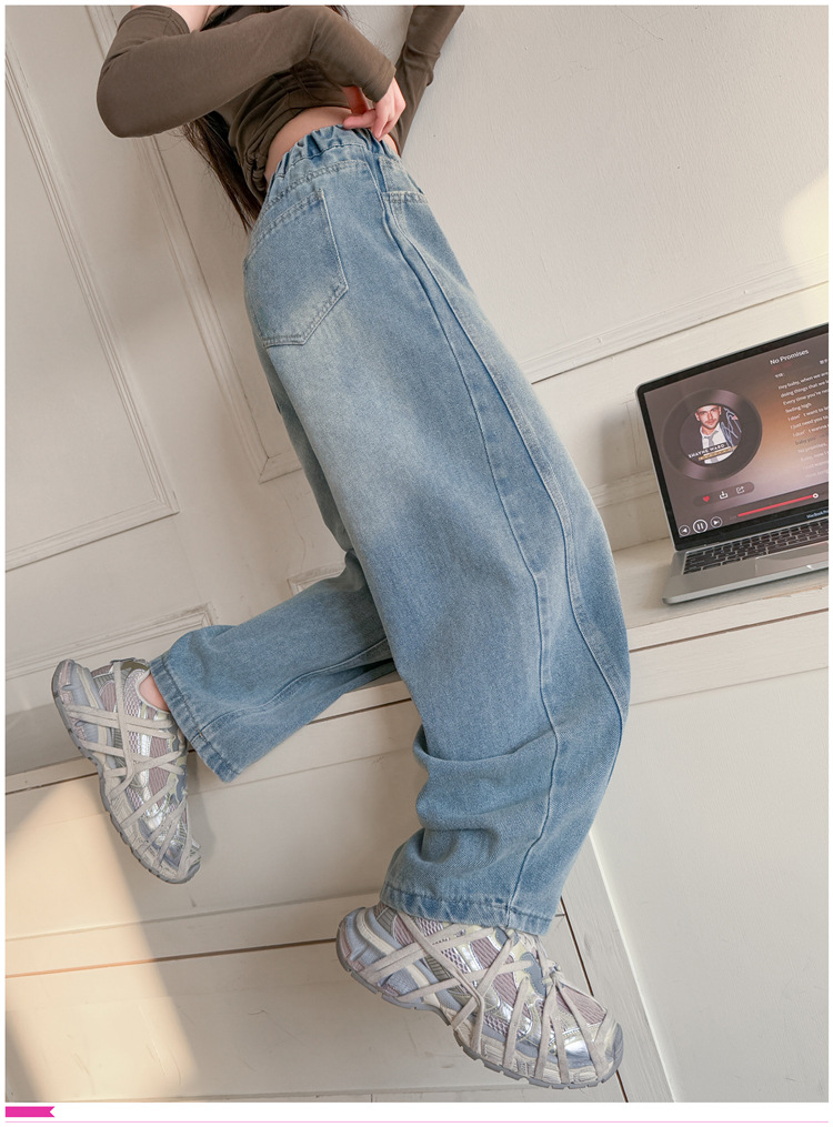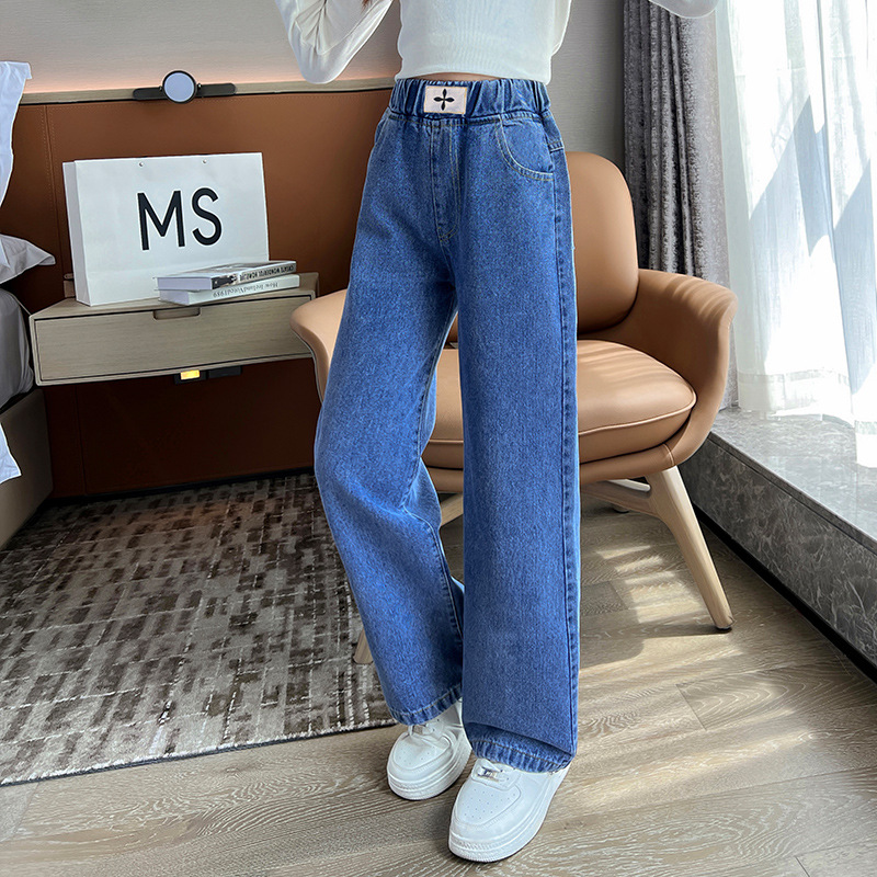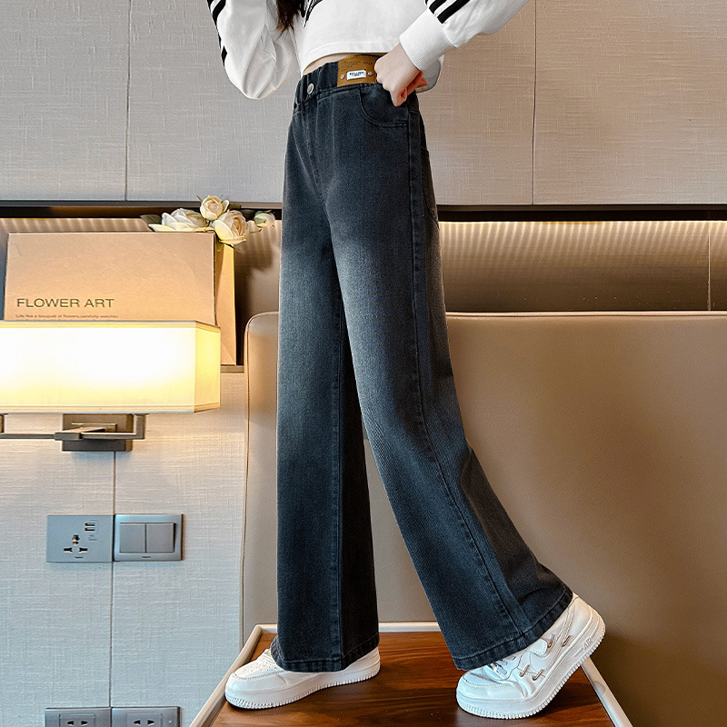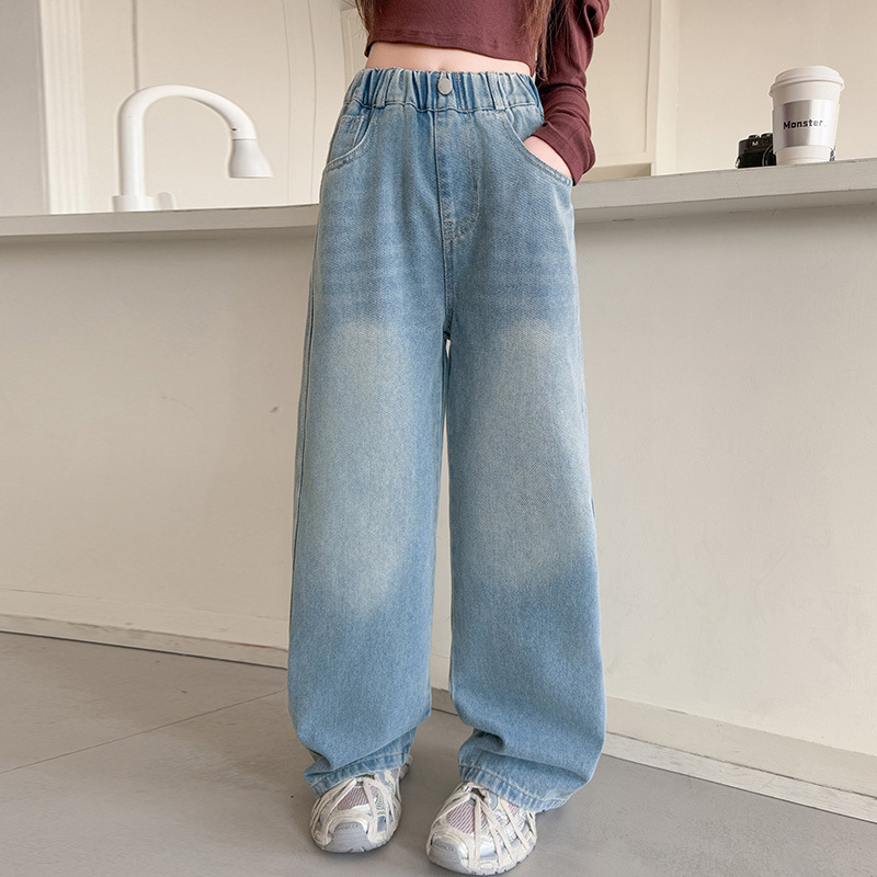 어린이 착용 소녀 스트레이트 다리 바지 어린이 넓은 다리 바지 2025 봄과 가을 새 스타일 데님 바지 중 · 대형 어린이와 소녀 용 바지