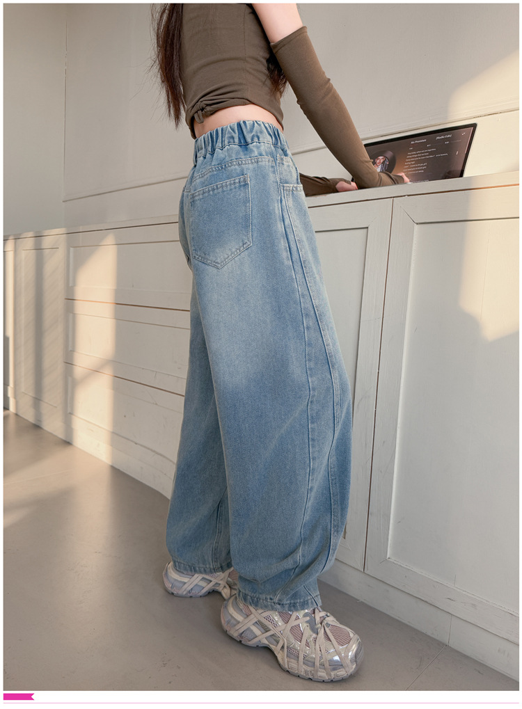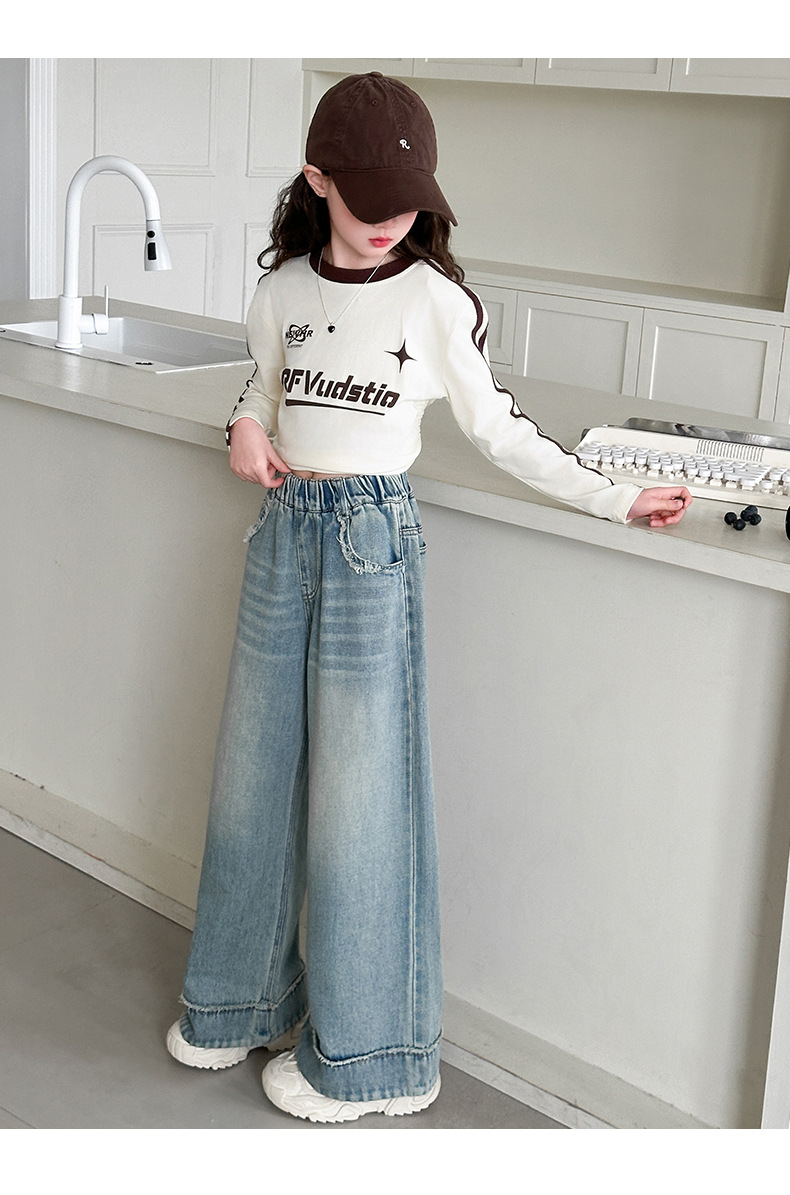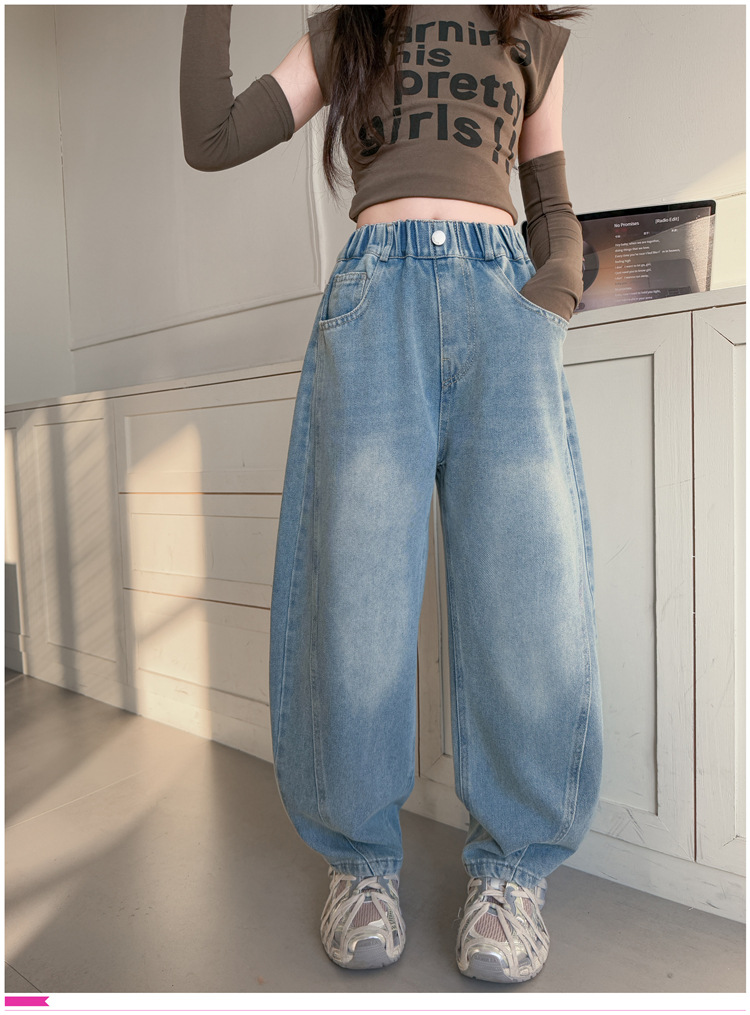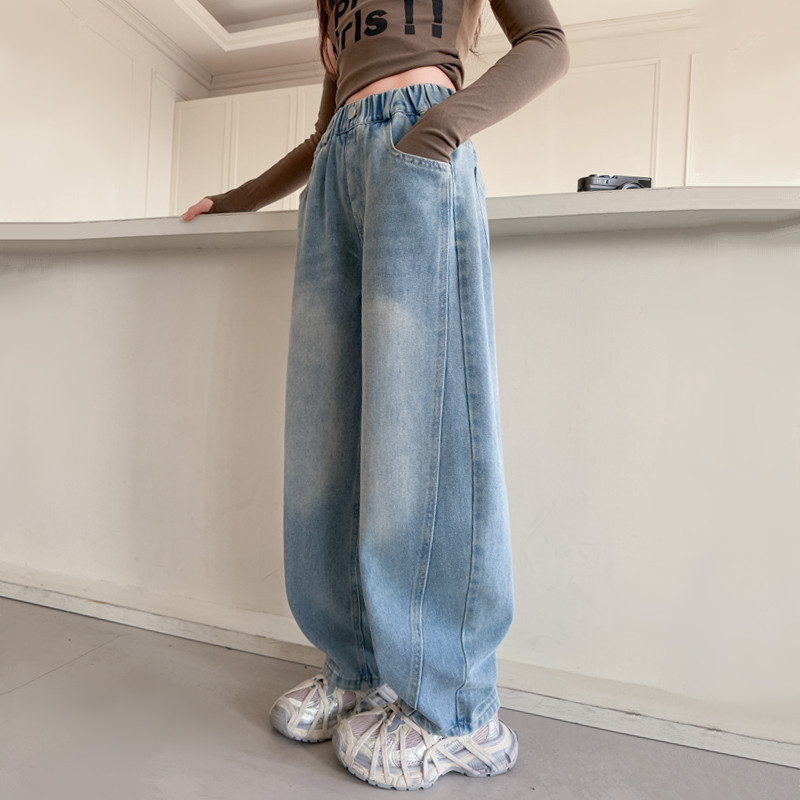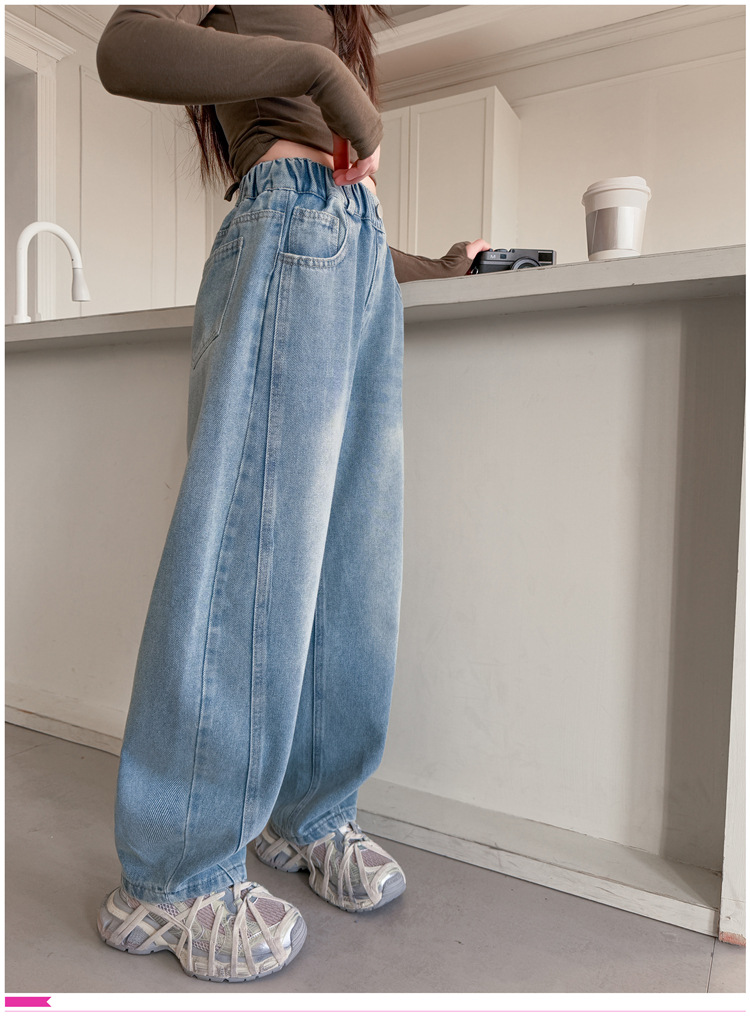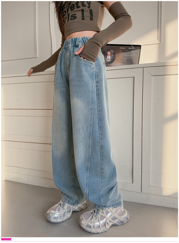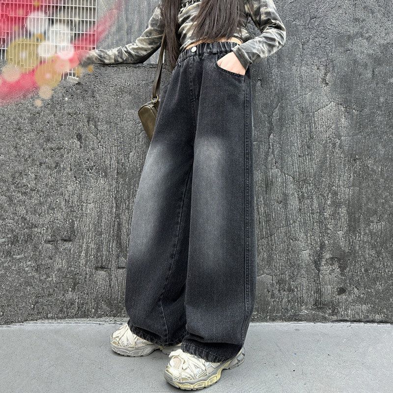 어린이 착용 소녀 스트레이트 다리 바지 어린이 넓은 다리 바지 2025 봄과 가을 새 스타일 데님 바지 중 · 대형 어린이와 소녀 용 바지