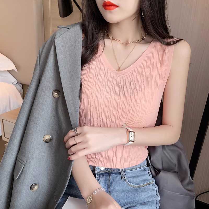 Camisole 여성용 겉옷 2024 여름 얇은 V 넥 슬림 핏 세트 내부 기본 아이스 실크 니트 탑