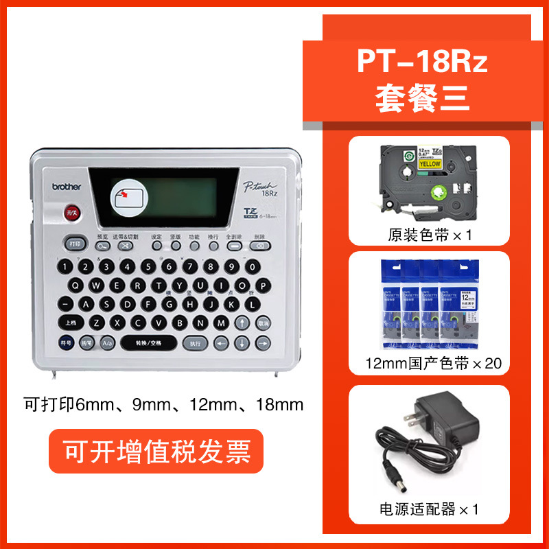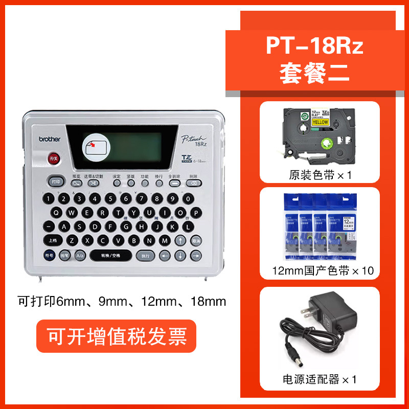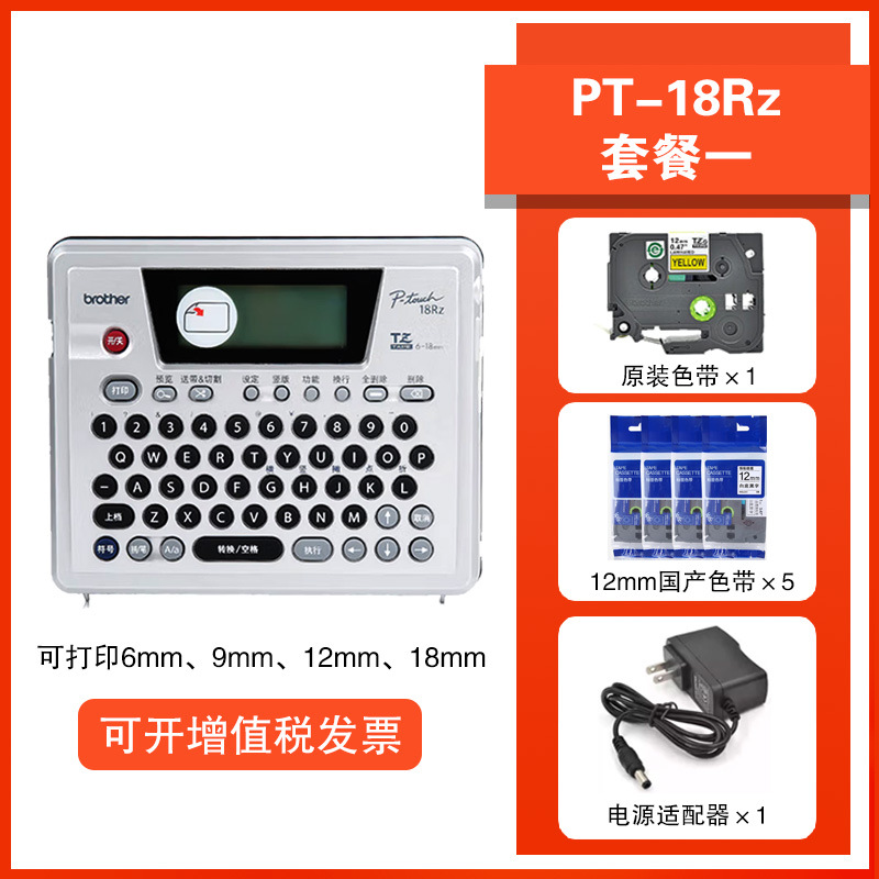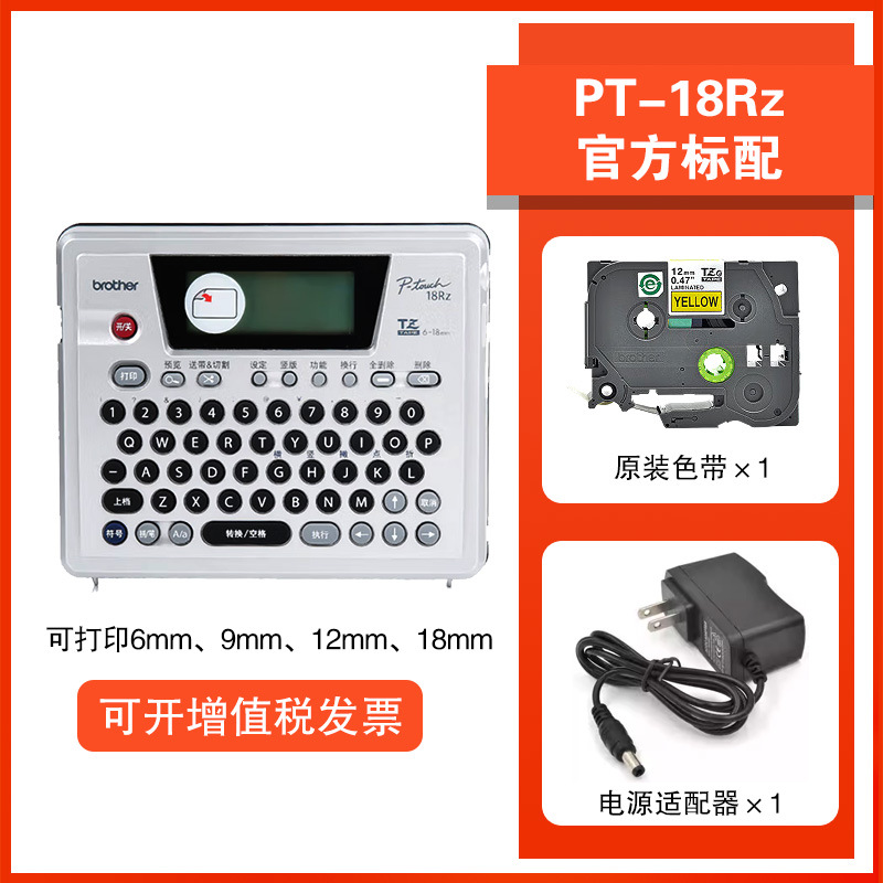 随机附件: CD-ROM光盘;TZe标签色带(1盒);电源适配器;Ni-MH可充电电池;充电底座;USB数据线;用户手册;保修证;便携式手提箱