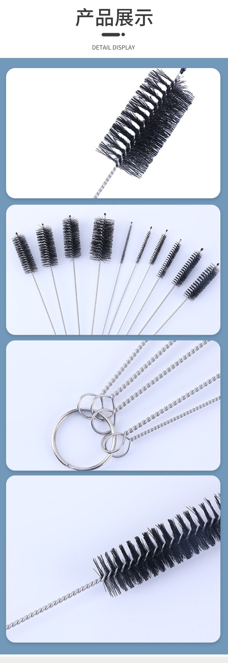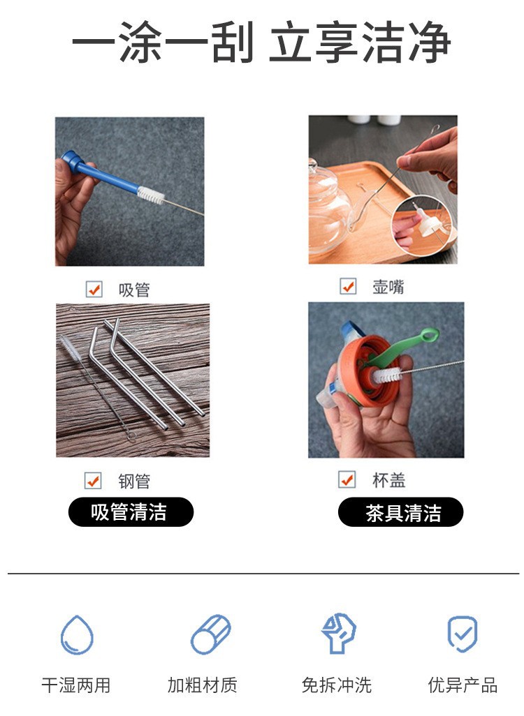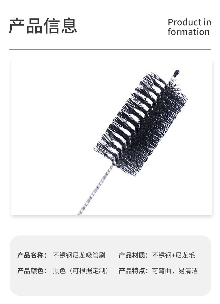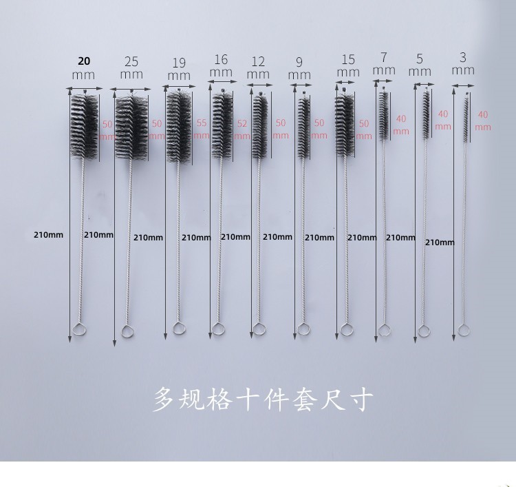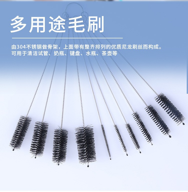 优势:多尺寸装不同尺寸,适合多容器使用,可做吸管刷 试管刷,工业用刷,奶瓶刷 杯刷 厨房清洁刷 多种不容刷的小容器都OK。产品是由304不锈钢和高密度尼龙毛刷丝精制而成,弹性好,不掉毛。不锈钢丝缠绕,不生锈,刷柄有弹性,不易变形。刷毛为各种尺寸可以非常方便的接触到任何容器,洗刷更干净。很容易清除吸管内的残留的污垢。实用性强,性价比高。
