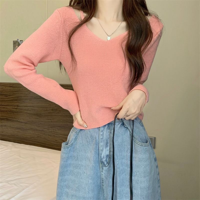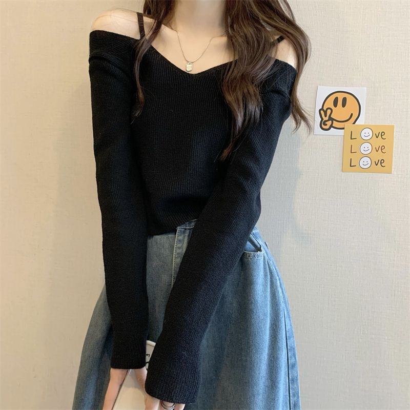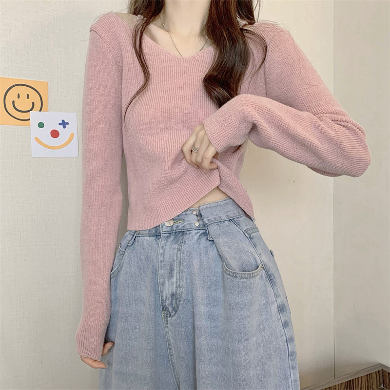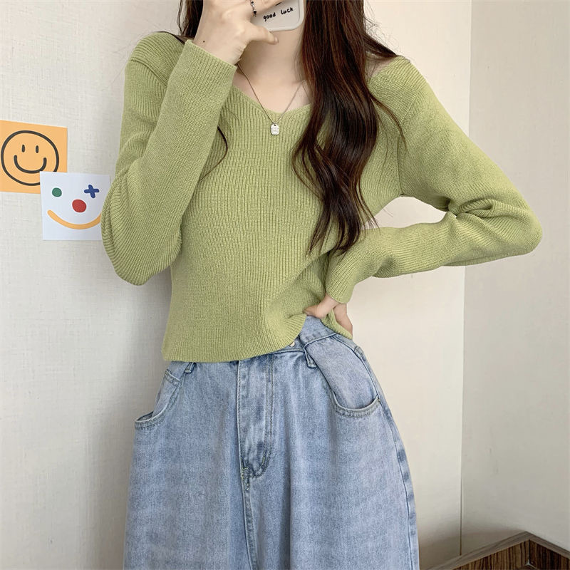 가을 새로운 긴팔 스웨터 여성의 V 넥 오프 숄더 슬림 핏 슬리밍 셔츠 단색 짧은 부드러운 누오 탑 여성스토어 가기