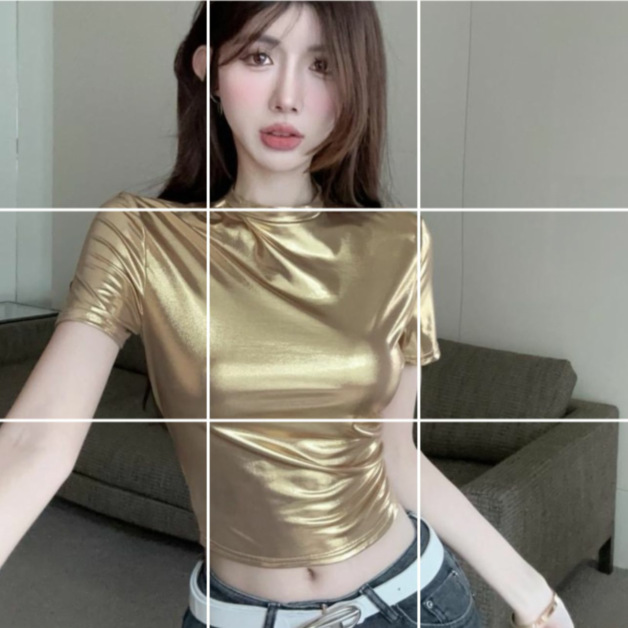 메탈 샤니 모켓 반팔 티셔츠 여성용 여름 섹시한 작은 탑 5178 골드 반짝이는 반소매 탑스토어 가기