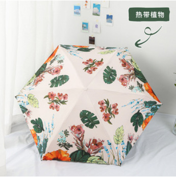 • 미니 수동 5단 6본 강화 블랙 코팅 우산 - 열대 식물 패턴