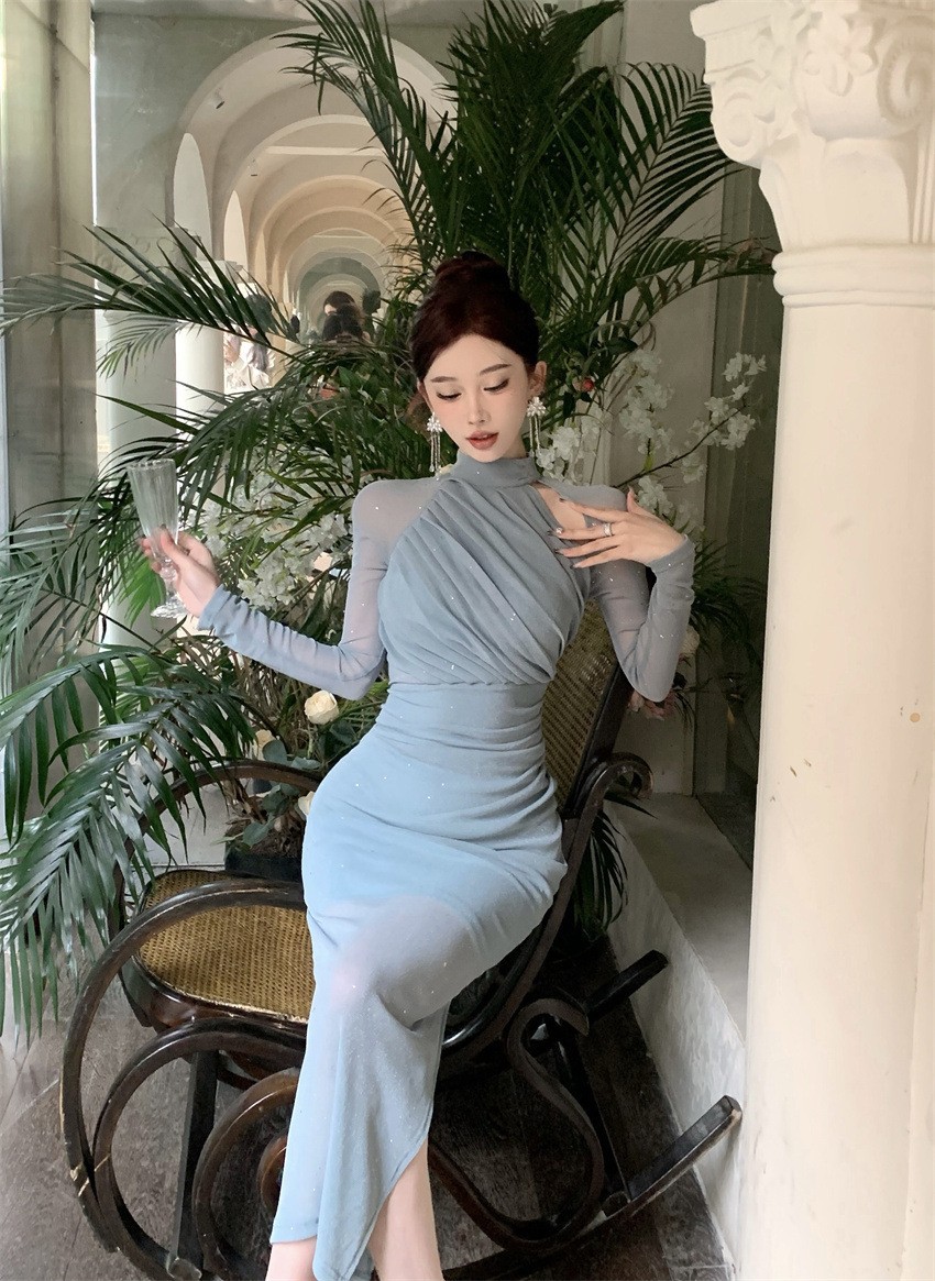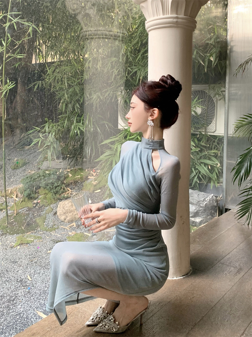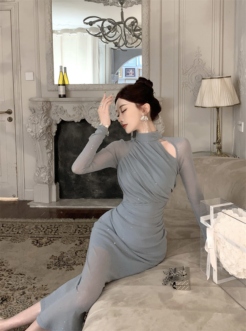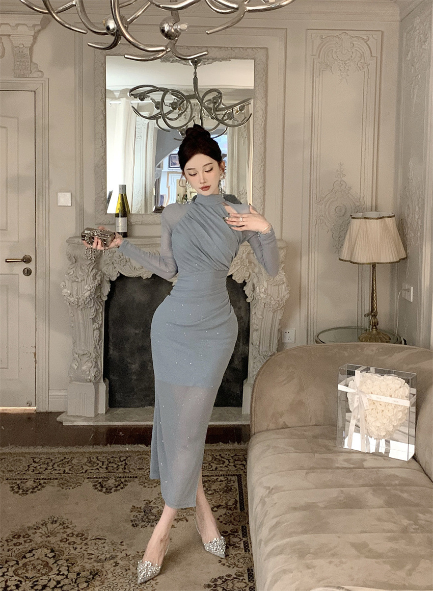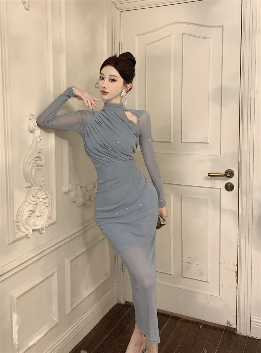 크로스보더 메쉬 시스루 원피스 2025 가을 신상 여성 슬림핏 디자인 주름 여성 펜슬 스커트