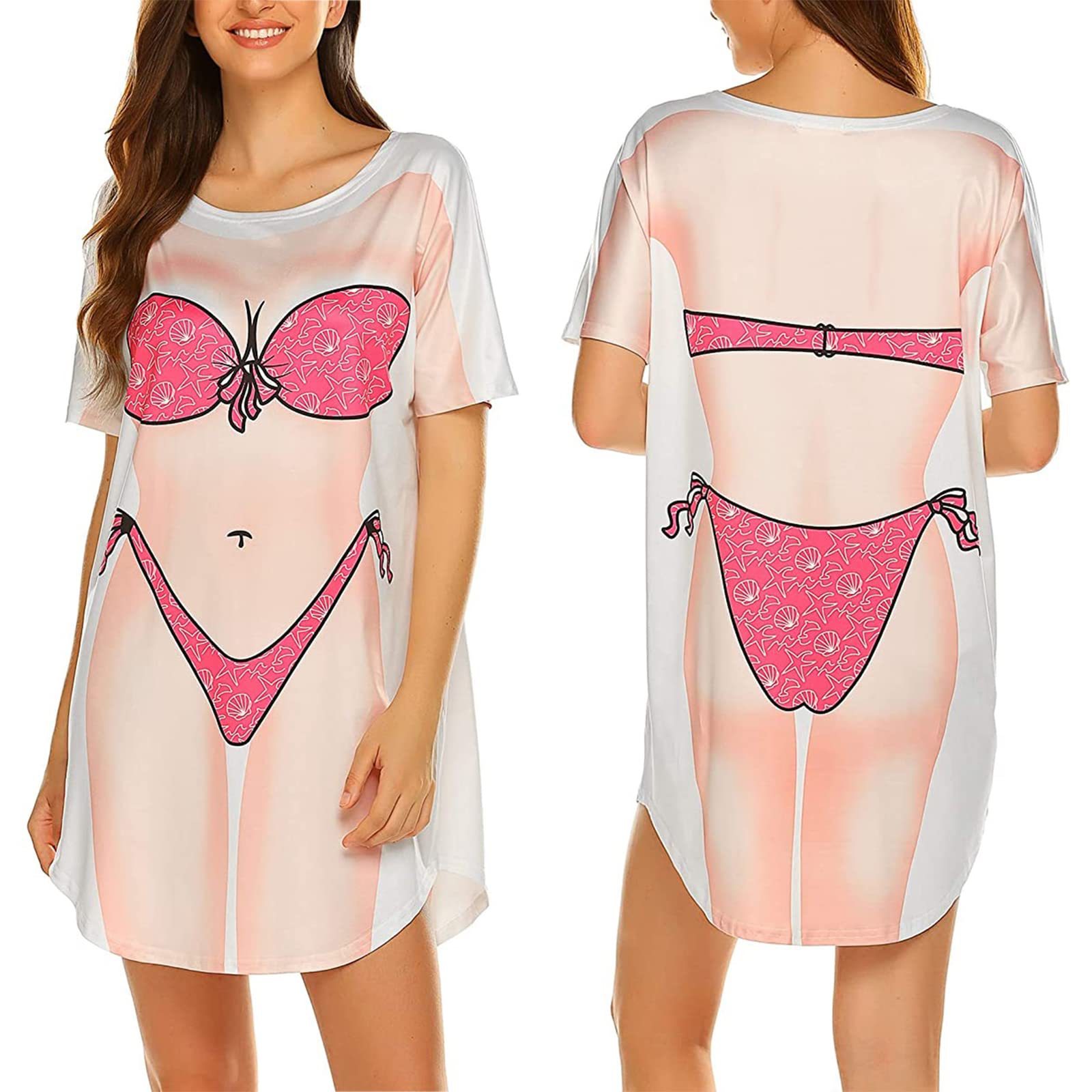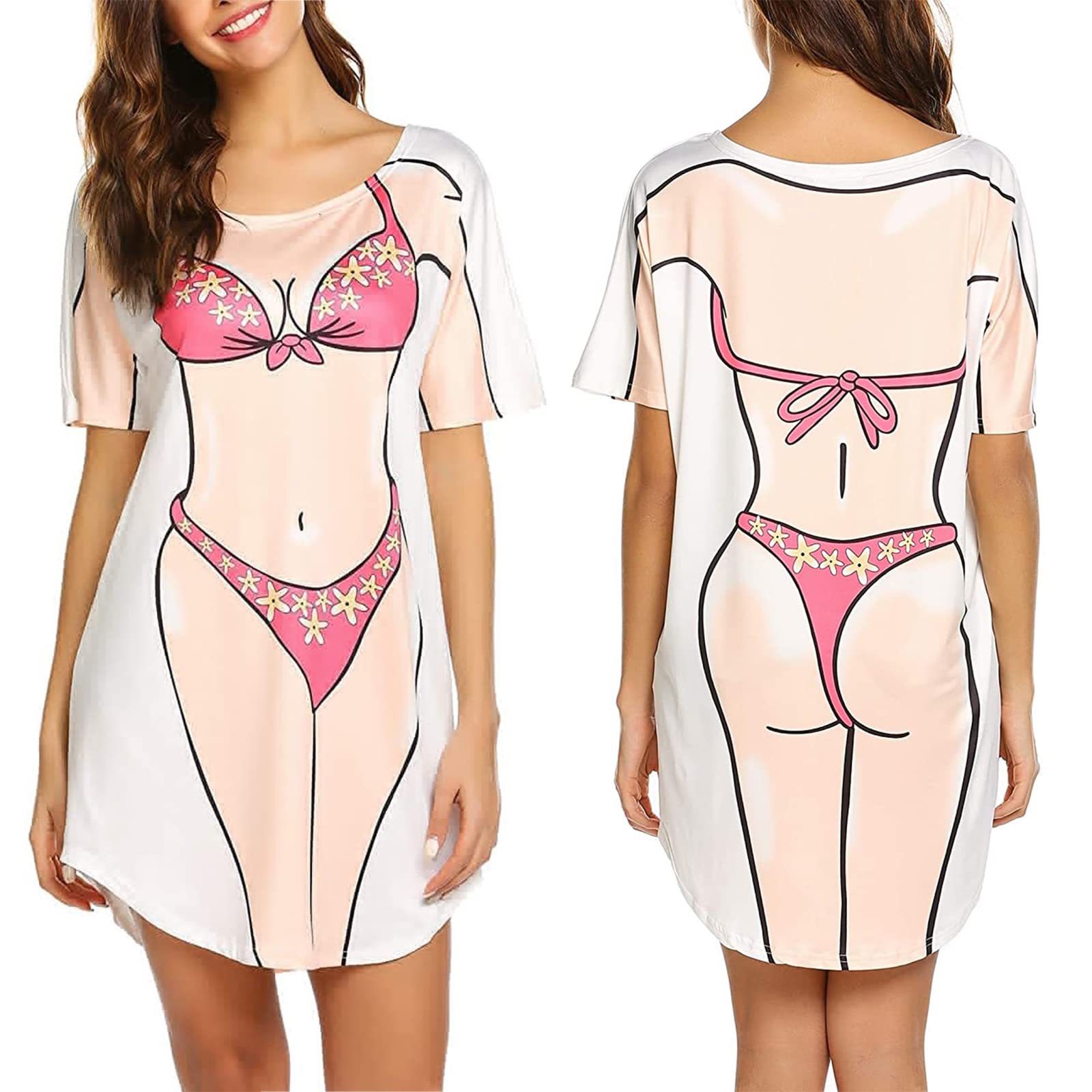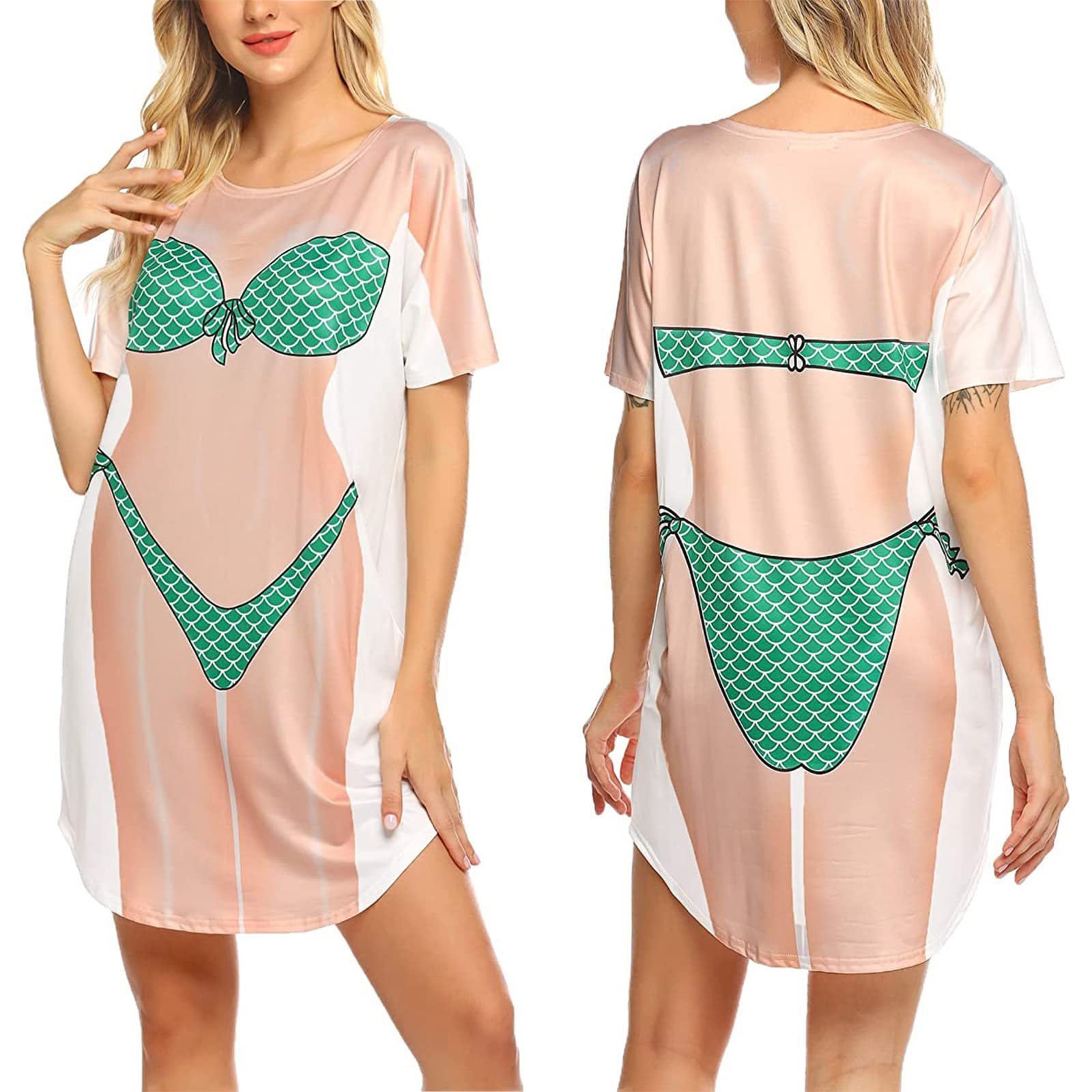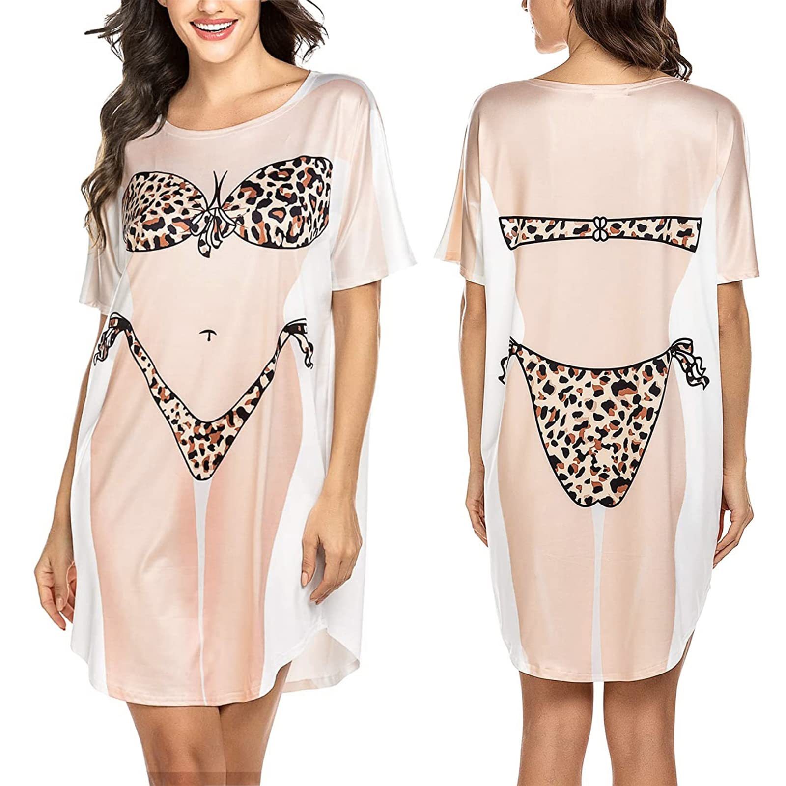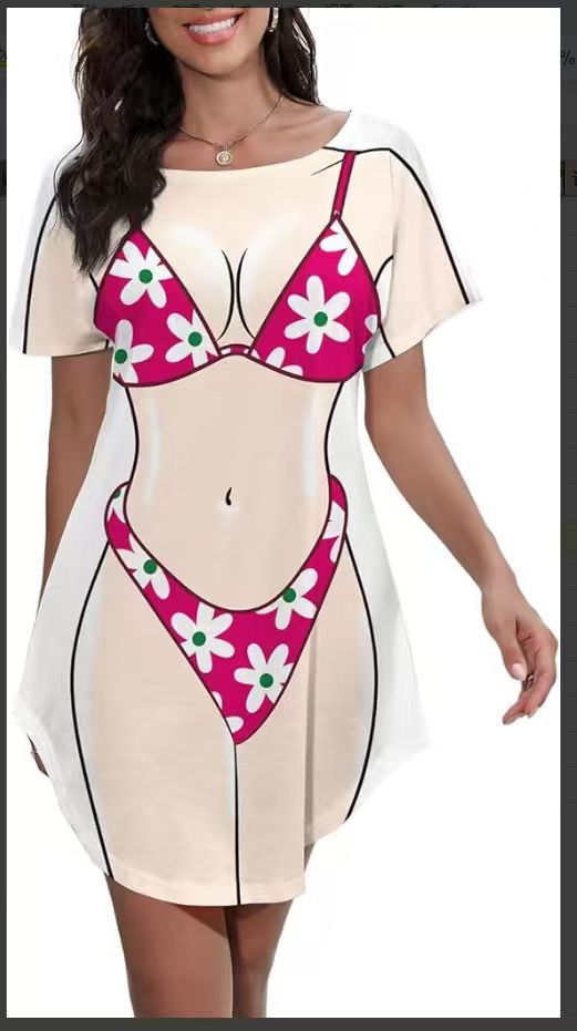 공장 직접 판매 여성의 새로운 여름 느슨한 최고 창조적 인 3D 비키니 인쇄 둥근 목 짧은 소매 원피스스토어 가기