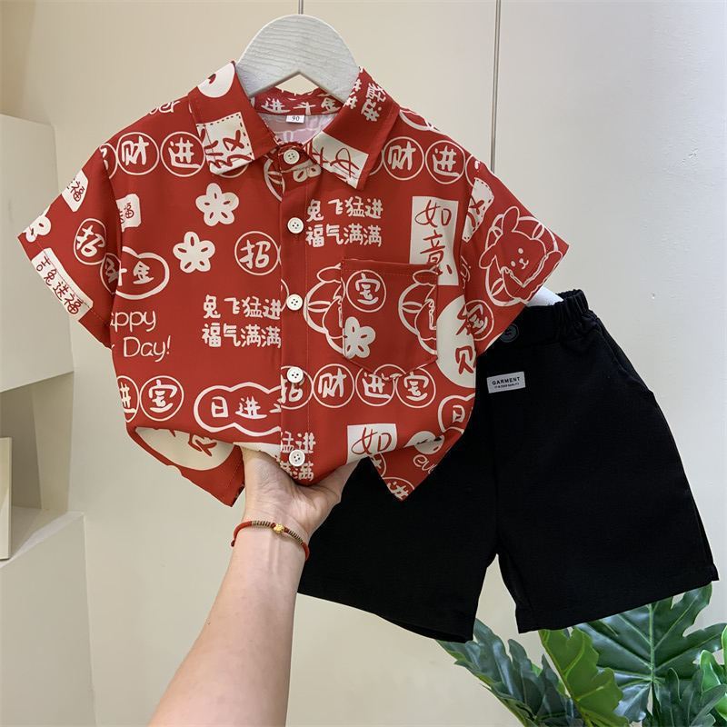 소년의 여름 셔츠 세트 2024 새로운 서양식 아기 반팔 셔츠 옷 어린이 여름 시원한 잘 생긴 투피스 세트