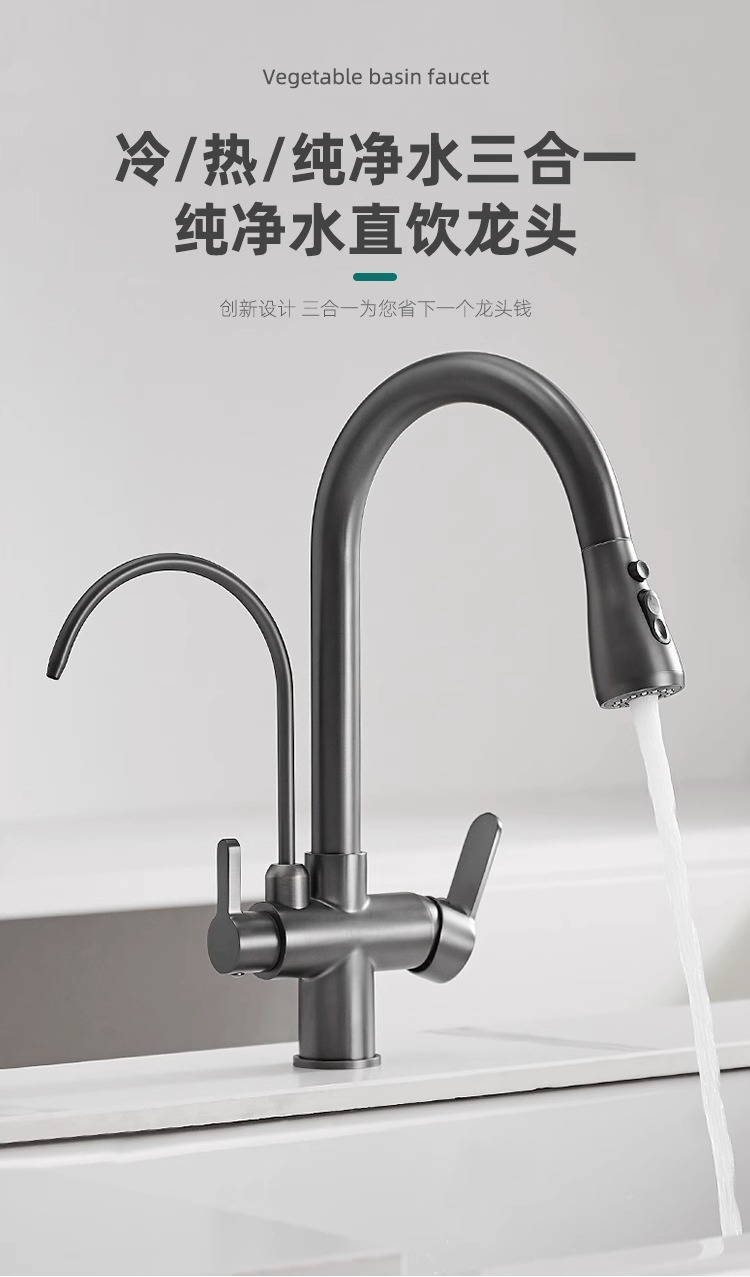 총 회색 주방 풀 아웃 3 대 1 정수기 수도꼭지 뜨겁고 차가운 이중 물 세척 분지 싱크대