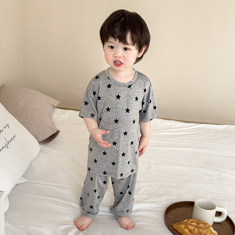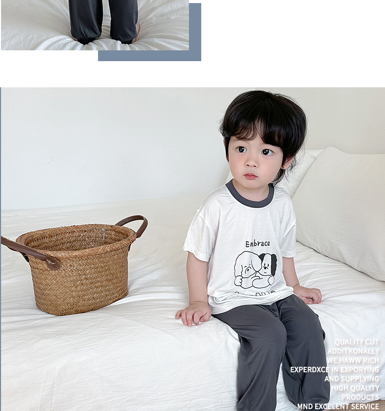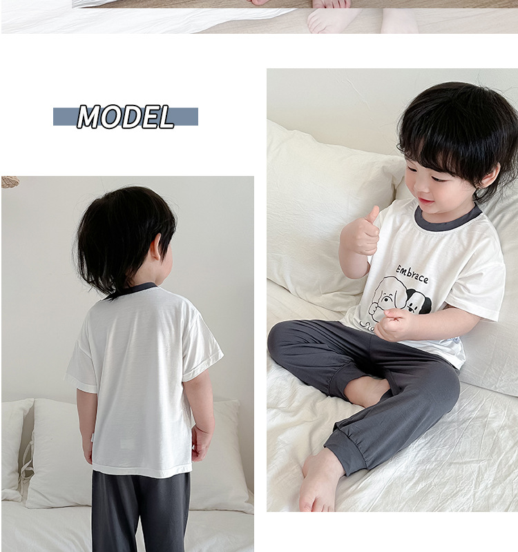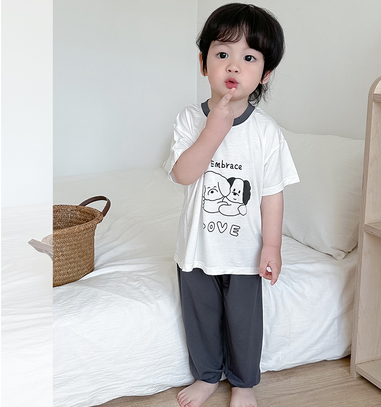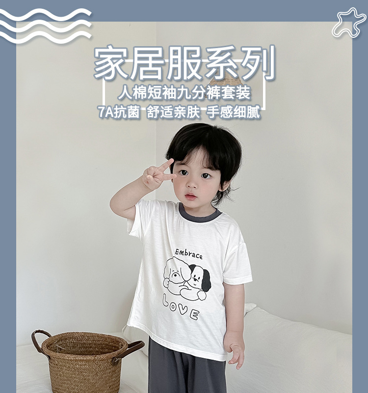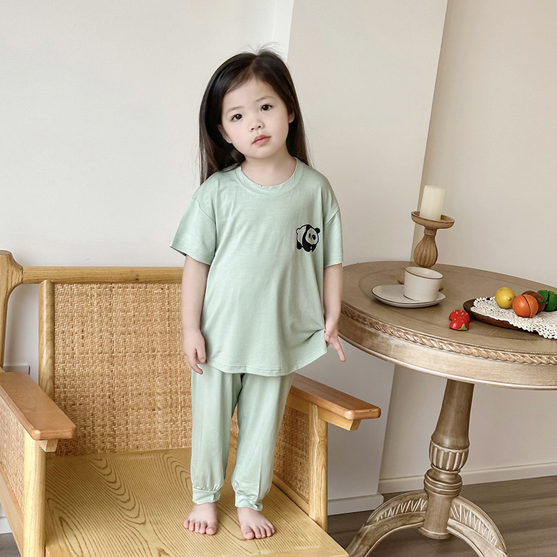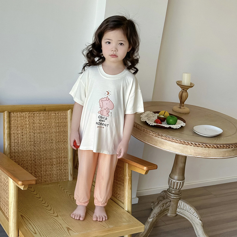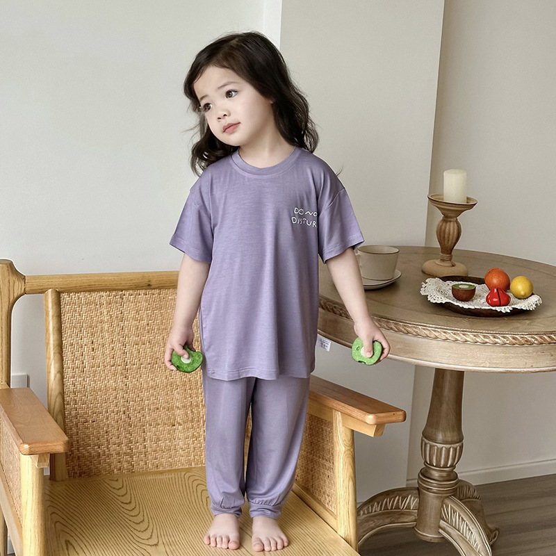 어린이 아이스 실크 코튼 파자마 소년 및 어린이 홈웨어 여름 소녀의 얇은 반소매 크롭 팬츠 세트 중 큰 어린이스토어 가기
