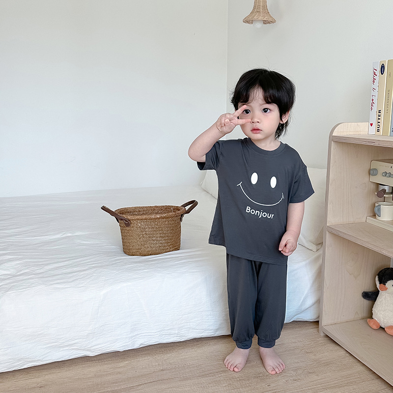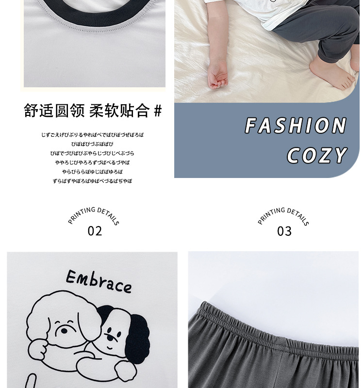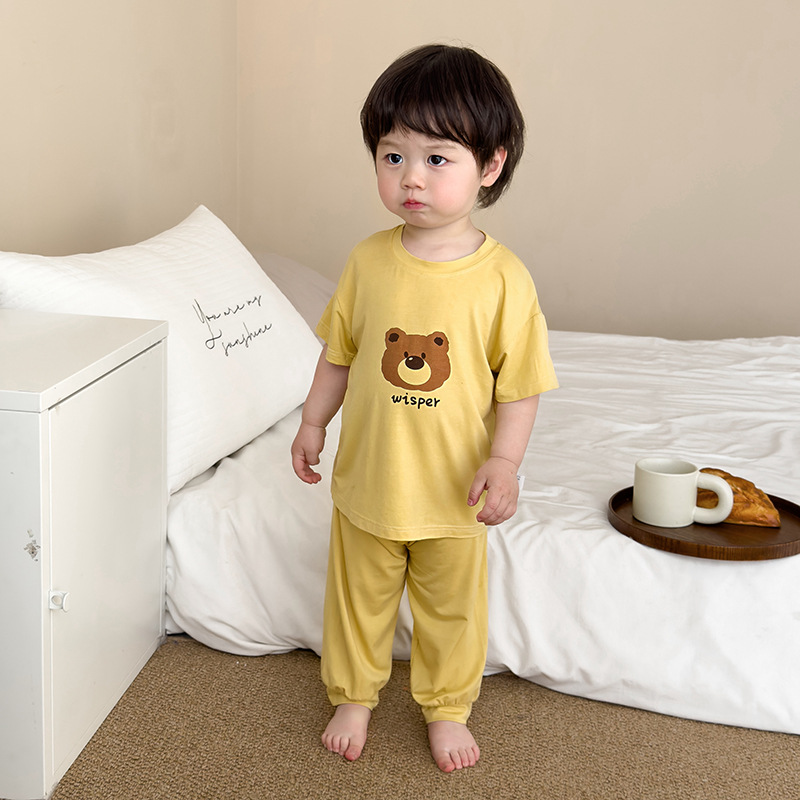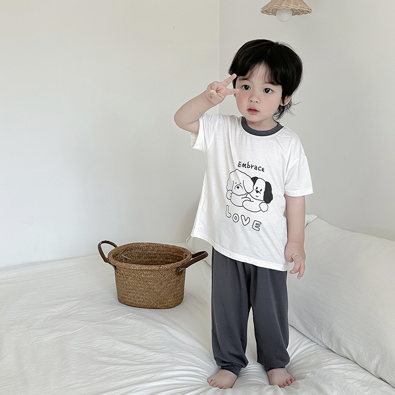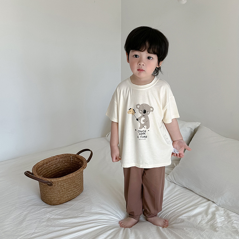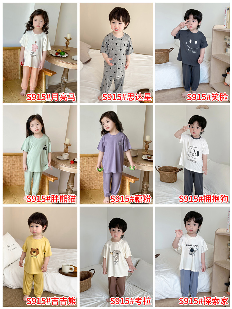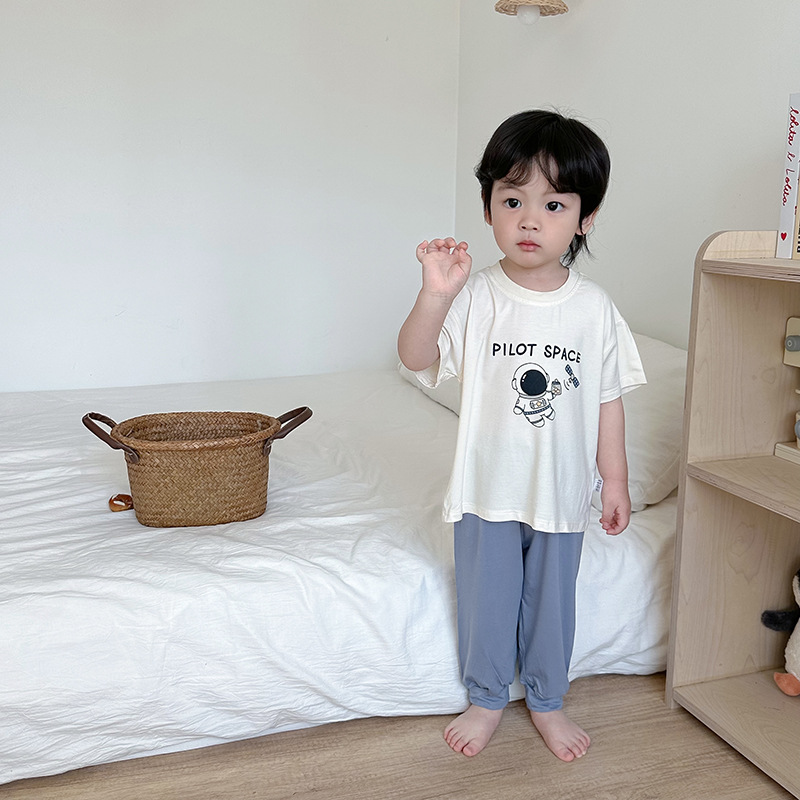 어린이 아이스 실크 코튼 파자마 소년 및 어린이 홈웨어 여름 소녀의 얇은 반소매 크롭 팬츠 세트 중 큰 어린이스토어 가기