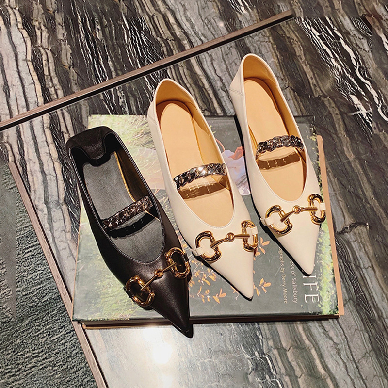 Cowhide 버전 ~ 프랑스 우아한 뾰족한 신발 2024 새로운 체인 금속 버클 얕은 입 가죽 싱글 레이어 신발 여성용 패션스토어 가기